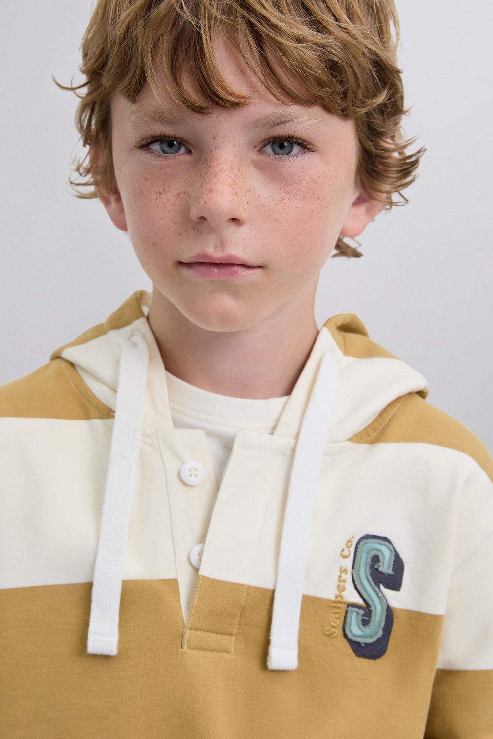 Sweatshirt with adjustable drawstring hood, made of 100% BCI cotton. Stripe print. Embroidered motif on chest and skull on back. Half neck with front button.