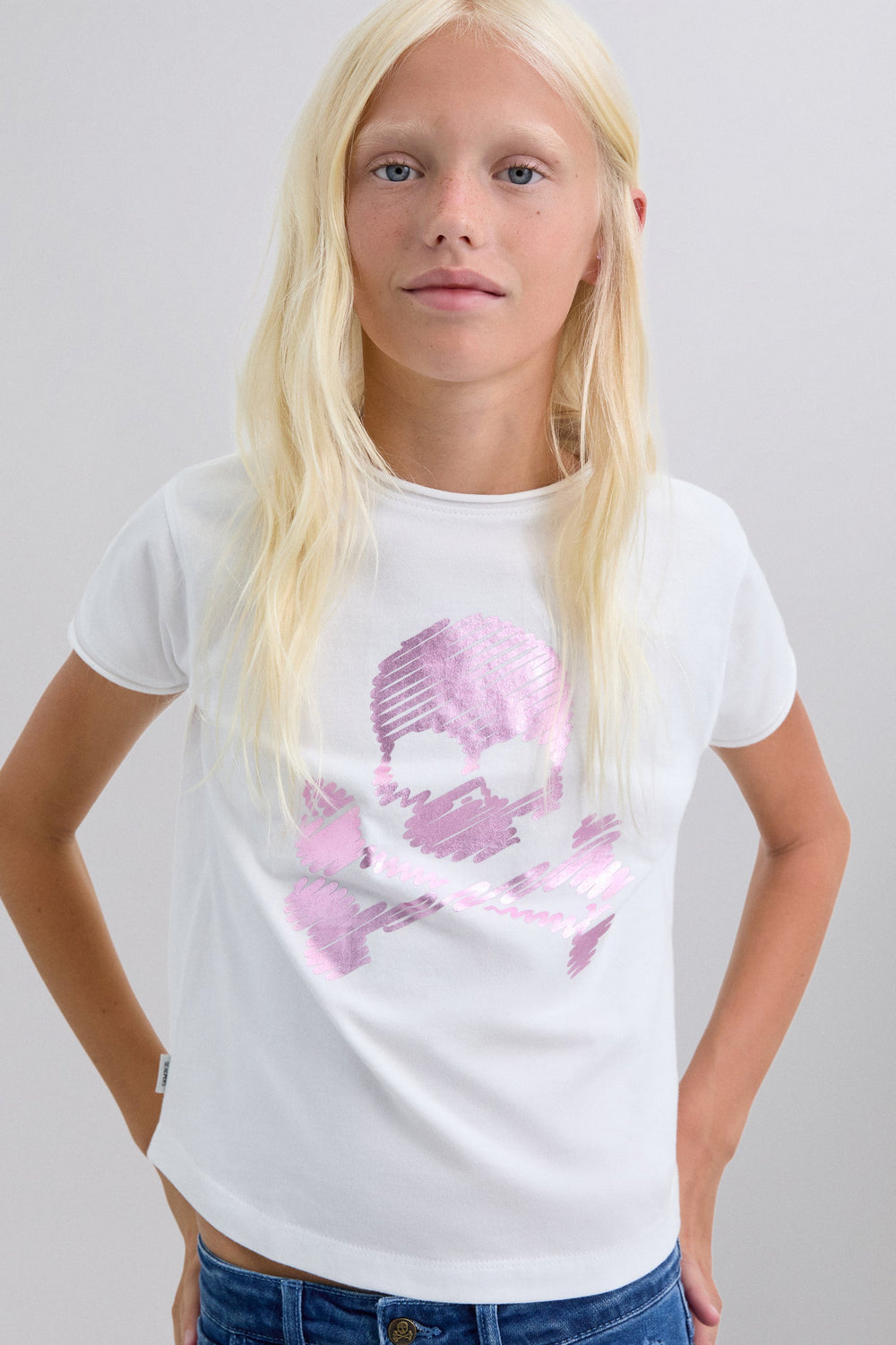 T-shirt made of 100% BCI cotton. Short sleeve. Round neck. Reflective print on front. Embroidery on back of neck. Label detail on the side.