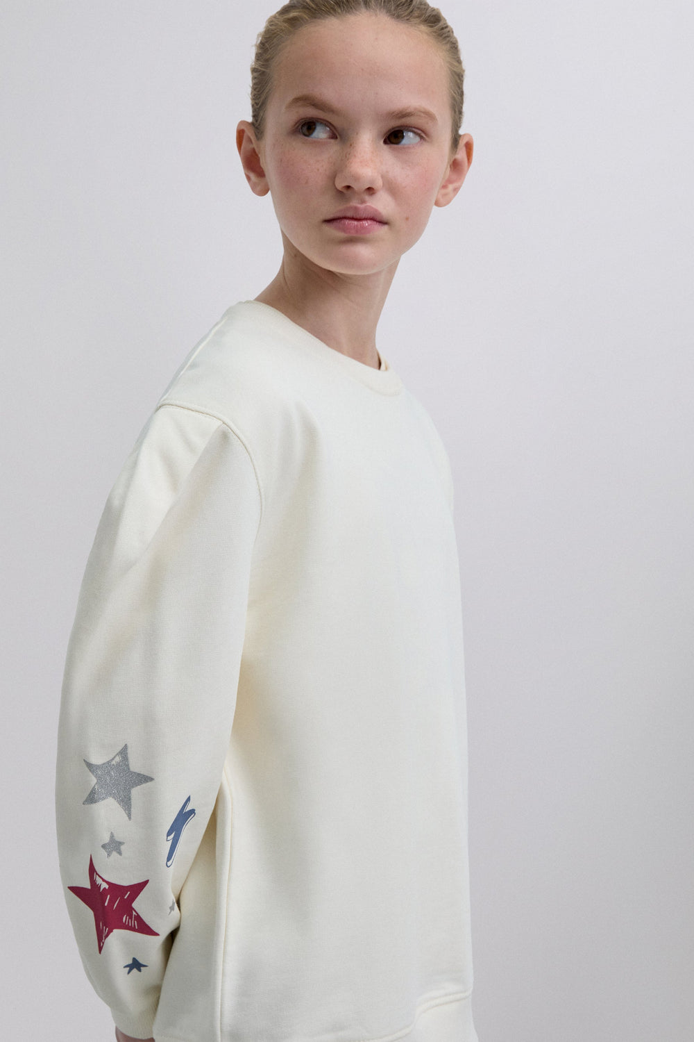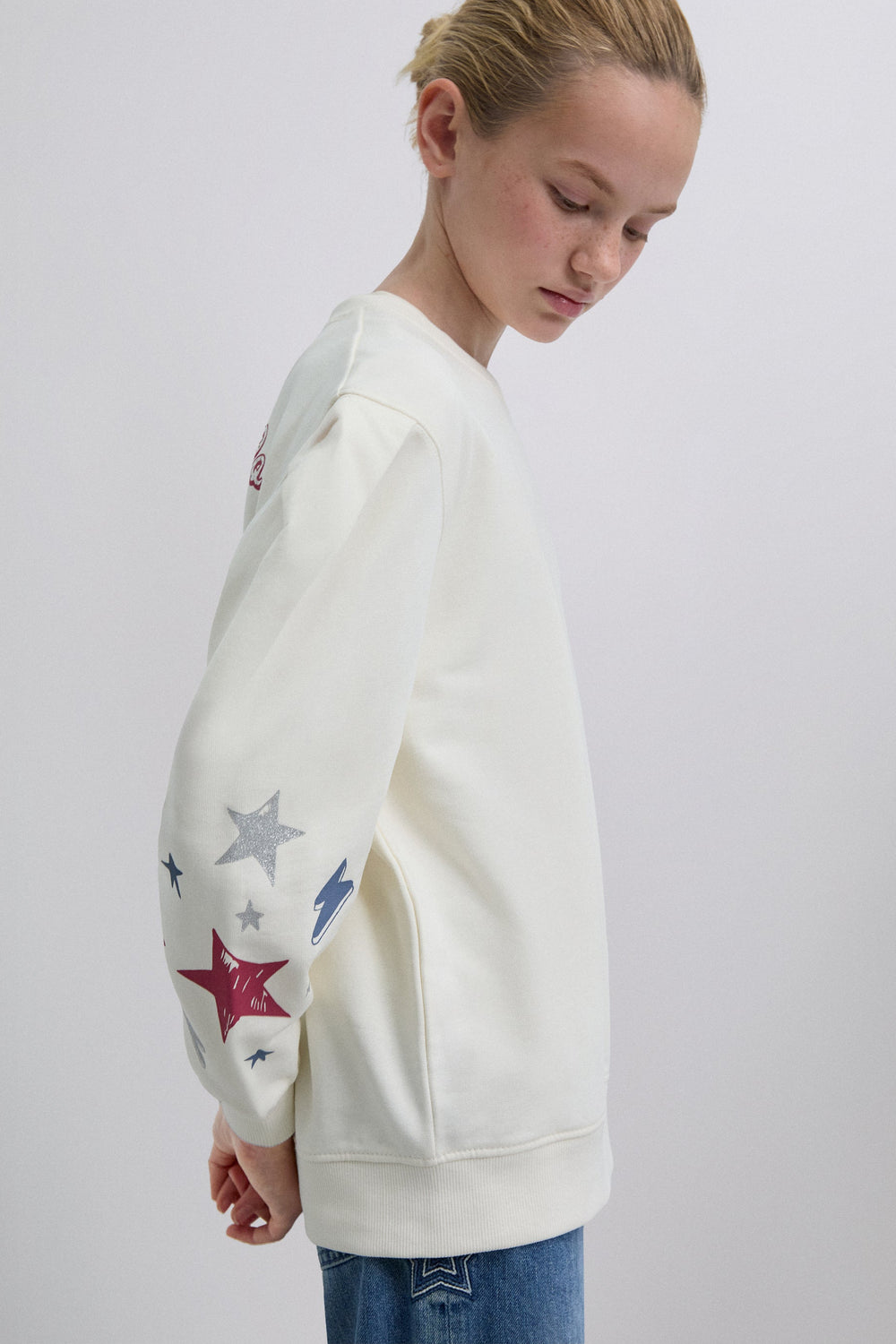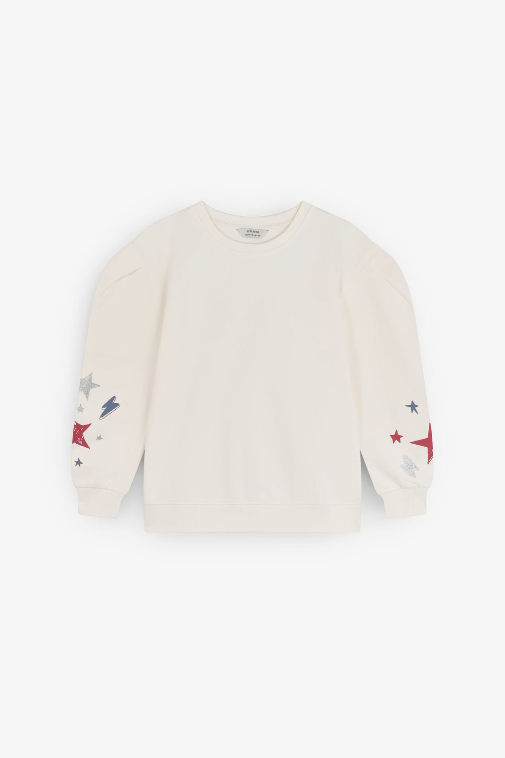 Sweatshirt made of 100% BCI cotton. Slightly puffed long sleeves. Round neck. Ribbed trim. Printed on sleeves and back.
