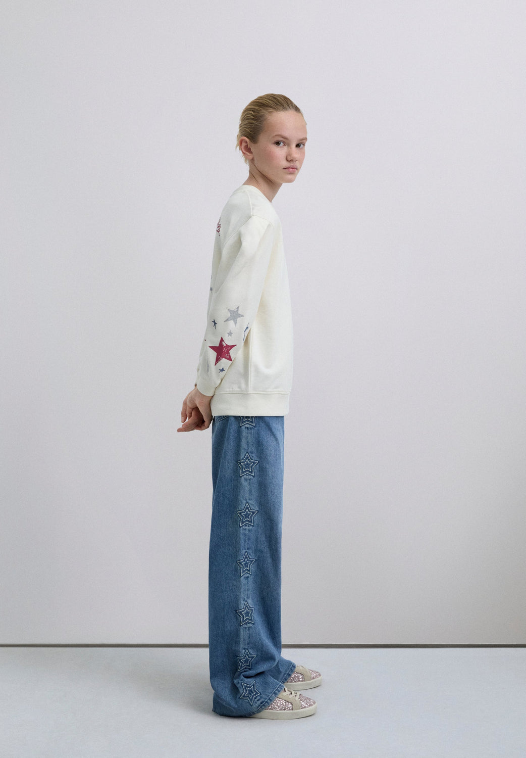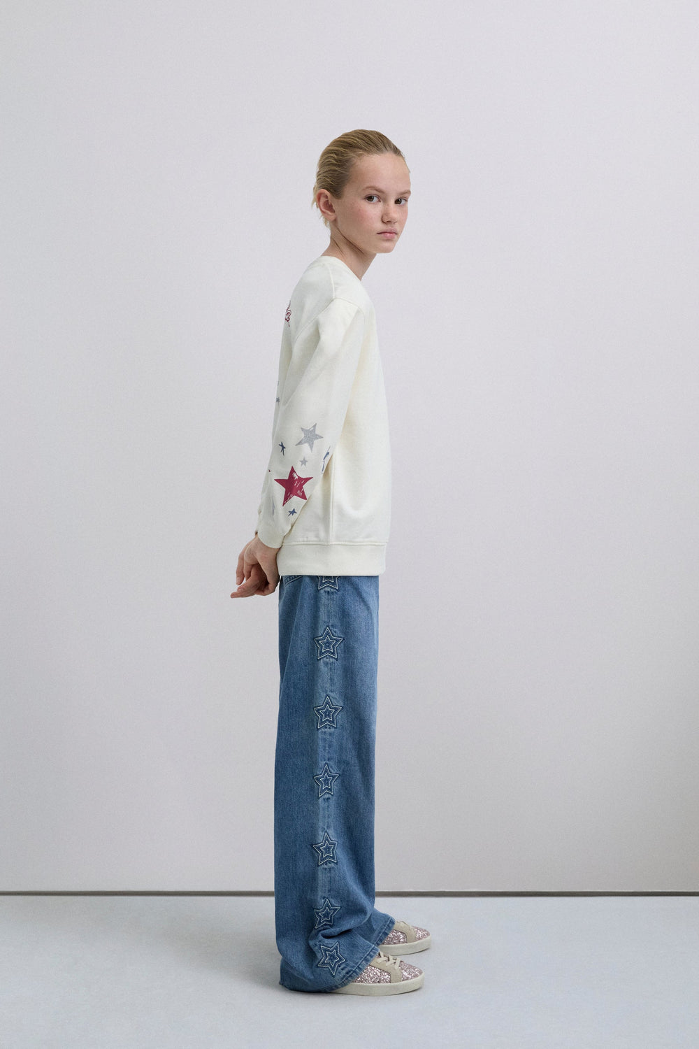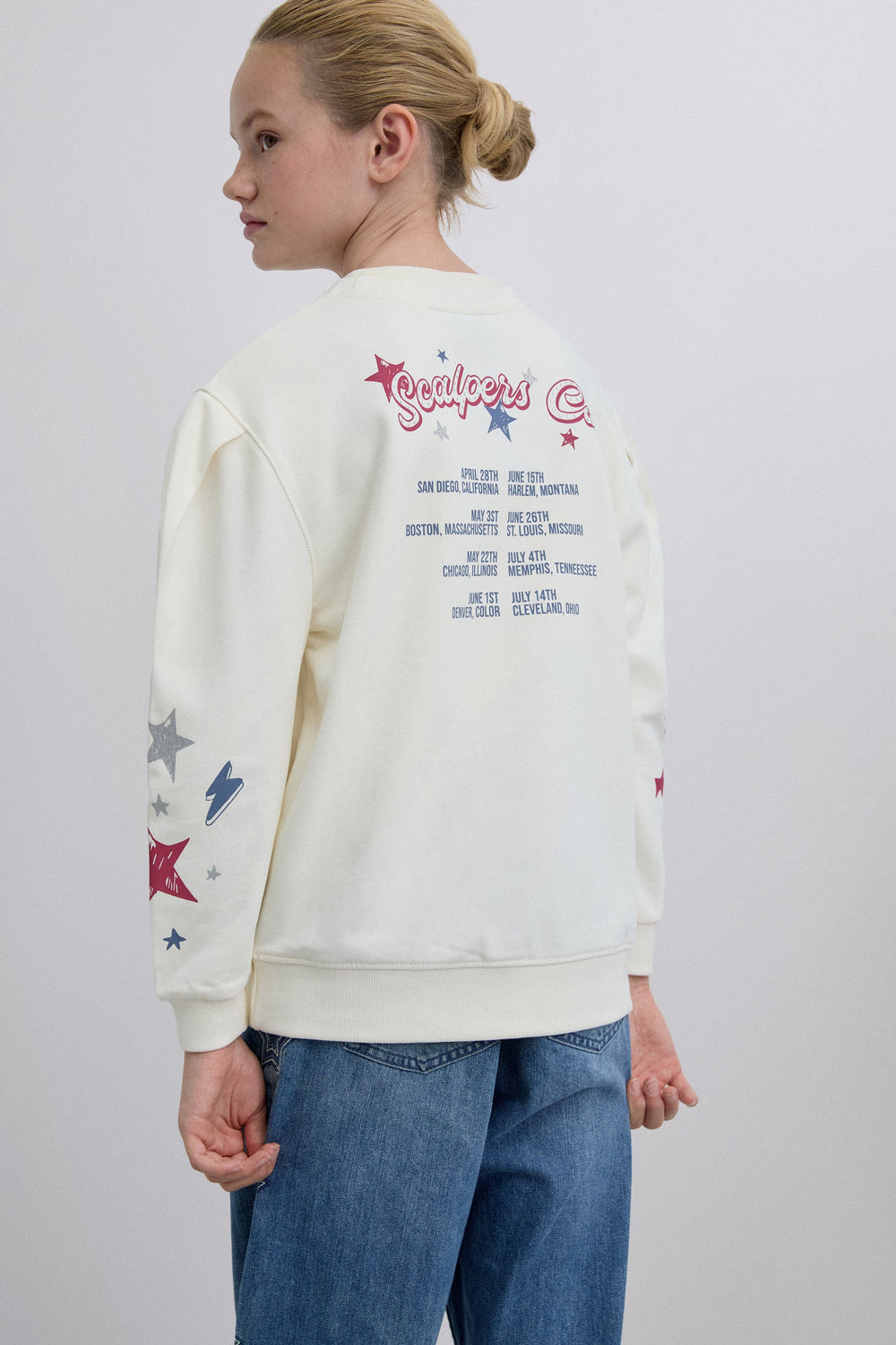 Sweatshirt made of 100% BCI cotton. Slightly puffed long sleeves. Round neck. Ribbed trim. Printed on sleeves and back.