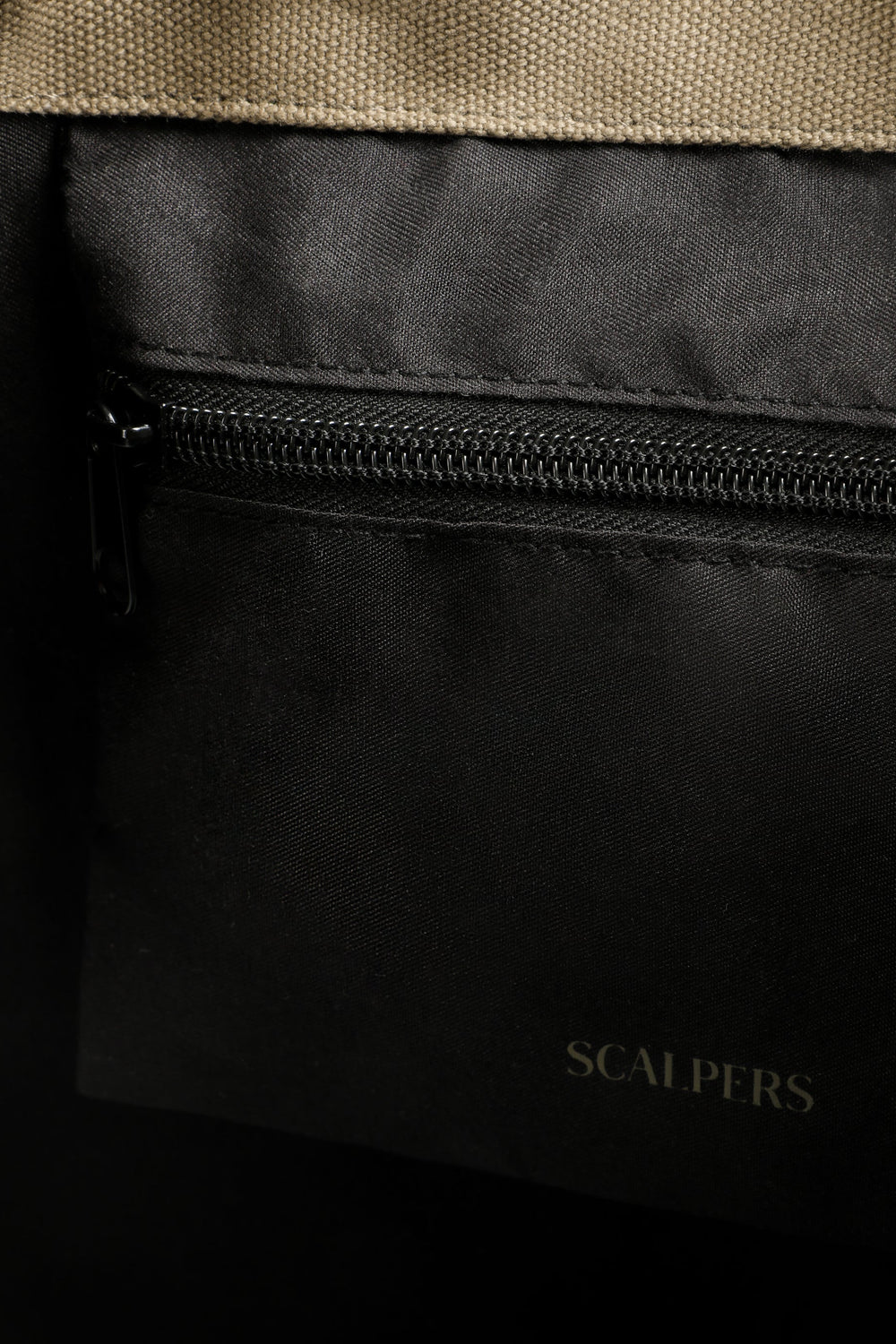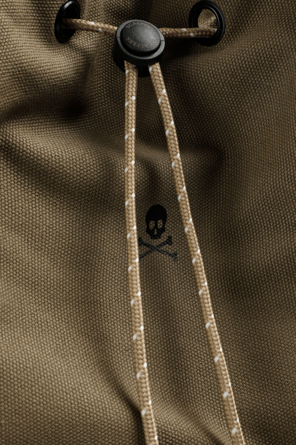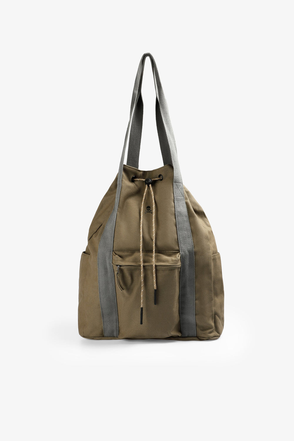Bag made of 100% cotton. Double strap. Adjustable zip, inner pocket and outside cargo-style pocket. Contrast skull and logo detail: