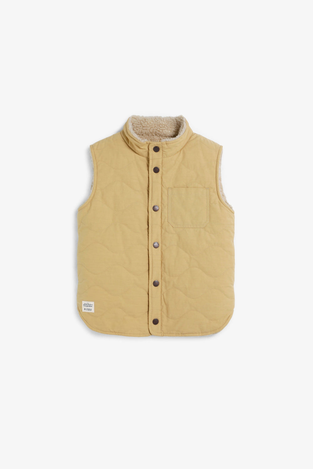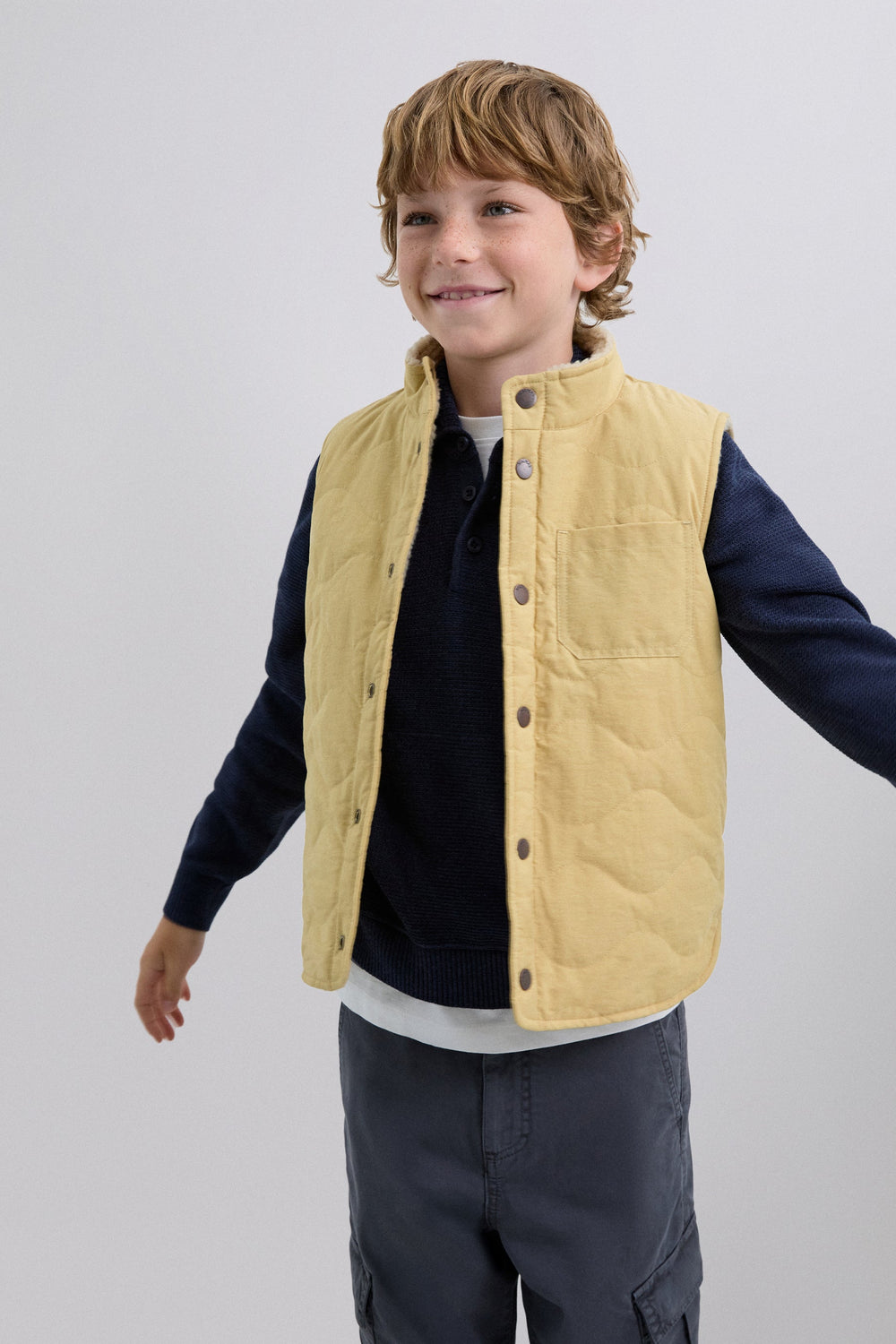 Sleeveless puffer jacket with outside pocket. Faux shealing lining. High collar. Regular fit. Button fastening.