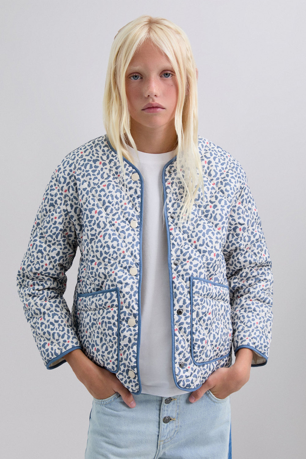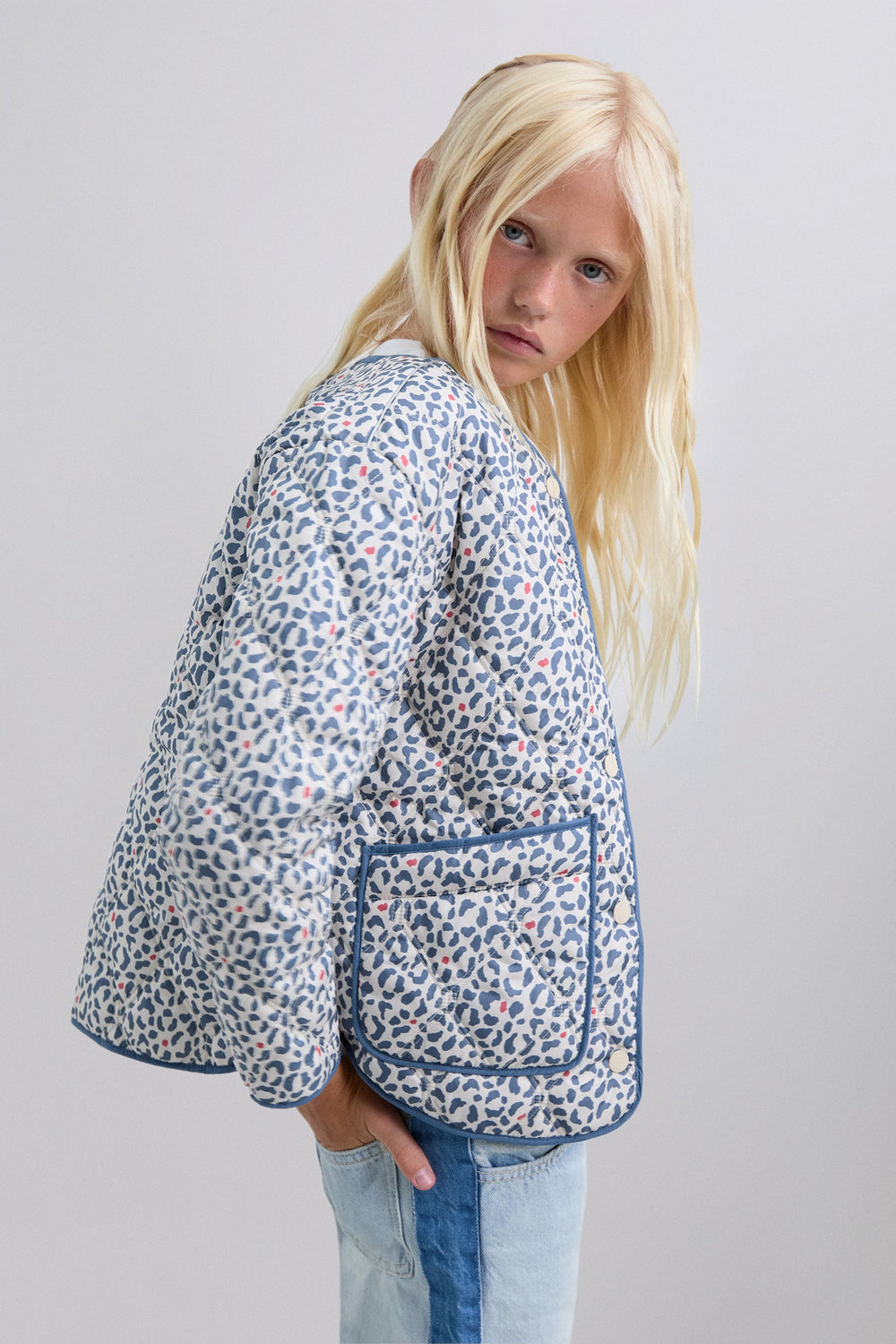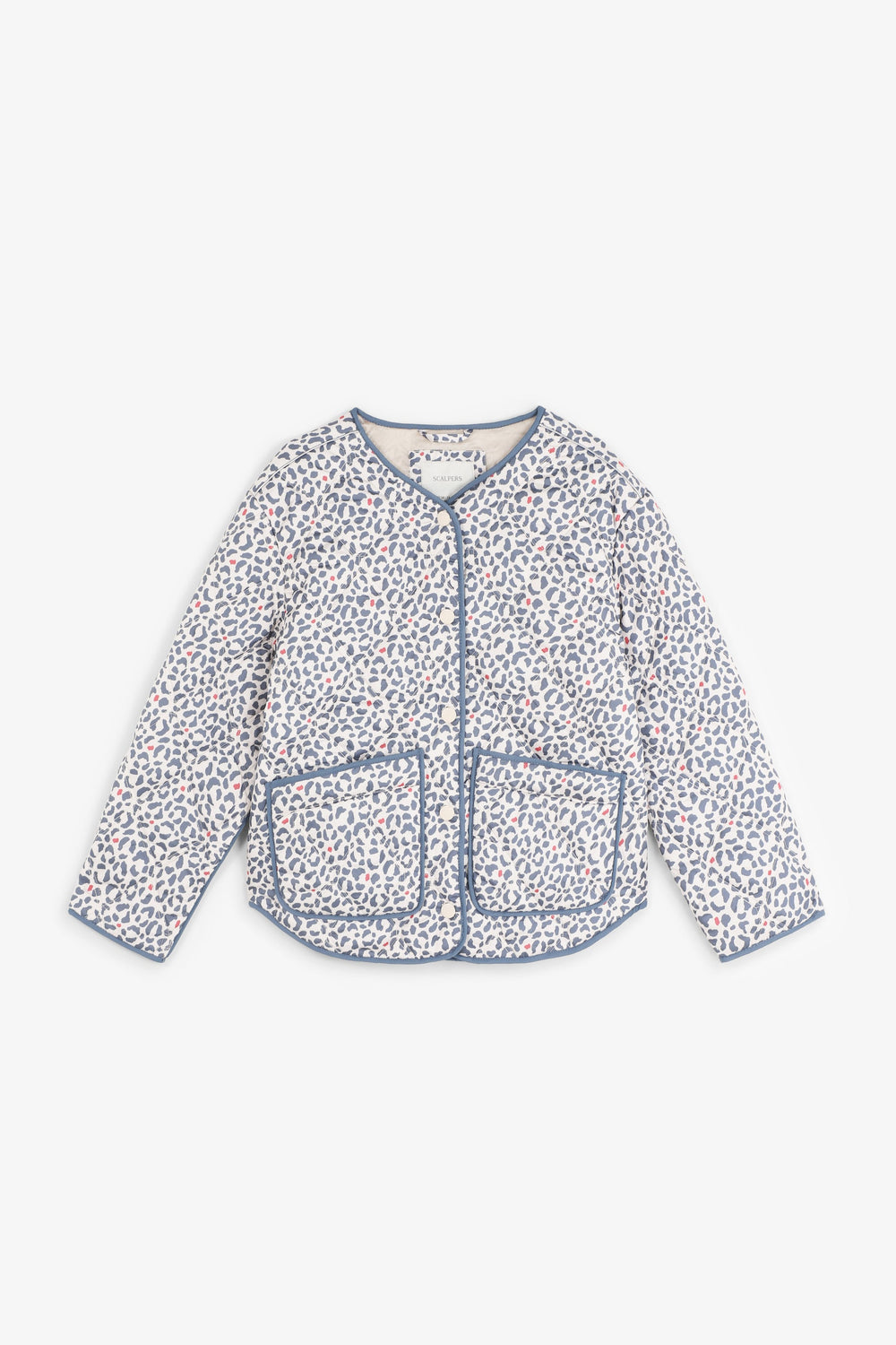 Puffer jacket made of a synthetic blend. Animal print. Button fastening. Slightly V-neck. Long sleeves. Two front pockets.
