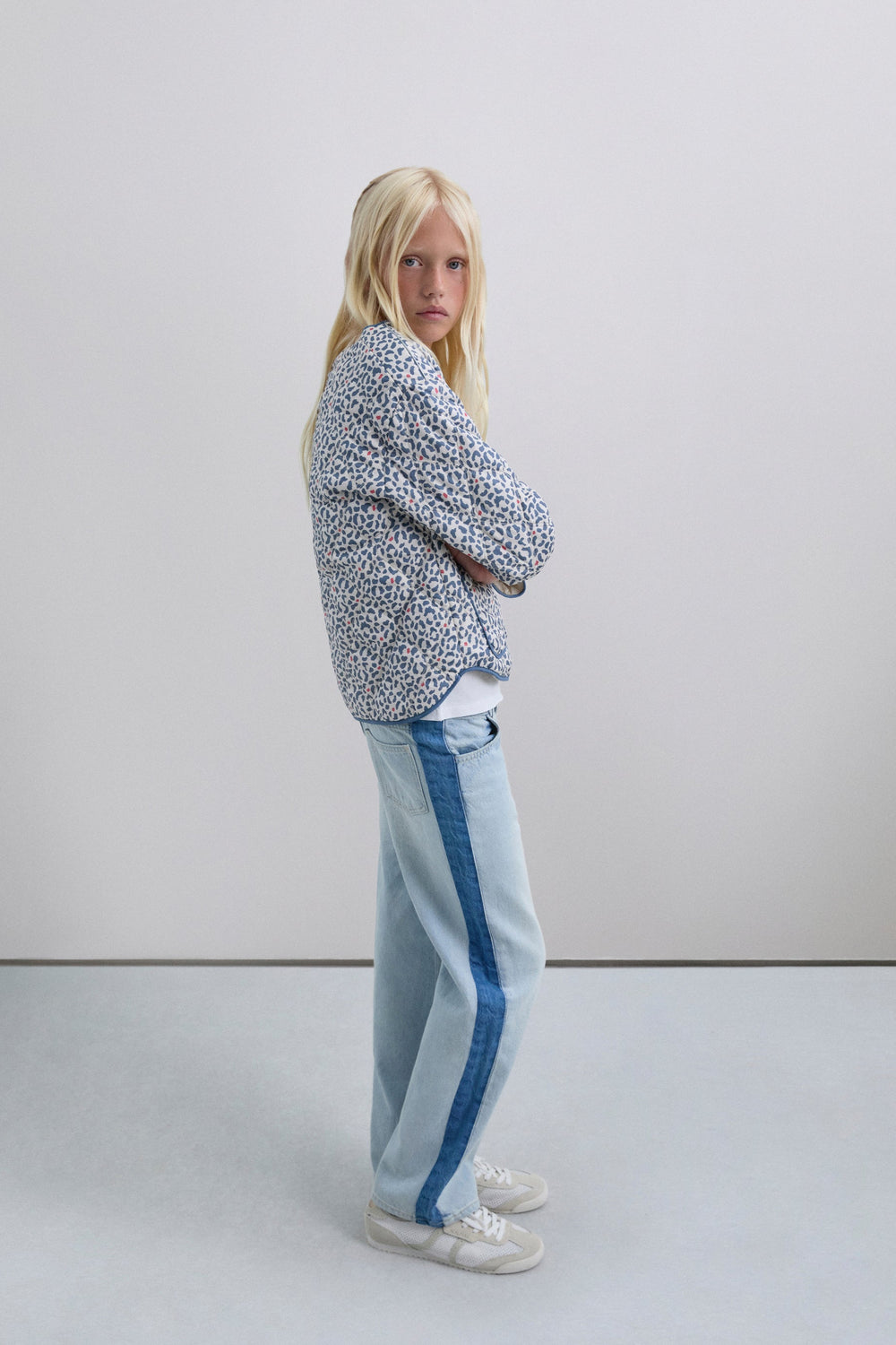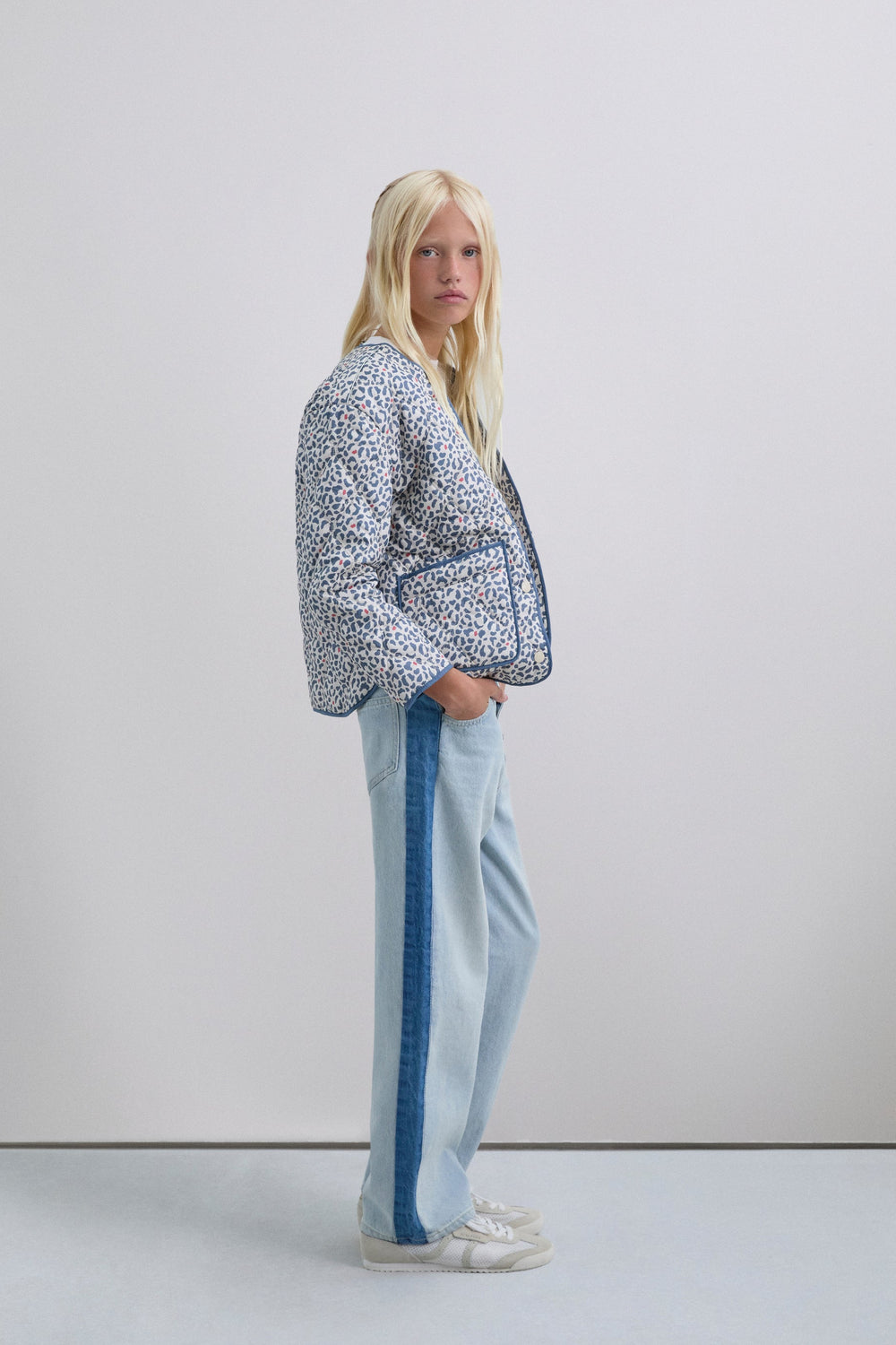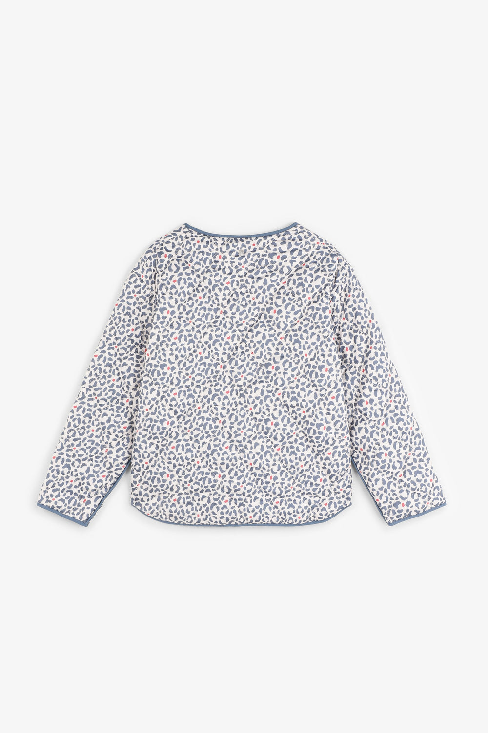 Puffer jacket made of a synthetic blend. Animal print. Button fastening. Slightly V-neck. Long sleeves. Two front pockets.