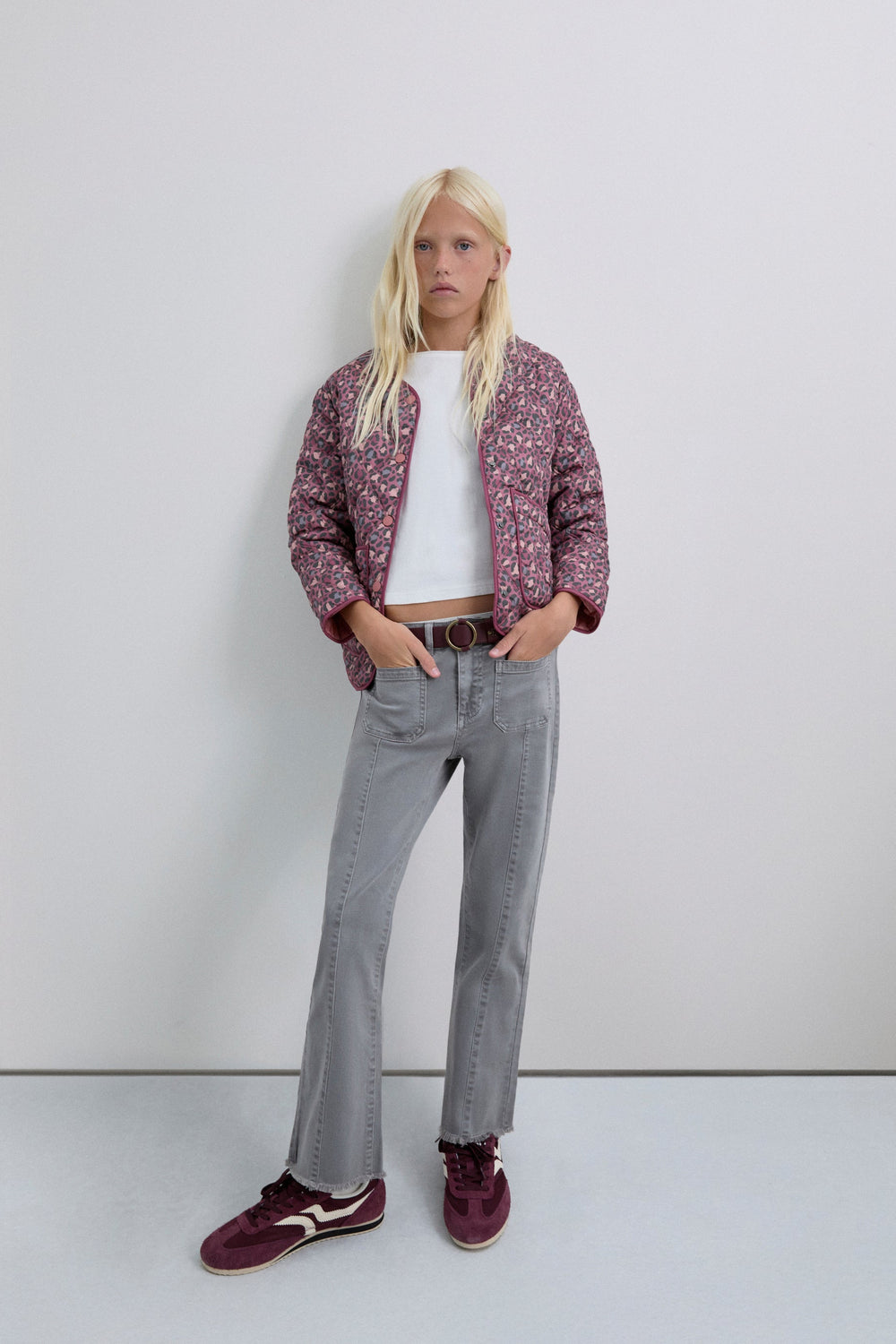 Puffer jacket made of a synthetic blend. Animal print. Button fastening. Slightly V-neck. Long sleeves. Two front pockets.