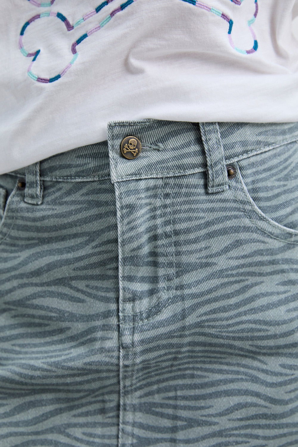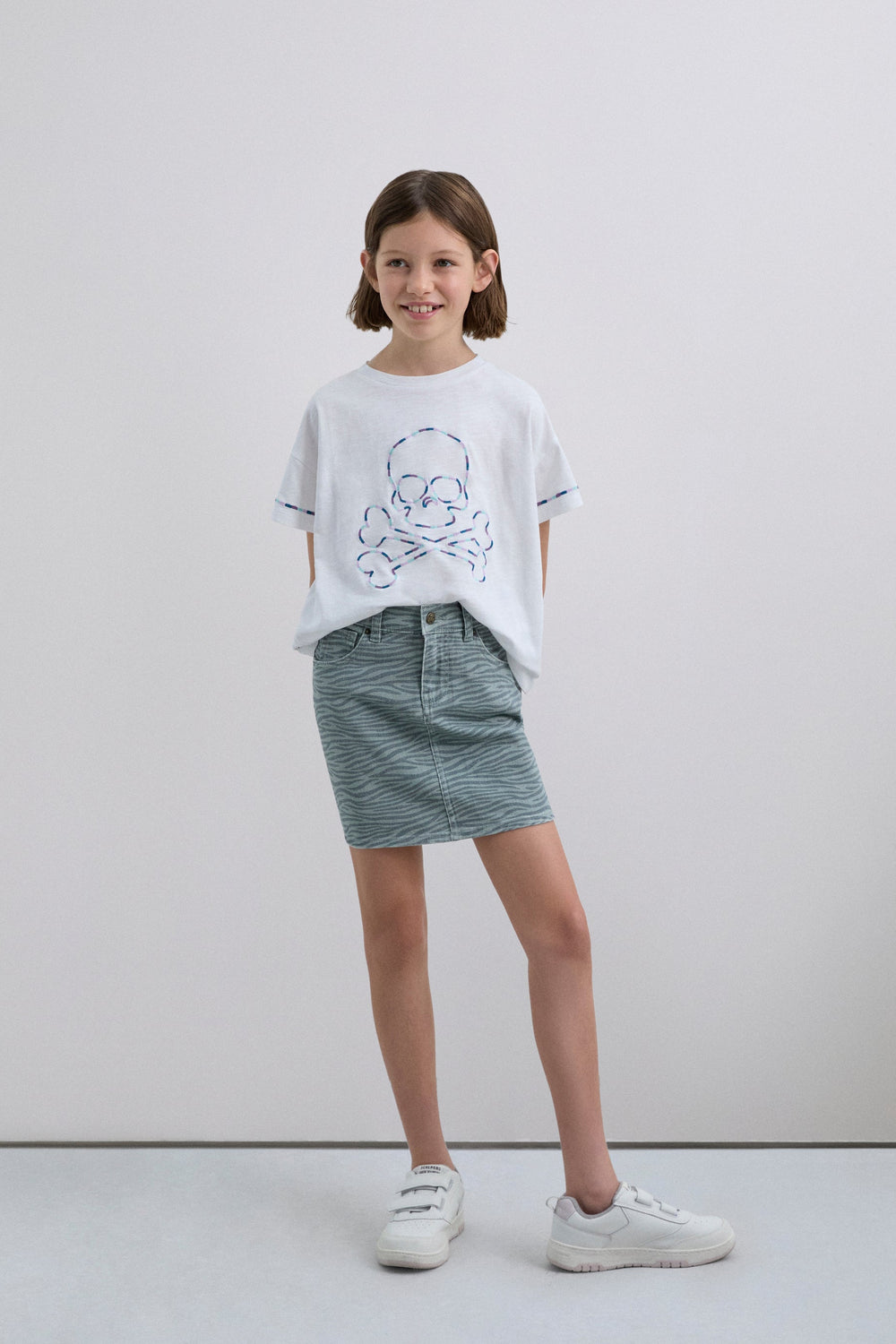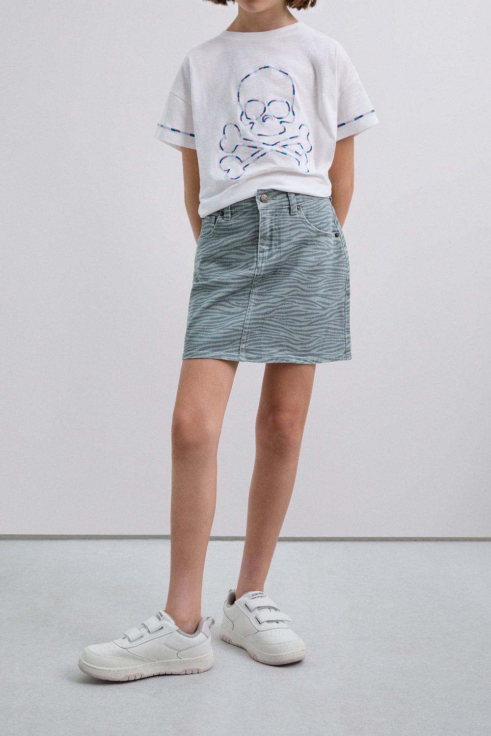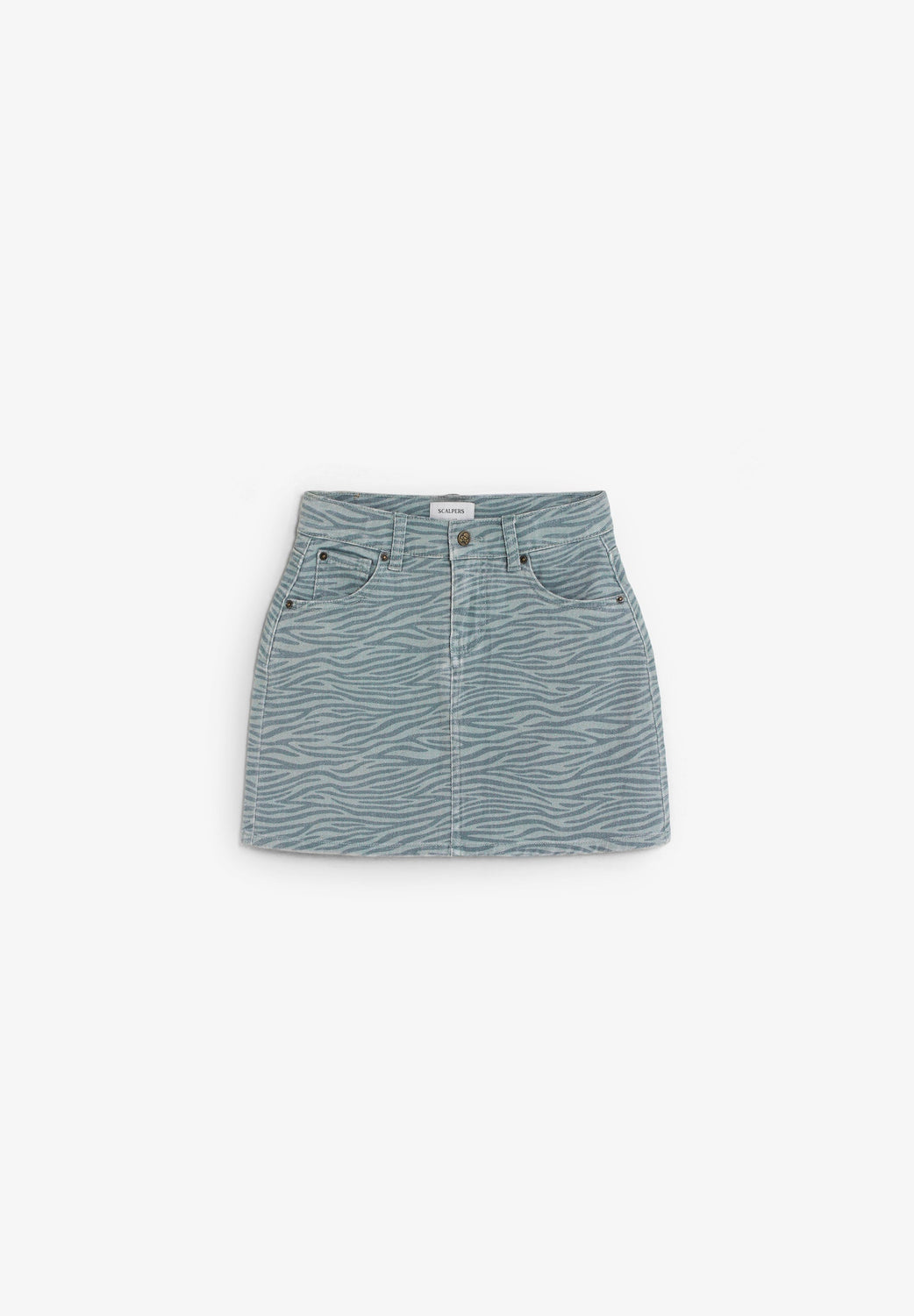 Mini skirt made of 98% organic BCI cotton. Front button and zip fastening. Pockets on front and back. Zebra print. Label detail on the back.