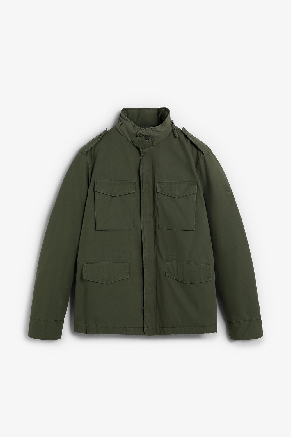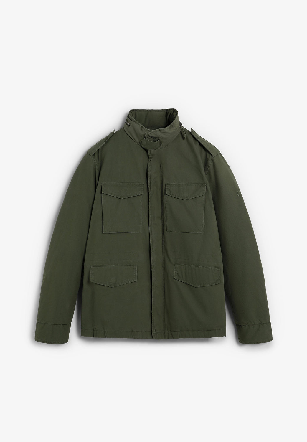Parka made of BCI cotton. Military style. Four front pockets. Neck fastening detail. Front zip fastening and contrast hood concealed in the collar. Diamond pattern lining. Adjustable cuffs. High-density logo detail on the sleeve. Detachable hood with zip.