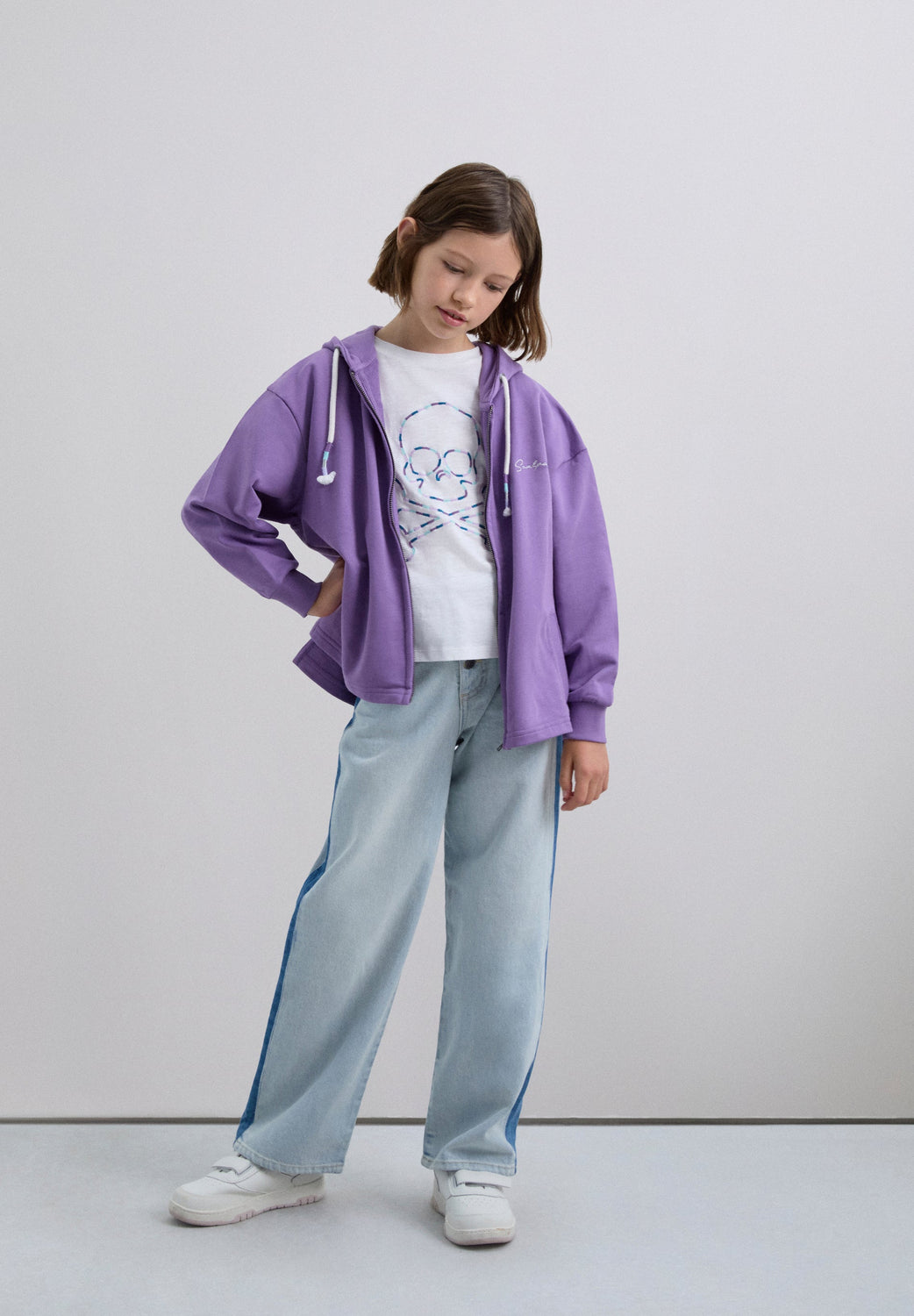Sweatshirt with an adjustable drawstring hood. Front zip fastening. Long sleeves with ribbed trims. Embroidered logo on chest and studded skull on back.