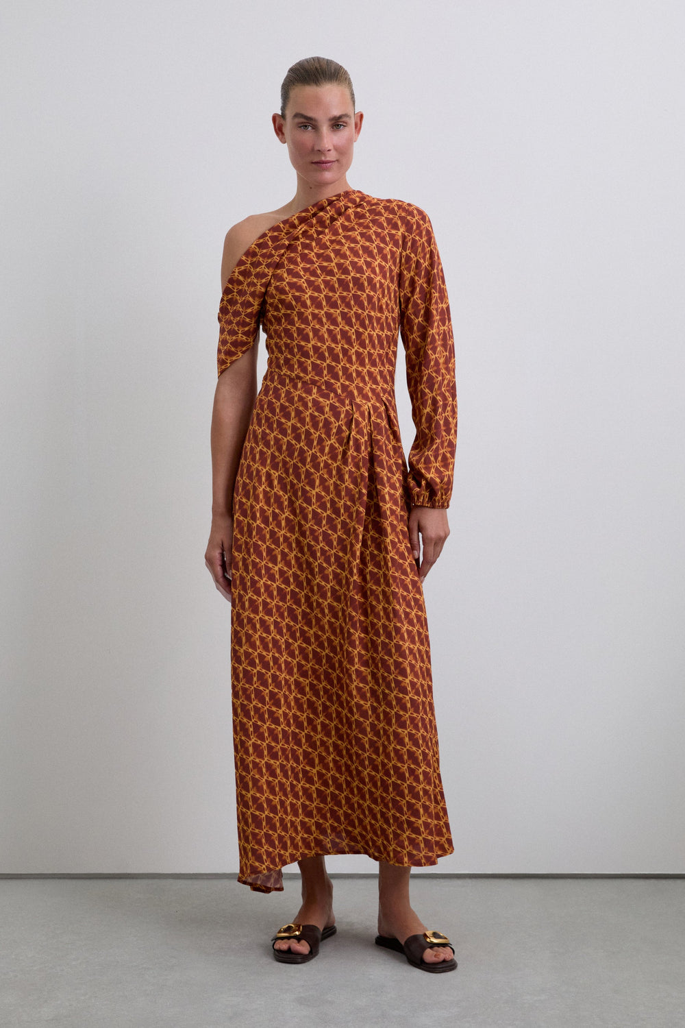 PRINTED ASYMMETRIC NECKLINE DRESS