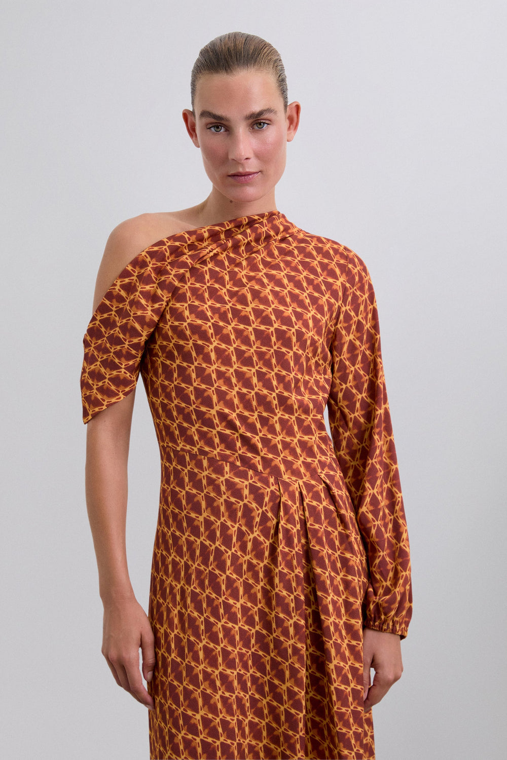 Print dress with long and short puffed sleeves with elasticated cuffs. Asymmetric neckline. Off-shoulder on one side. Slim fit.