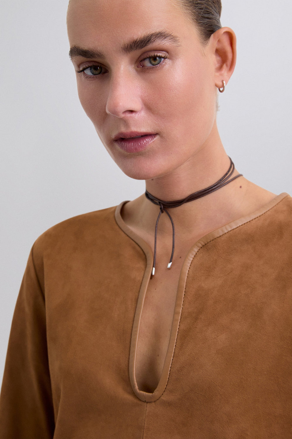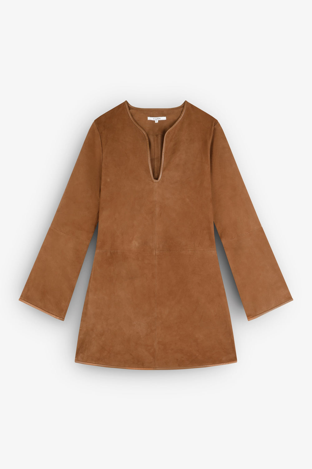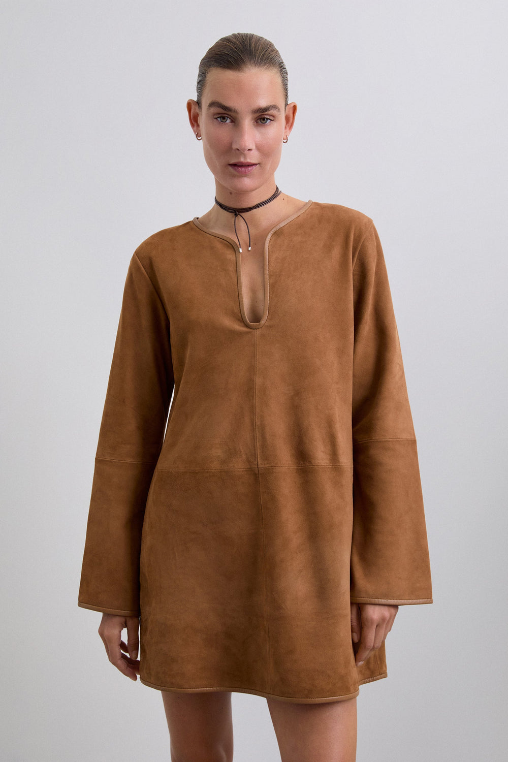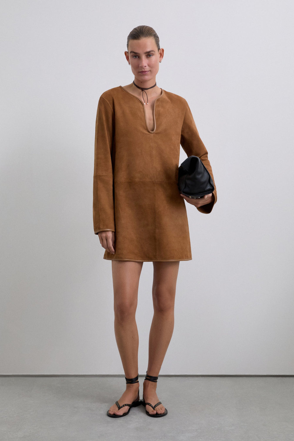 Mini dress made in goatskin with suede finish. Crew neck. Sleeves. Lined. Seams detail.