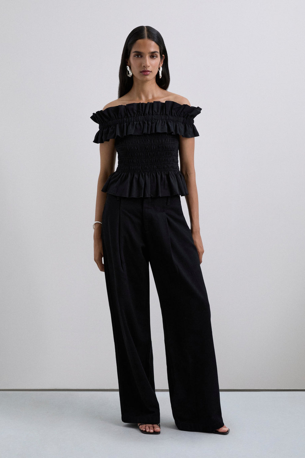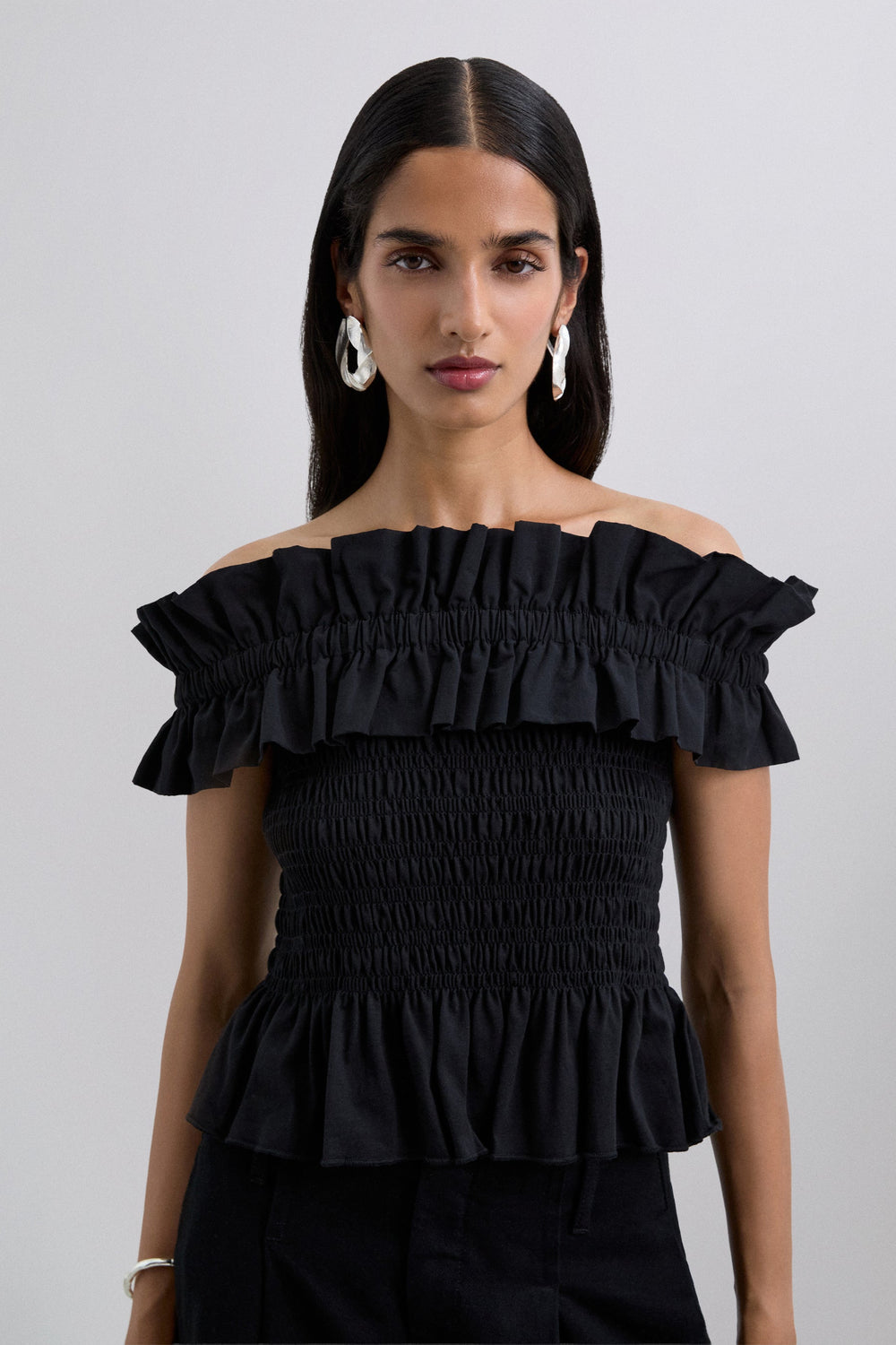 Top made of 100% BCI cotton. Slim fit. Off the shoulder with gathering and ruffles detail. Smocking on the body.