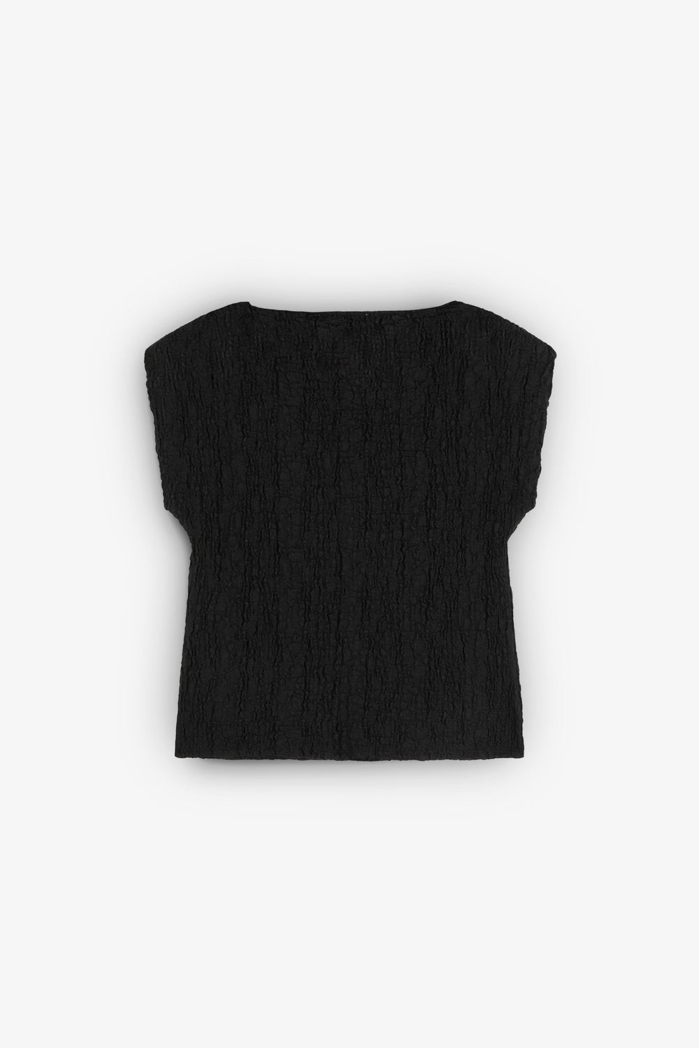 T-shirt made of slightly stretchy cotton blend fabric with crinkle texture. Slim fit, round neck, short sleeves with slightly padded shoulders.
