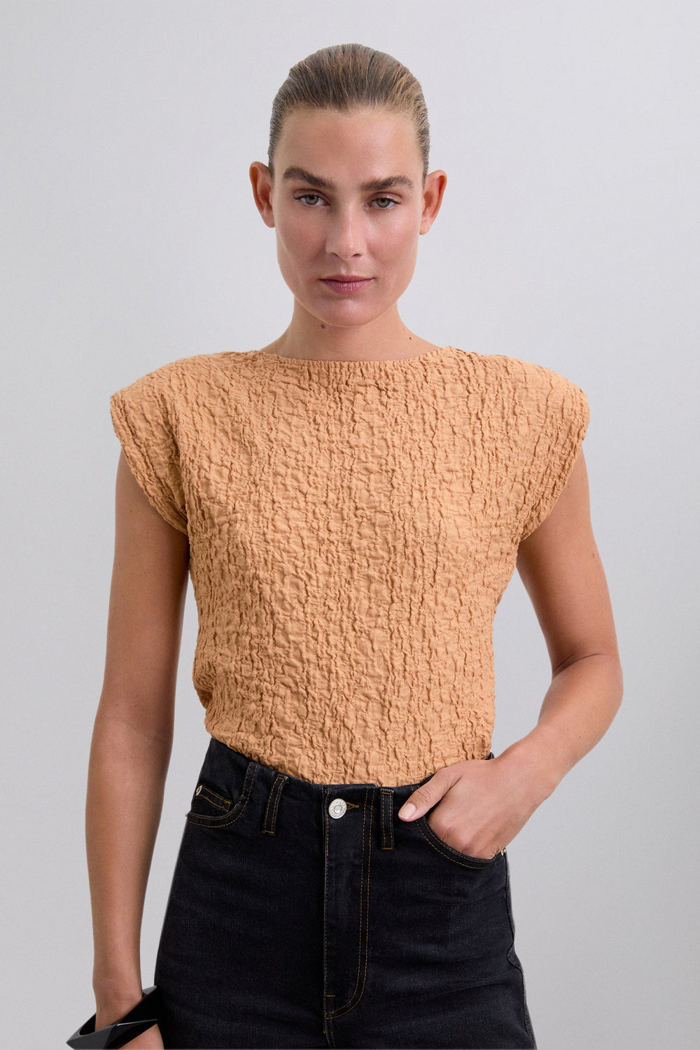 T-shirt made of slightly stretchy cotton blend fabric with crinkle texture. Slim fit, round neck, short sleeves with slightly padded shoulders.