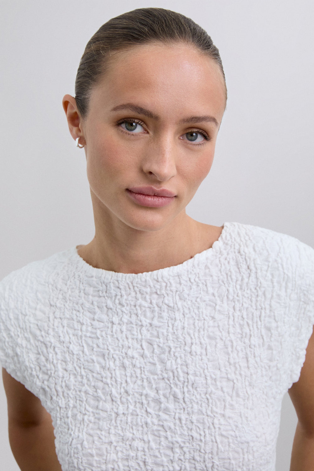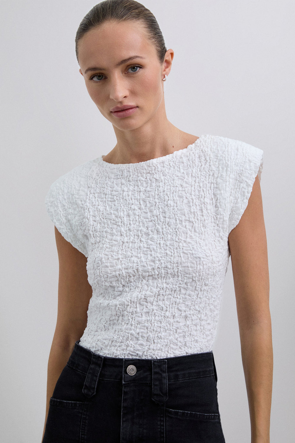 T-shirt made of slightly stretchy cotton blend fabric with crinkle texture. Slim fit, round neck, short sleeves with slightly padded shoulders.