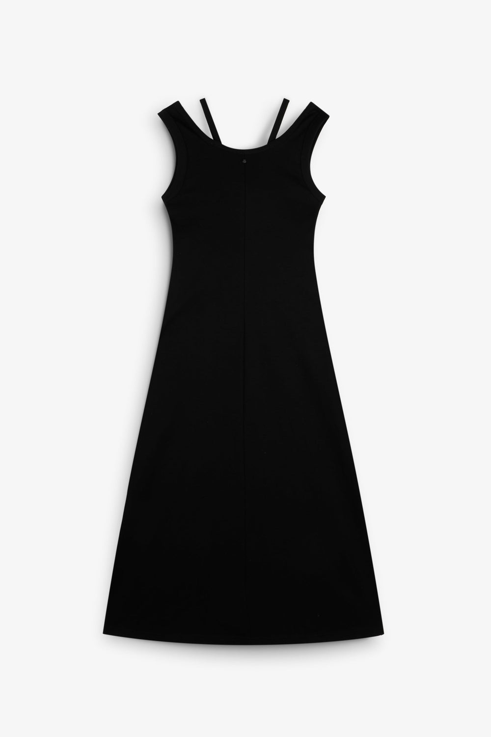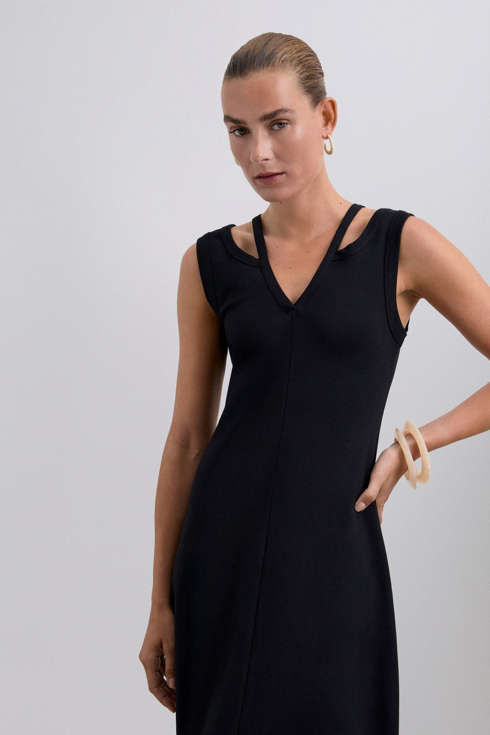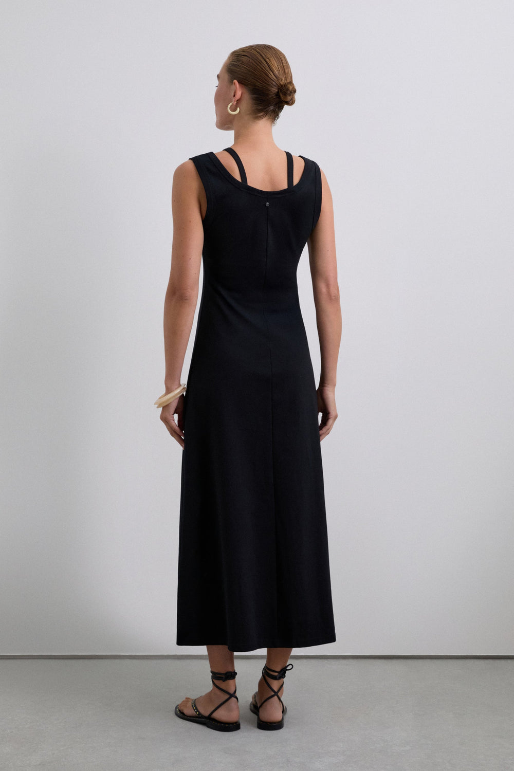 Midi dress made of 100% organic BCI cotton. Sleeveless. Cut out on straps. V-neck. Metal appliqué detail on the back.