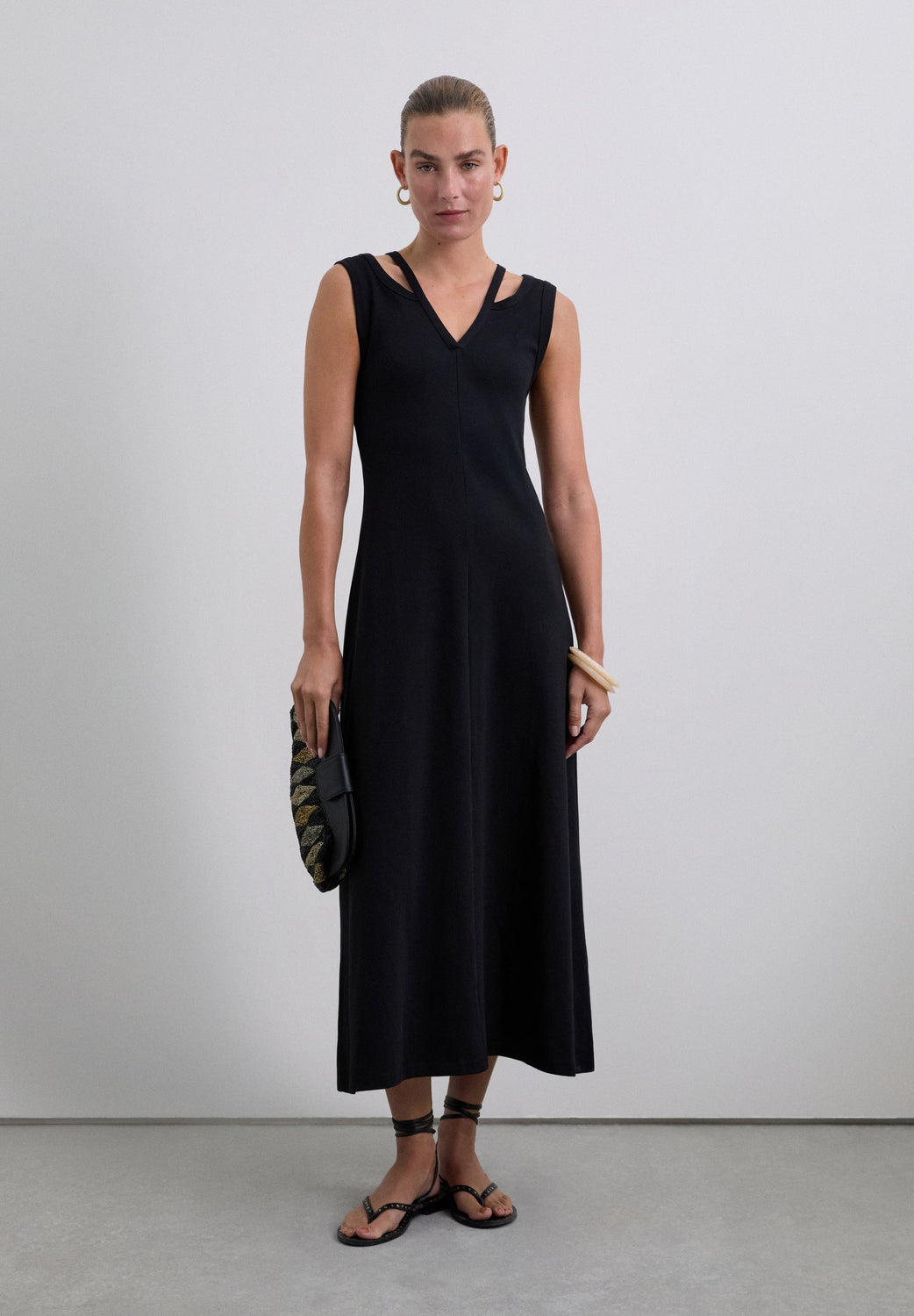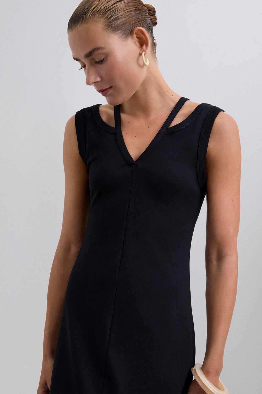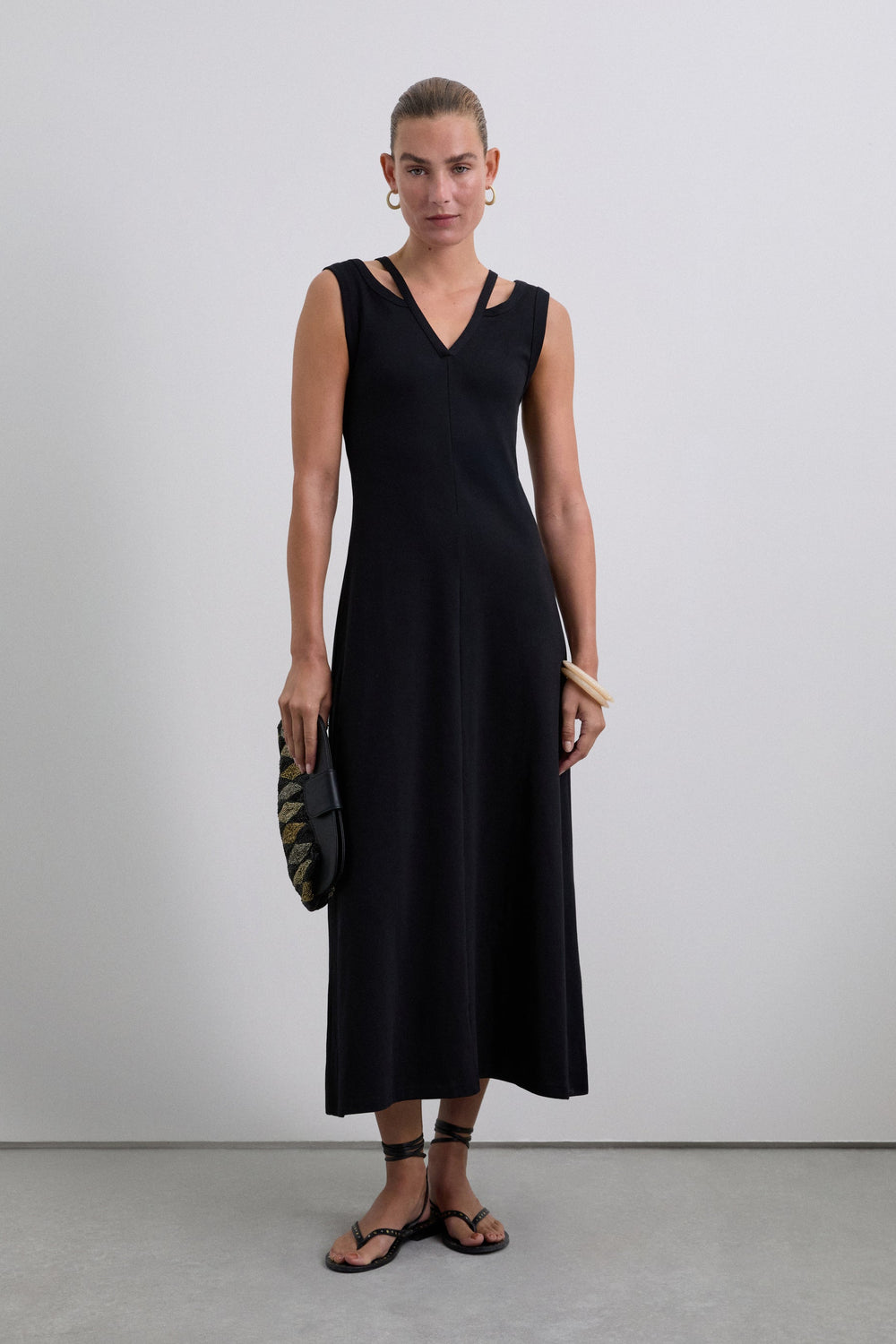 Midi dress made of 100% organic BCI cotton. Sleeveless. Cut out on straps. V-neck. Metal appliqué detail on the back.