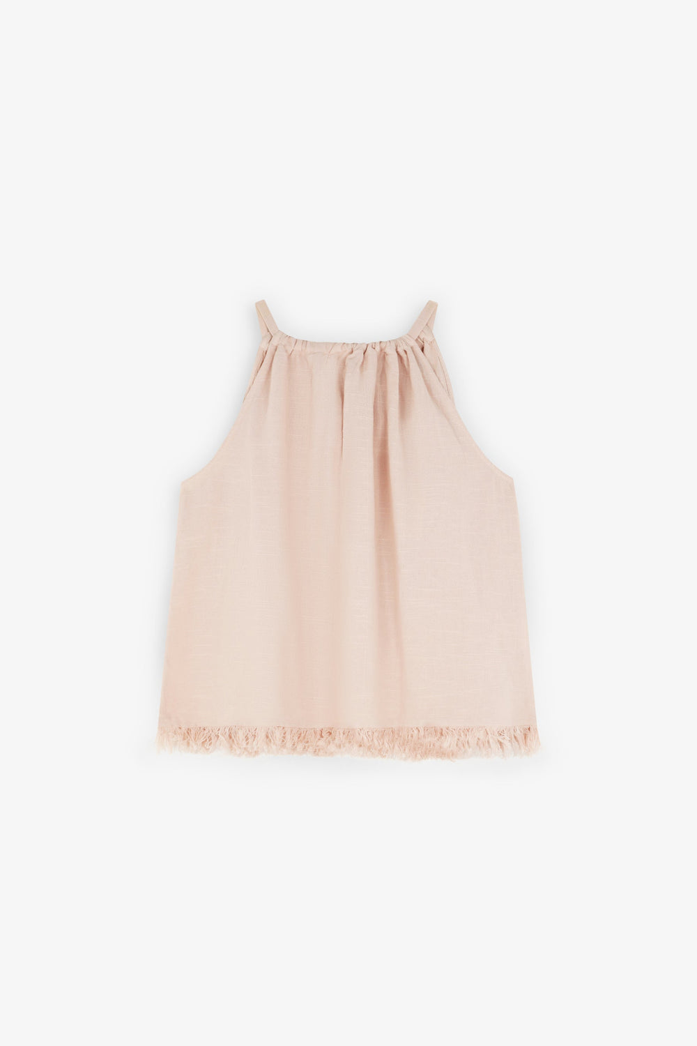 Cotton top with fringed detail on the hem. Sleeveless. Adjustable lace up back.