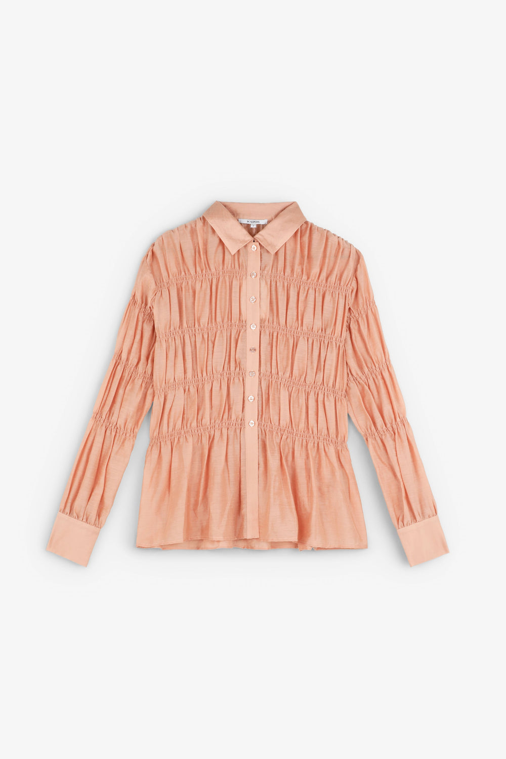 Shirt made of textured fabric. Long sleeves with smocking. Classic shirt collar fastening at the front. Slightly puffed long sleeves.