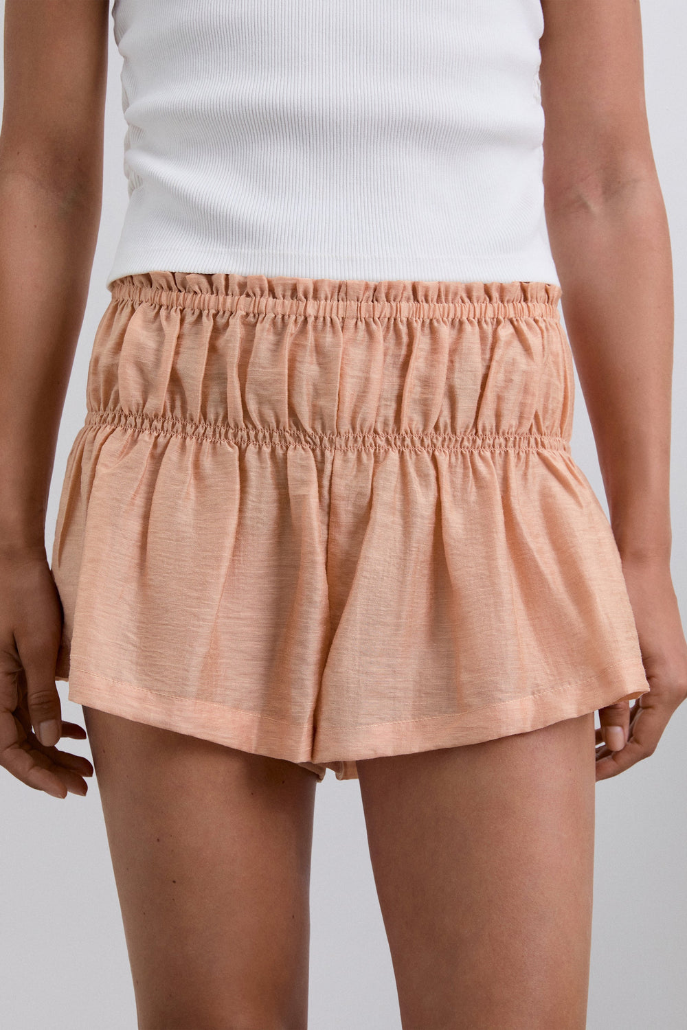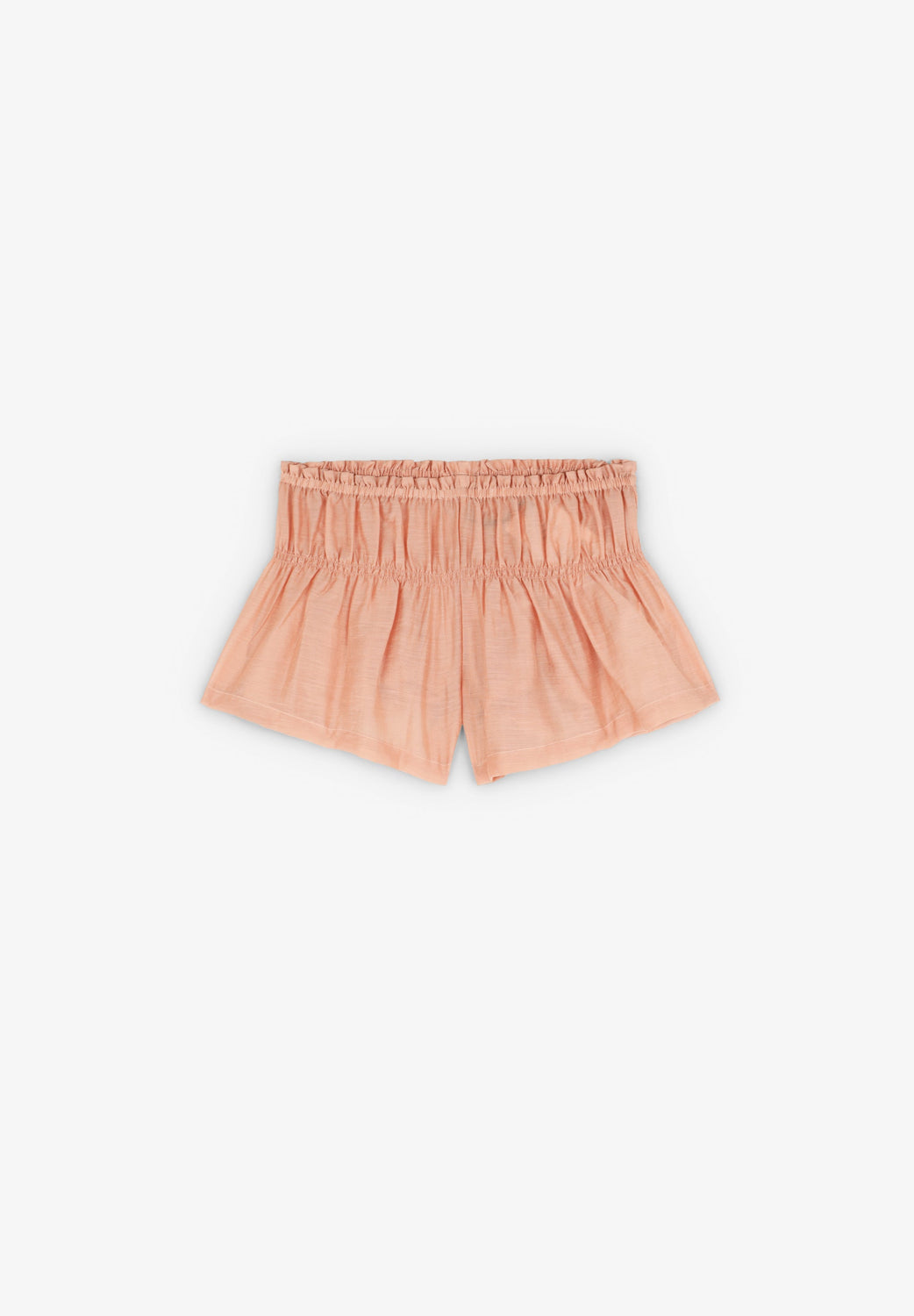 Shorts made of a textured fabric. Slightly stretchy smocked waist.