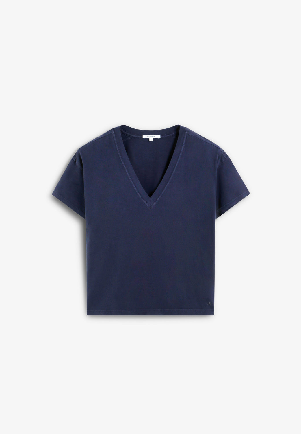 Basic T-shirt made of 100% organic cotton. Regular fit, V-neck and short sleeves. Embroidered logo detail at the lower front.
