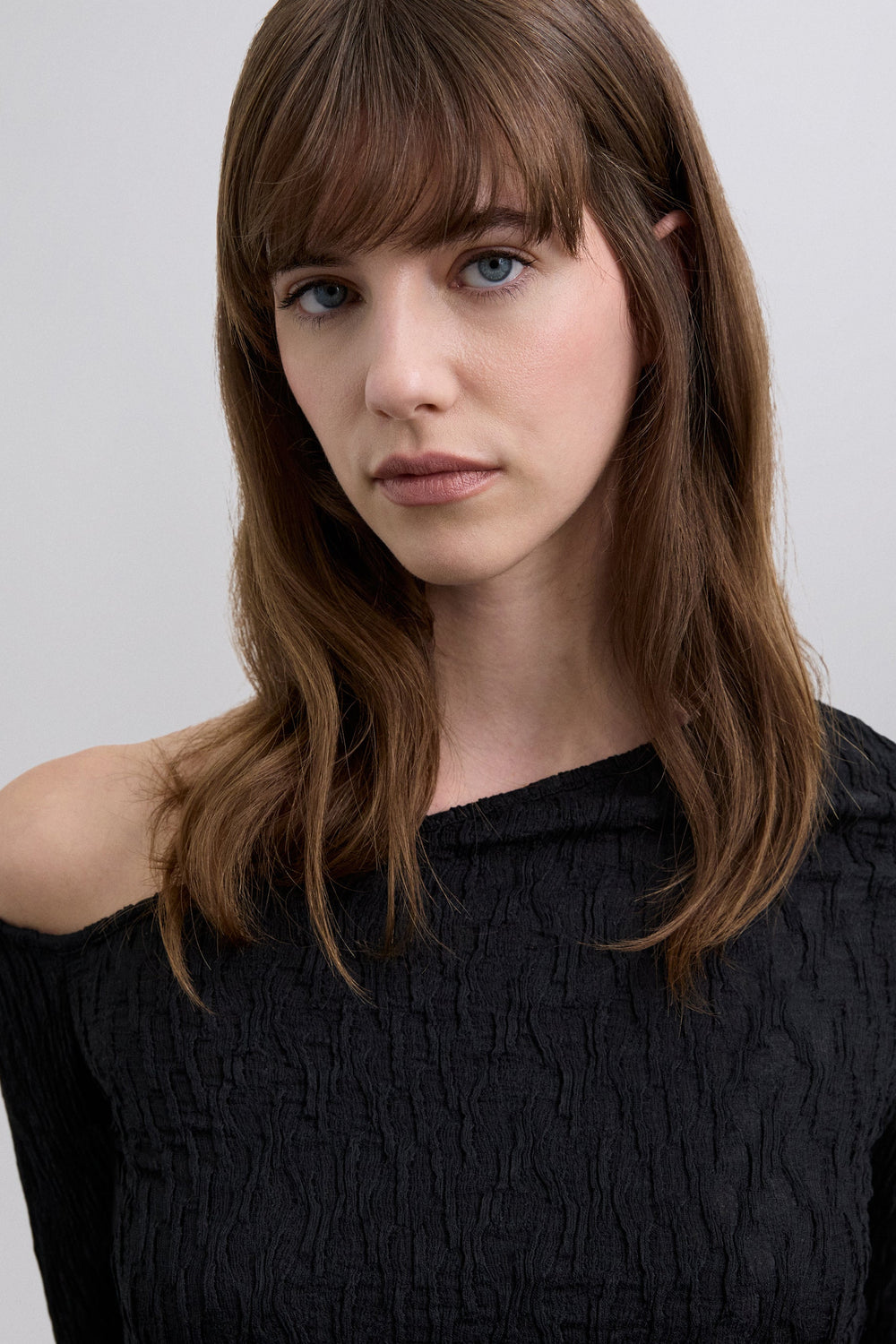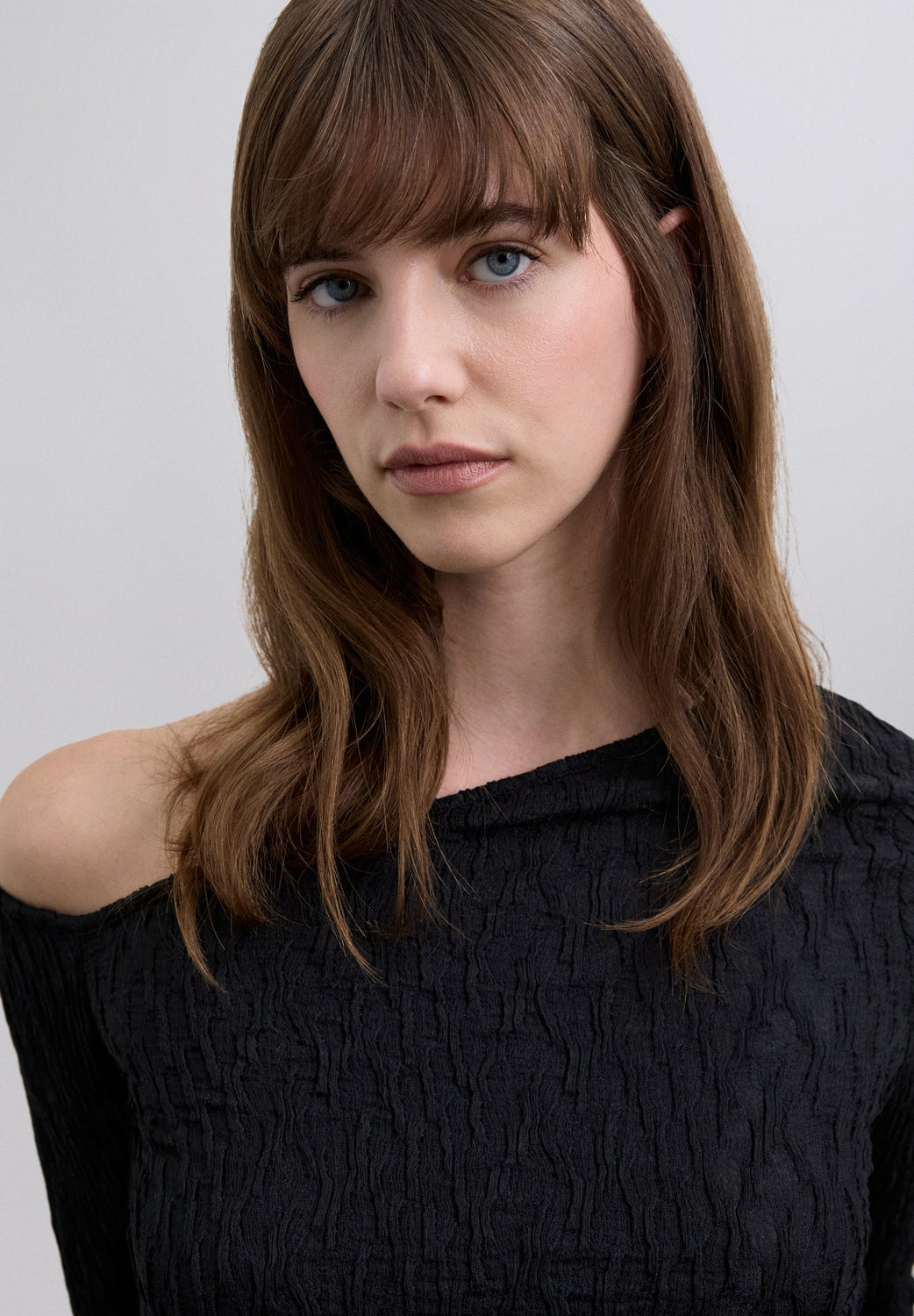 Long sleeve, asymmetrical top. Off-the-shoulder, gathered design. Ribbed trim.