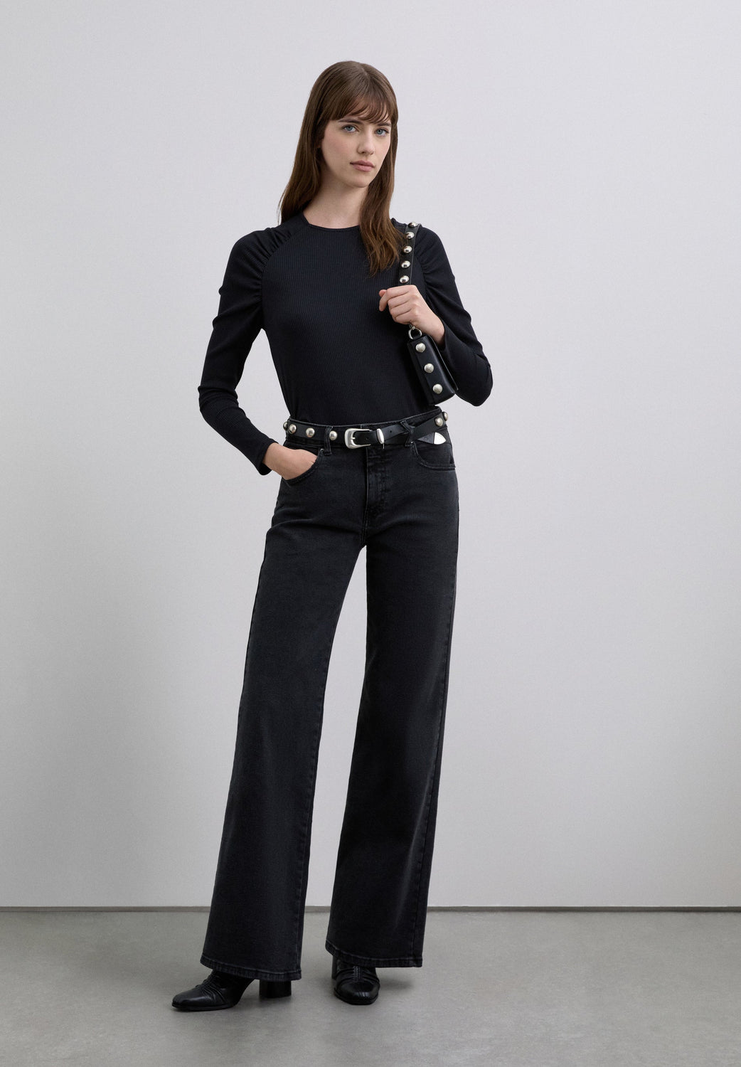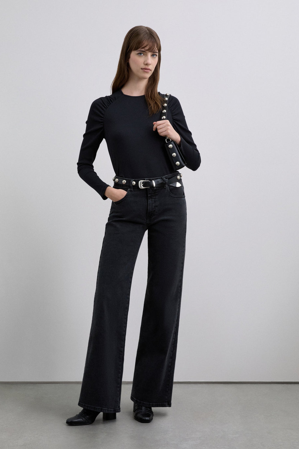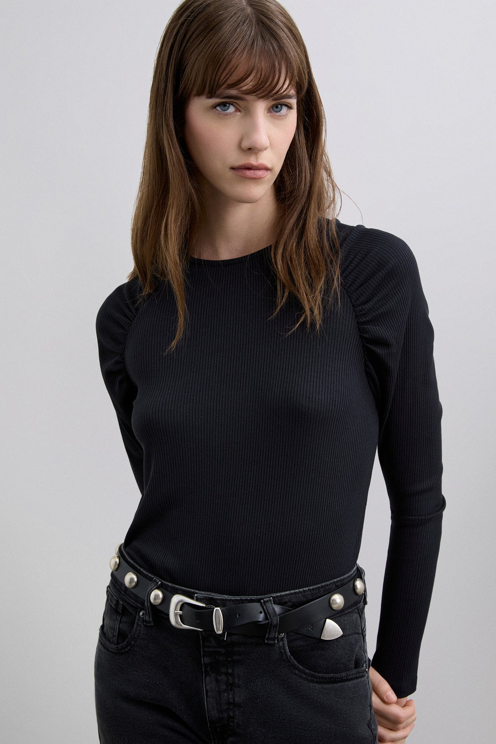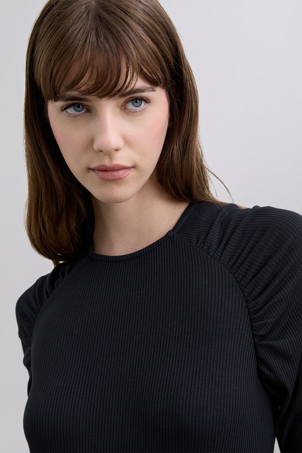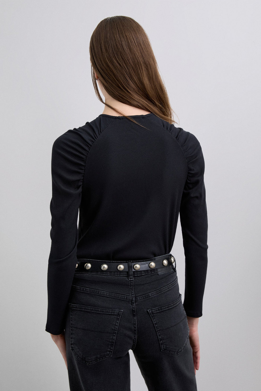 Long sleeve ribbed T-shirt. Gathered detail on the shoulders. Stretch fabric and round neck.