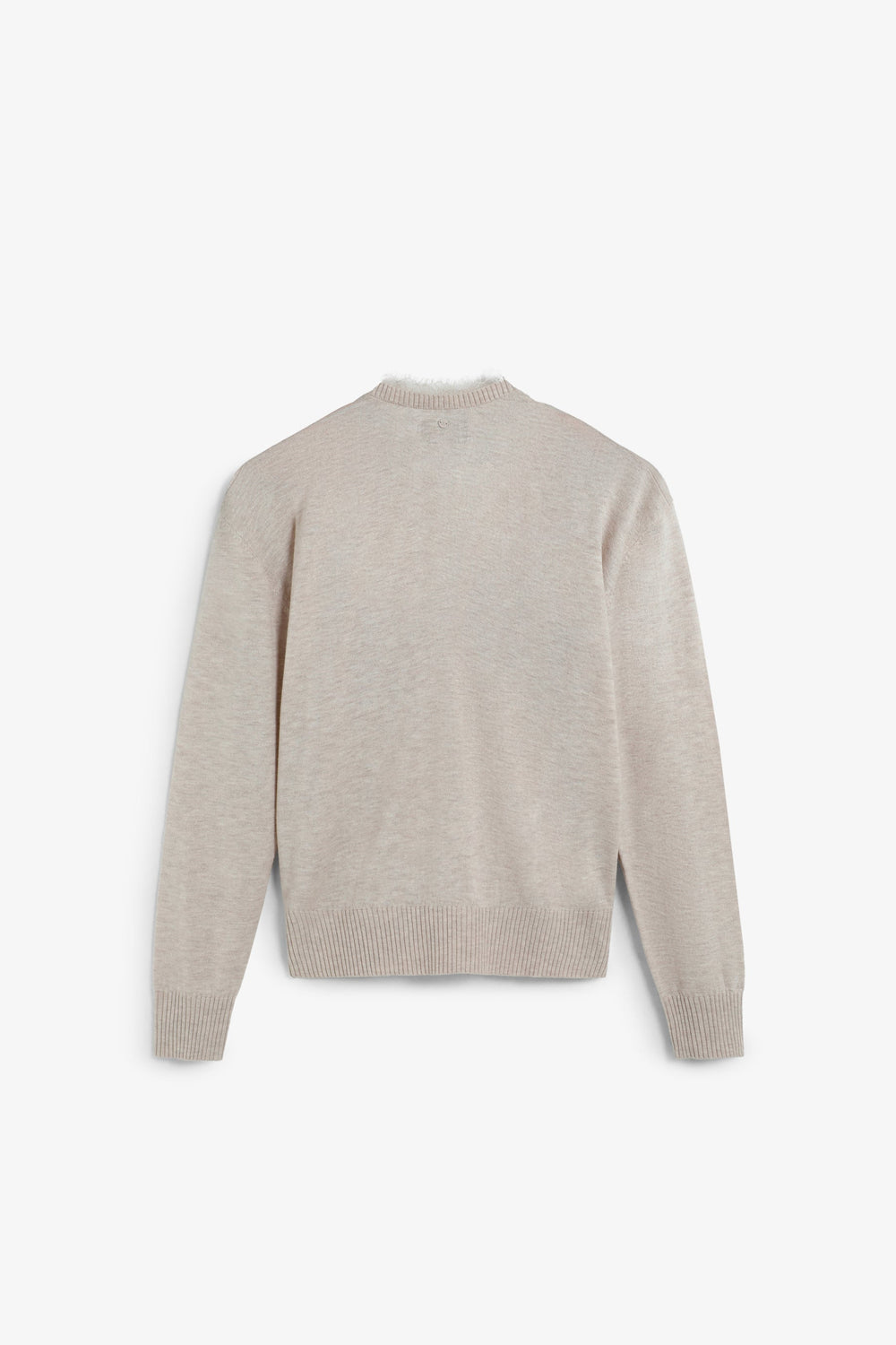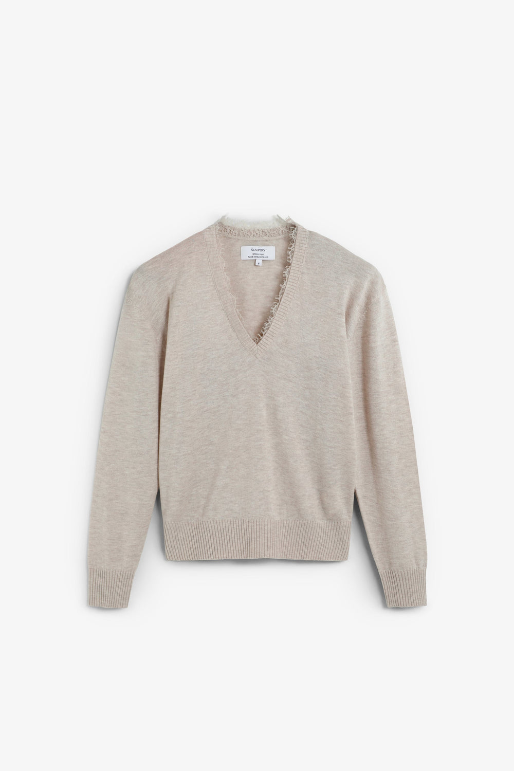 Sweater made of a wool and viscose blend. Regular fit. V-neck with lace details. Long sleeves with ribbed cuffs and hem.