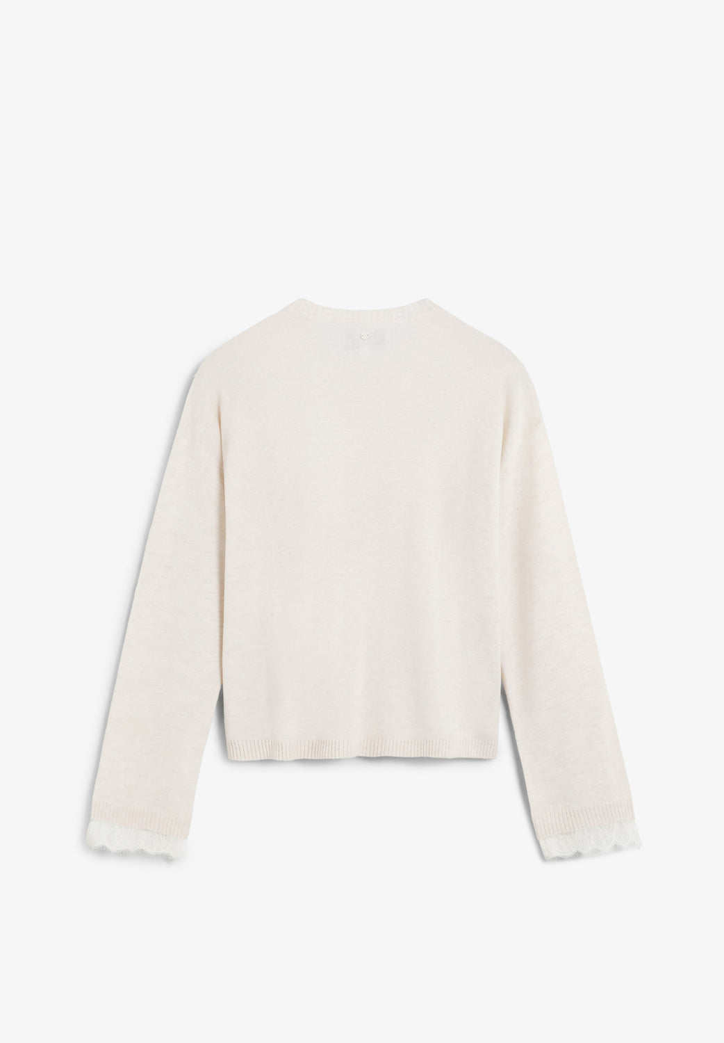 Sweater made of a wool and viscose blend. Regular fit. Round neck and long sleeves with ribbed trim. Lace details on chest and cuffs.