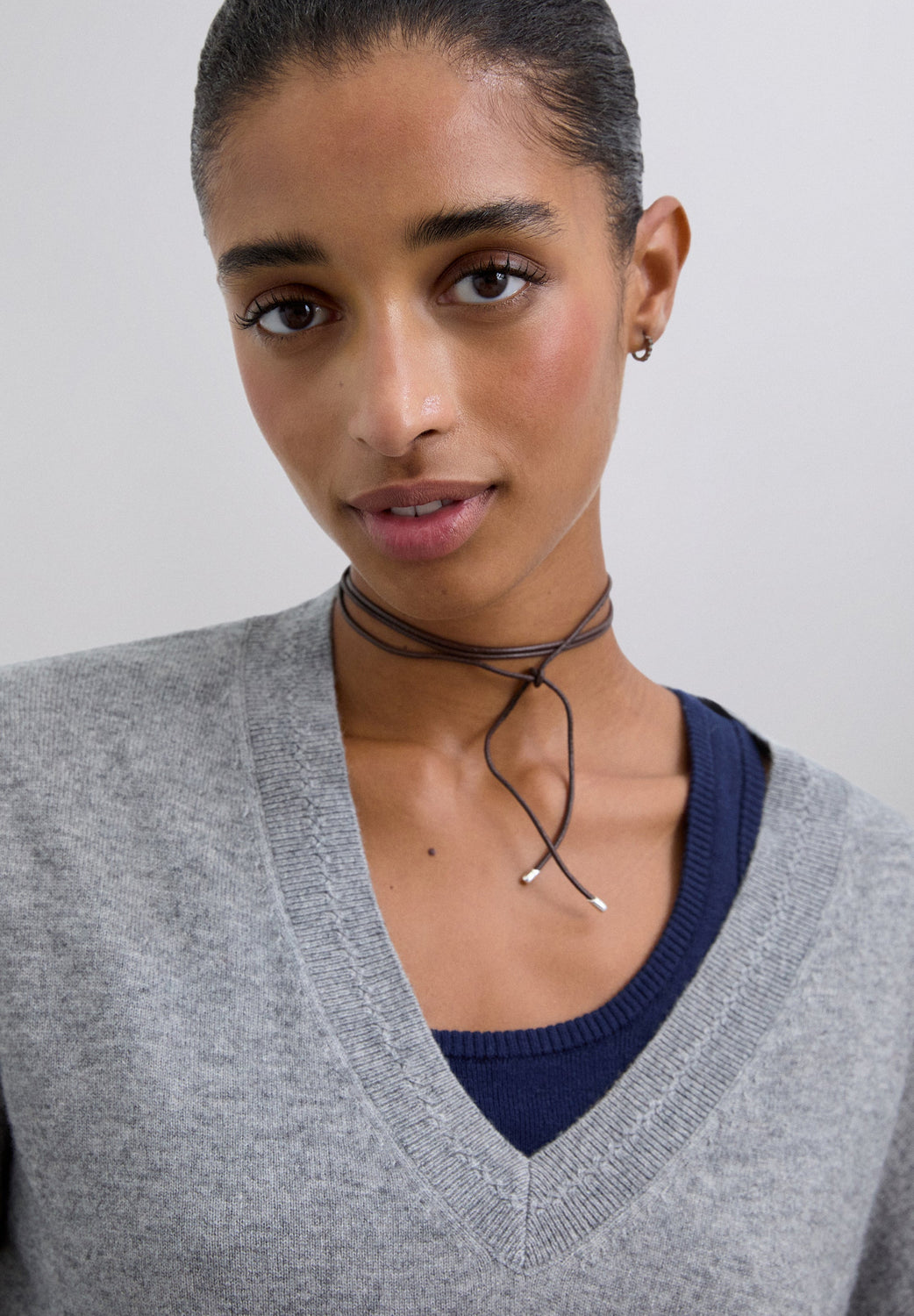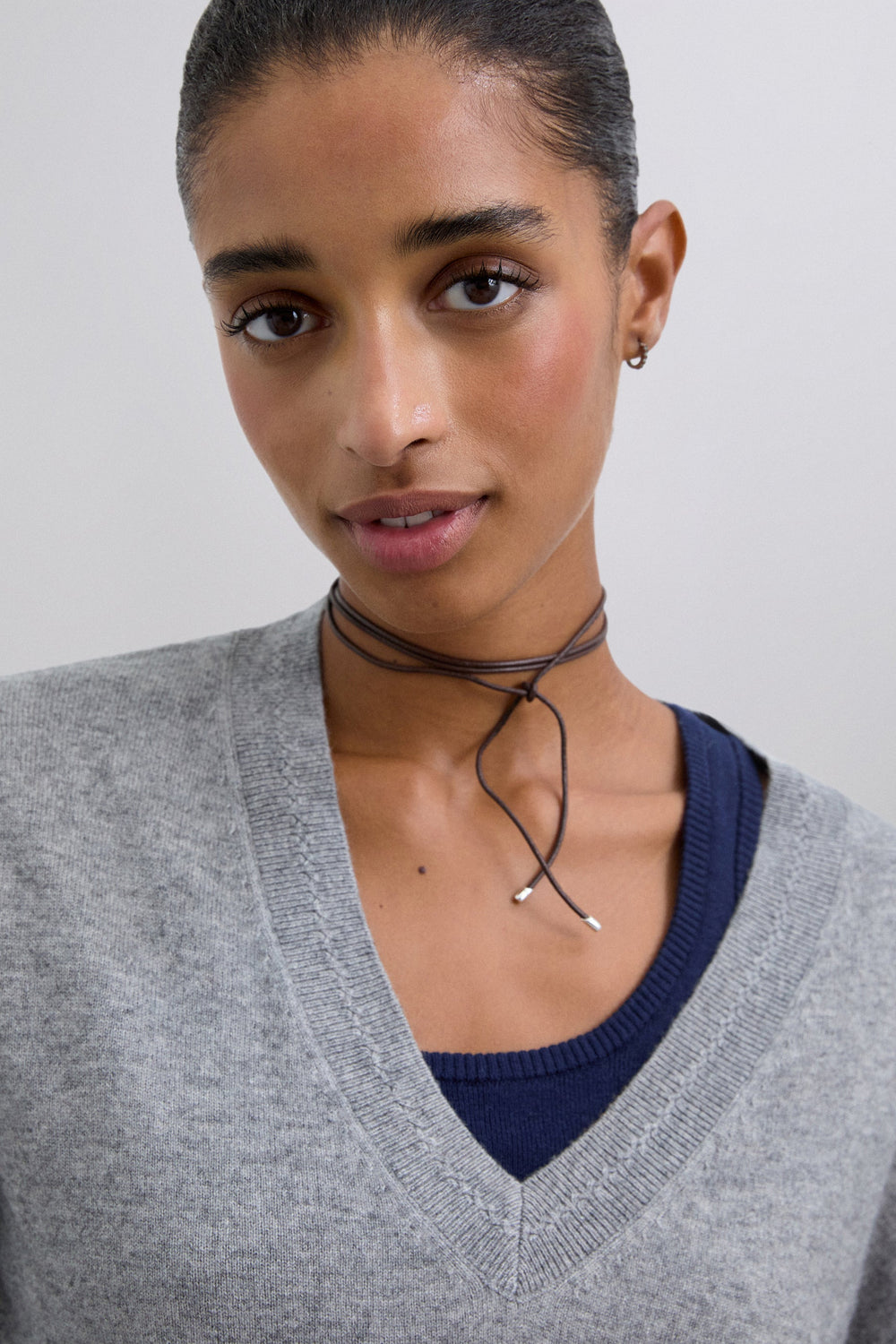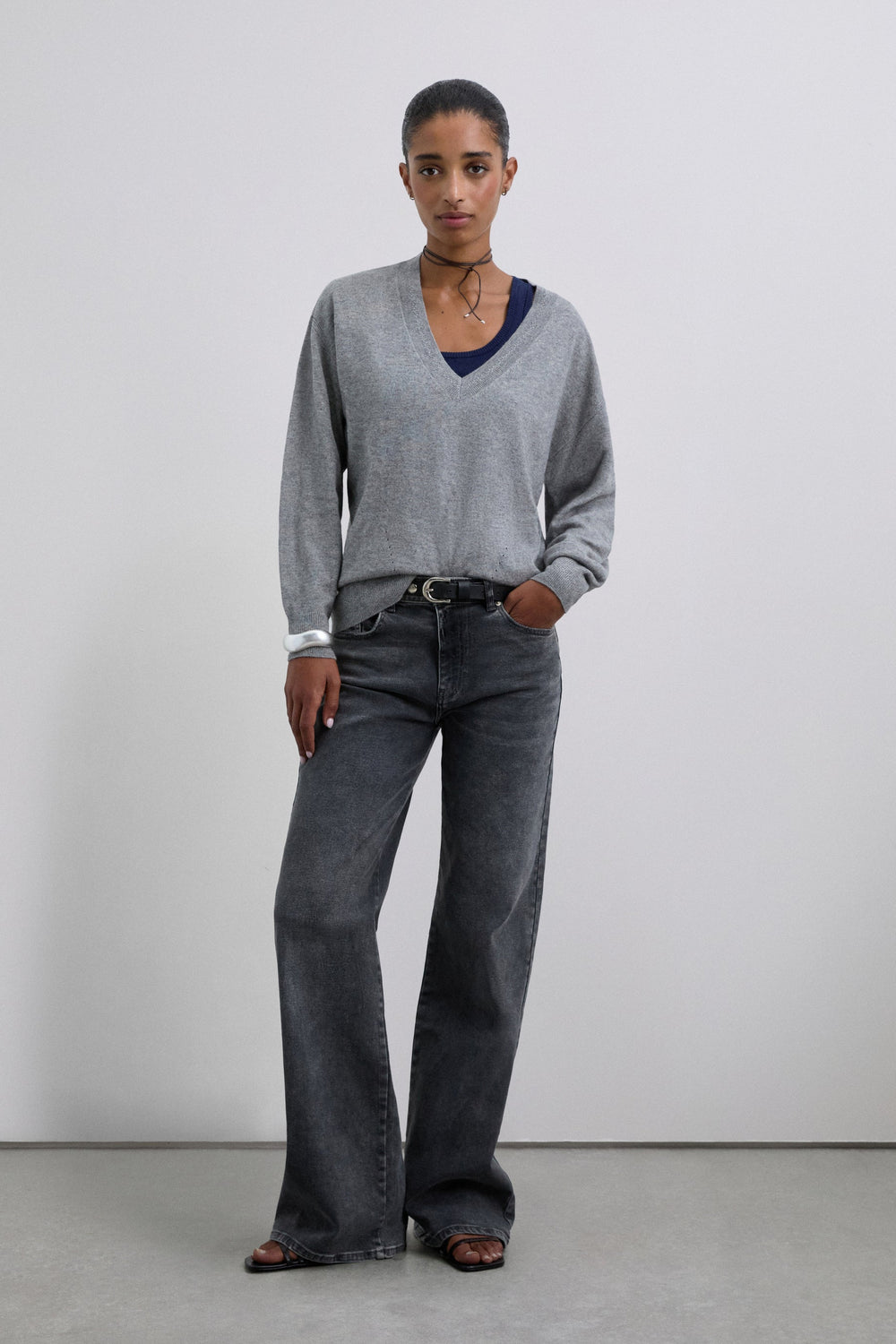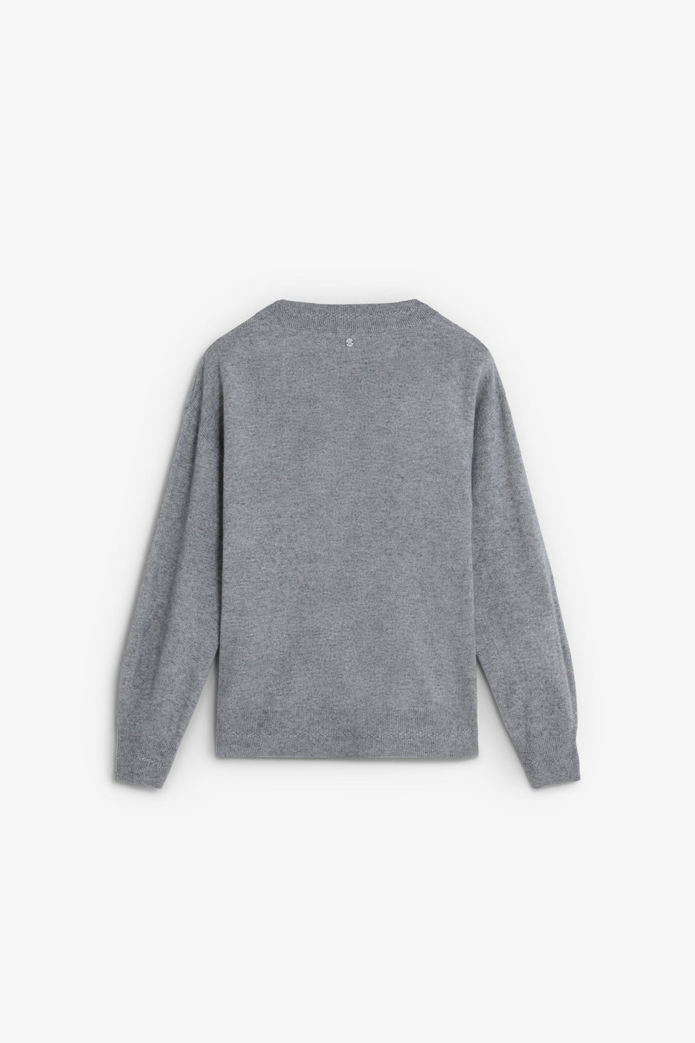 Sweater made of wool. V-neckline with a slightly loose fit. Mini hole details near the top hem. Ribbed finish on collar, cuffs and belt. Metal logo plate detail on back.