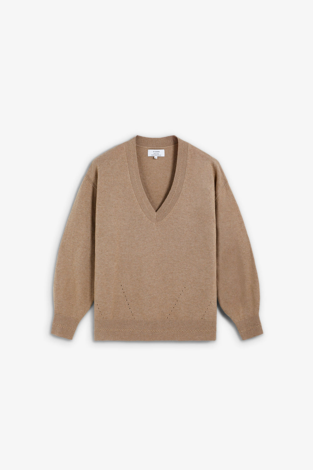 Sweater made of wool. V-neckline with a slightly loose fit. Mini hole details near the top hem. Ribbed finish on collar, cuffs and belt. Metal logo plate detail on back.