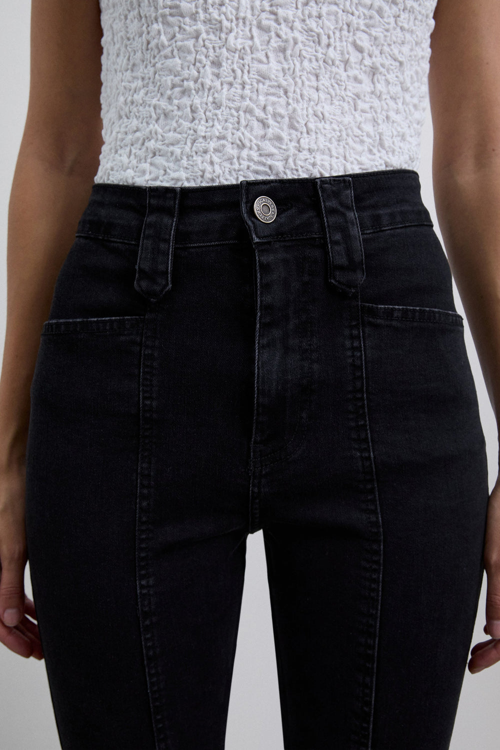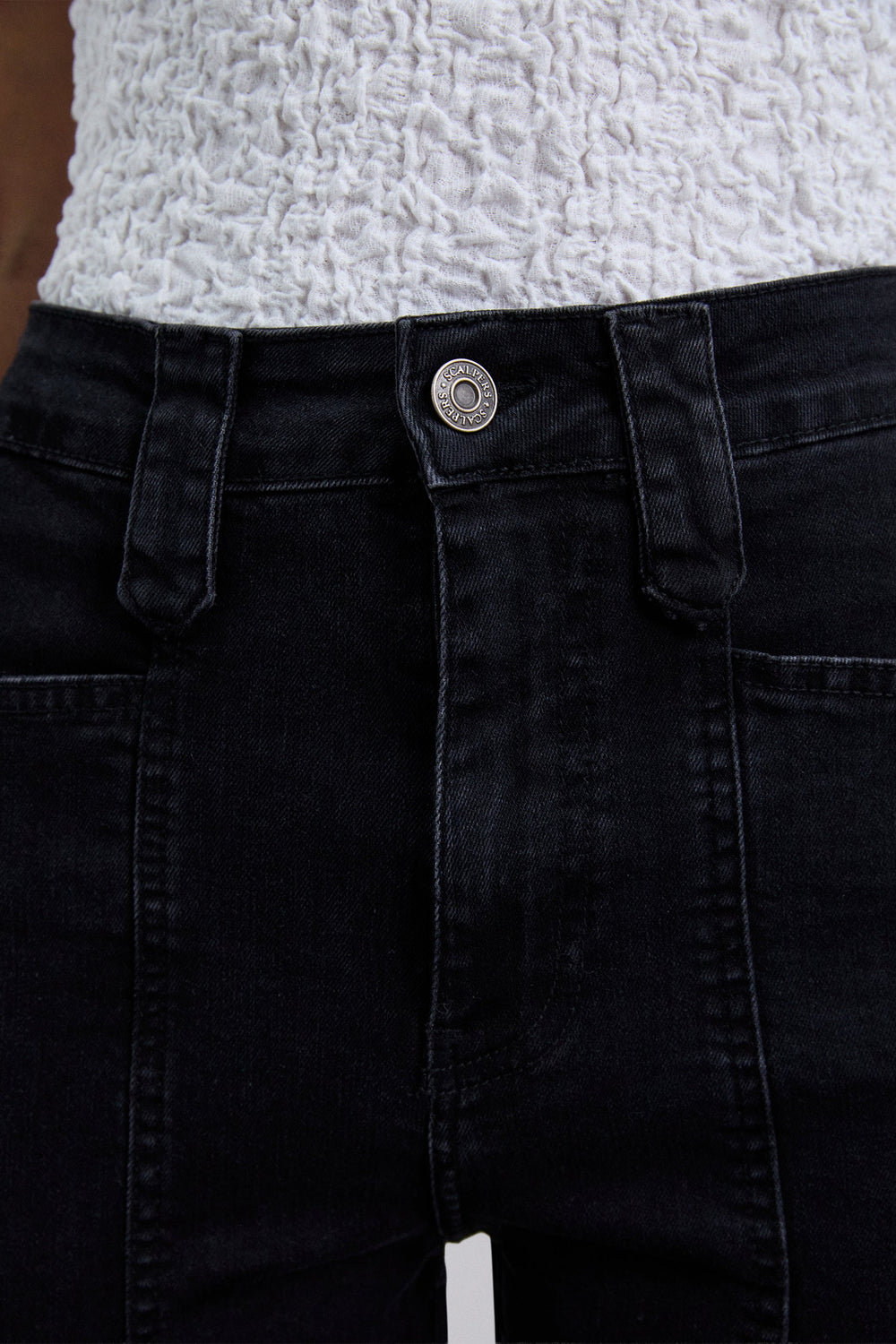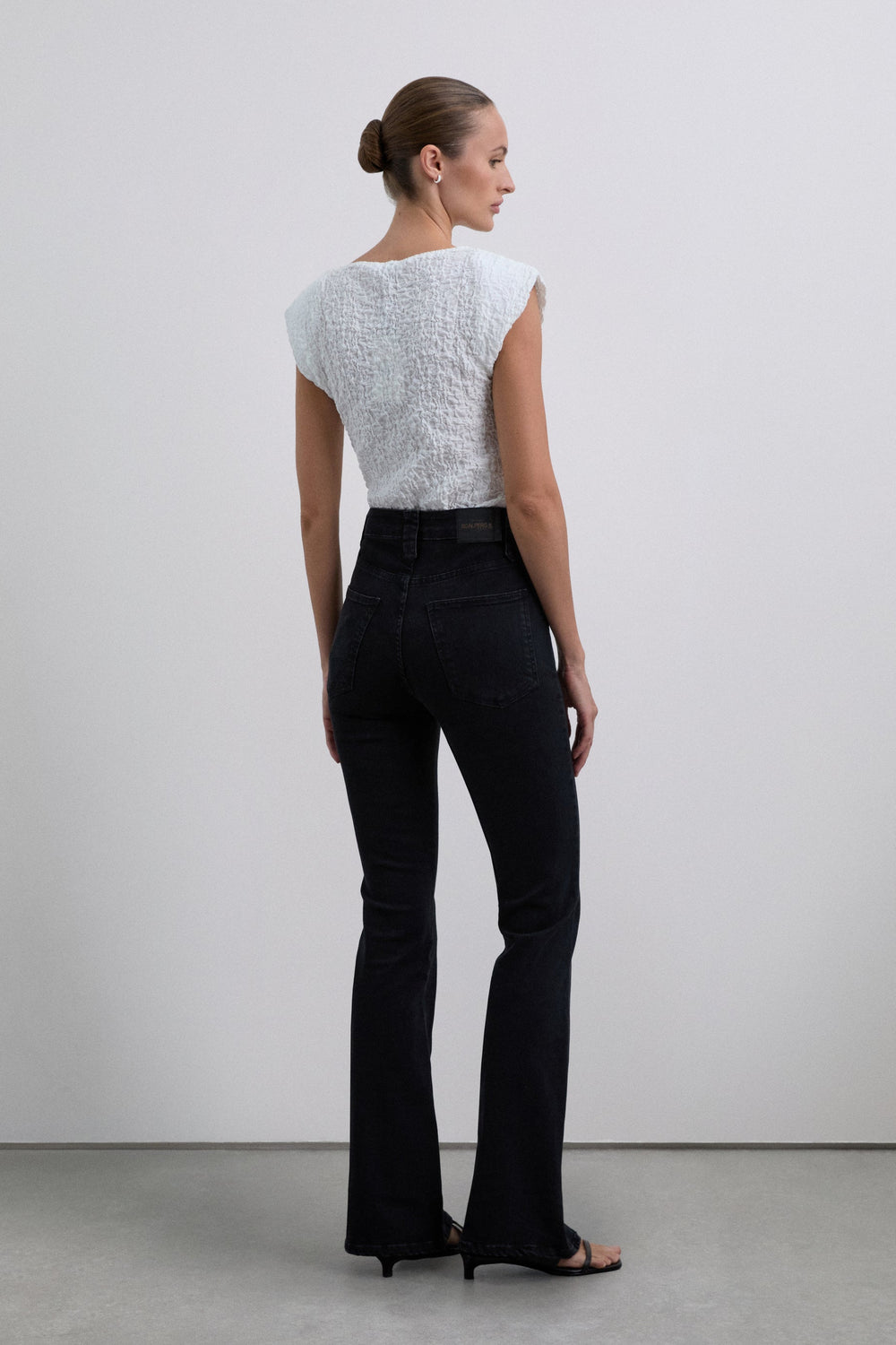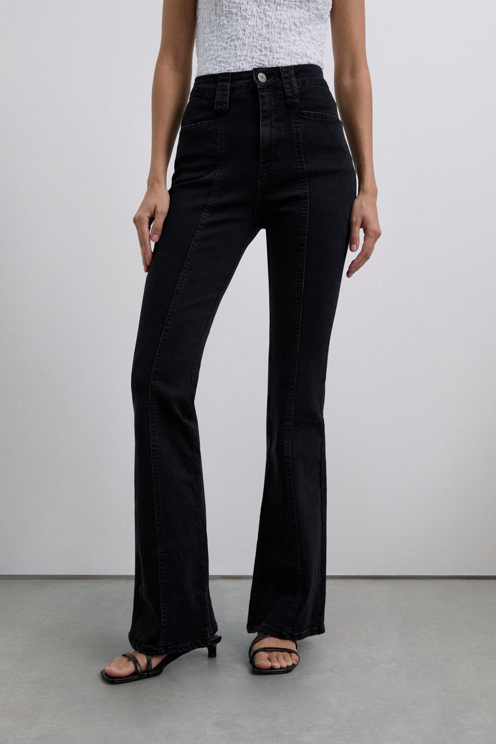 High-waisted bootcut jeans. Centre seam at the front. Front and back pockets. Button fastening and belt loops. Logo label detail at the back.