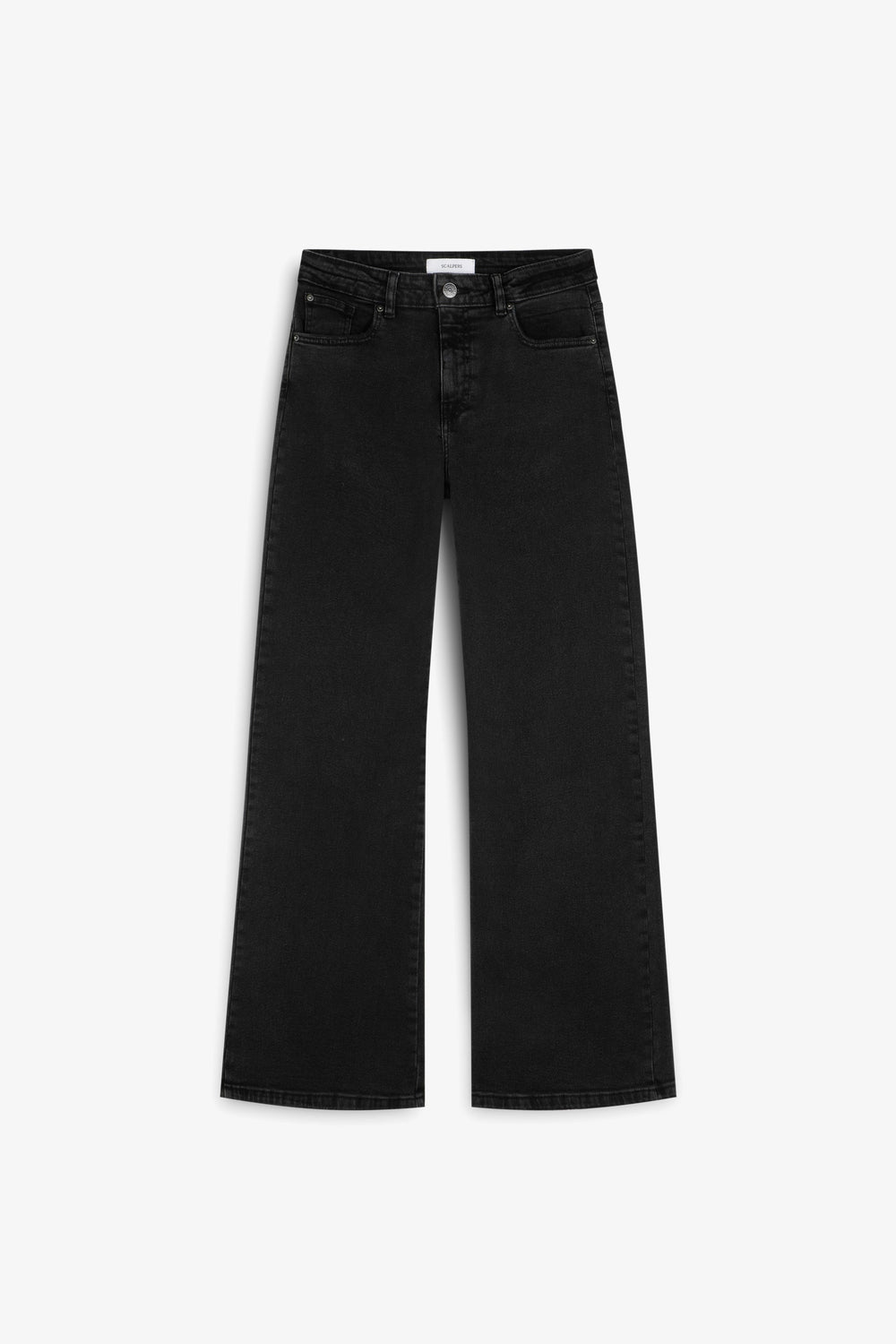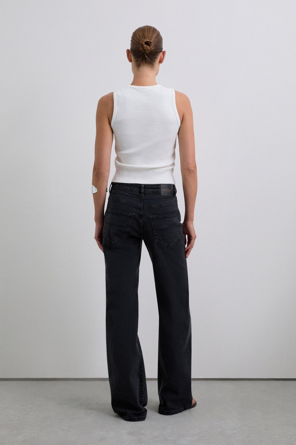 Black mid-rise trousers with belt loops. Full length, front zip and button fastening. Back and front pockets.
