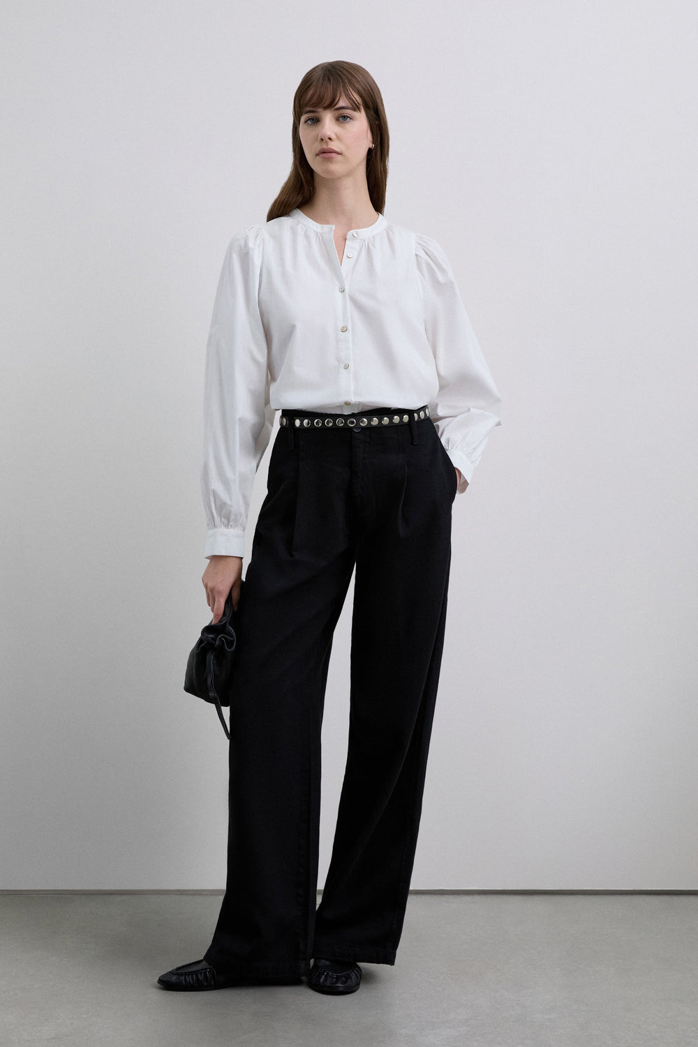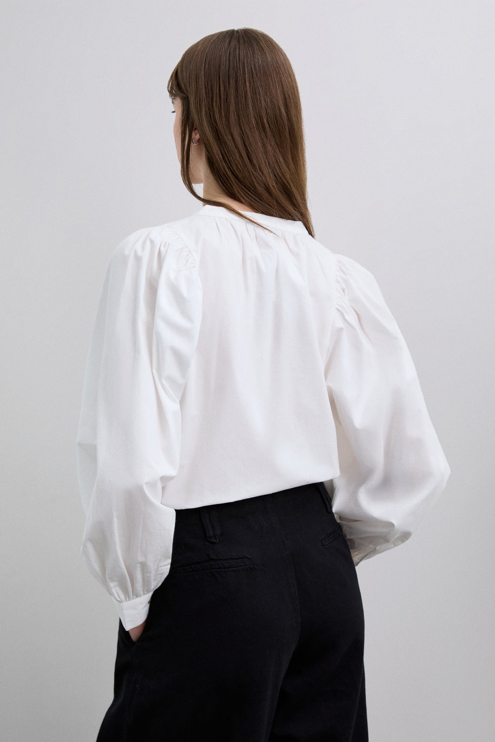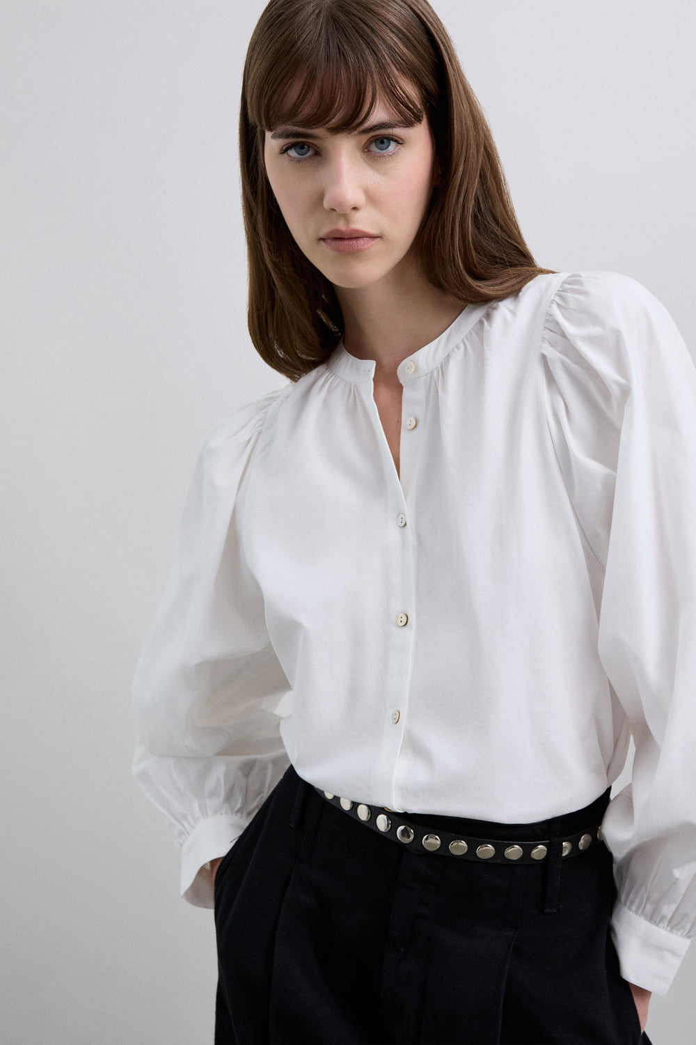 Shirt made of 100% cotton. Regular fit. Stand-up collar. Long puffed sleeves with buttoned cuffs. Mother-of-pearl button fastening.