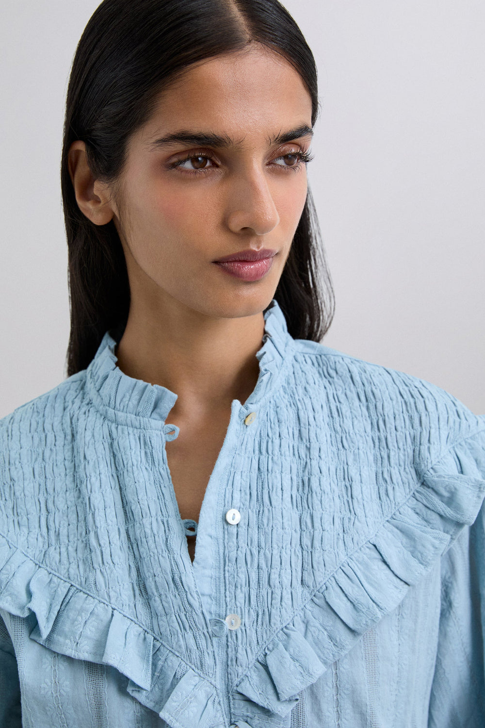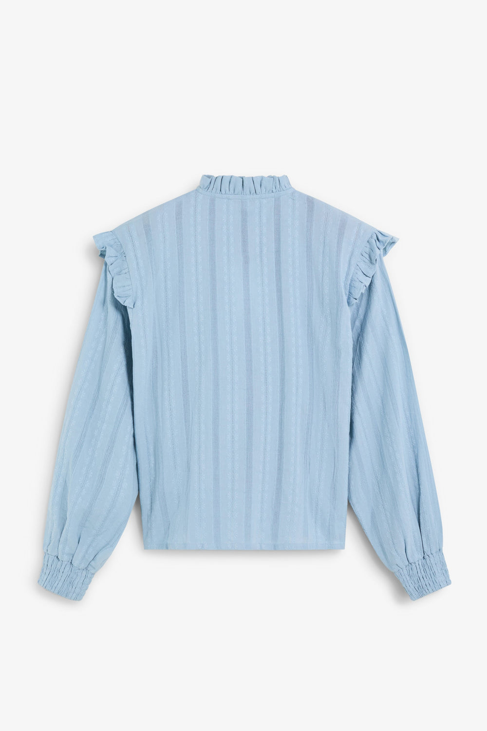 Long sleeve blouse made of 100% cotton. Classic collar and ruffle in smocked fabric. Mother-of-pearl buttons.