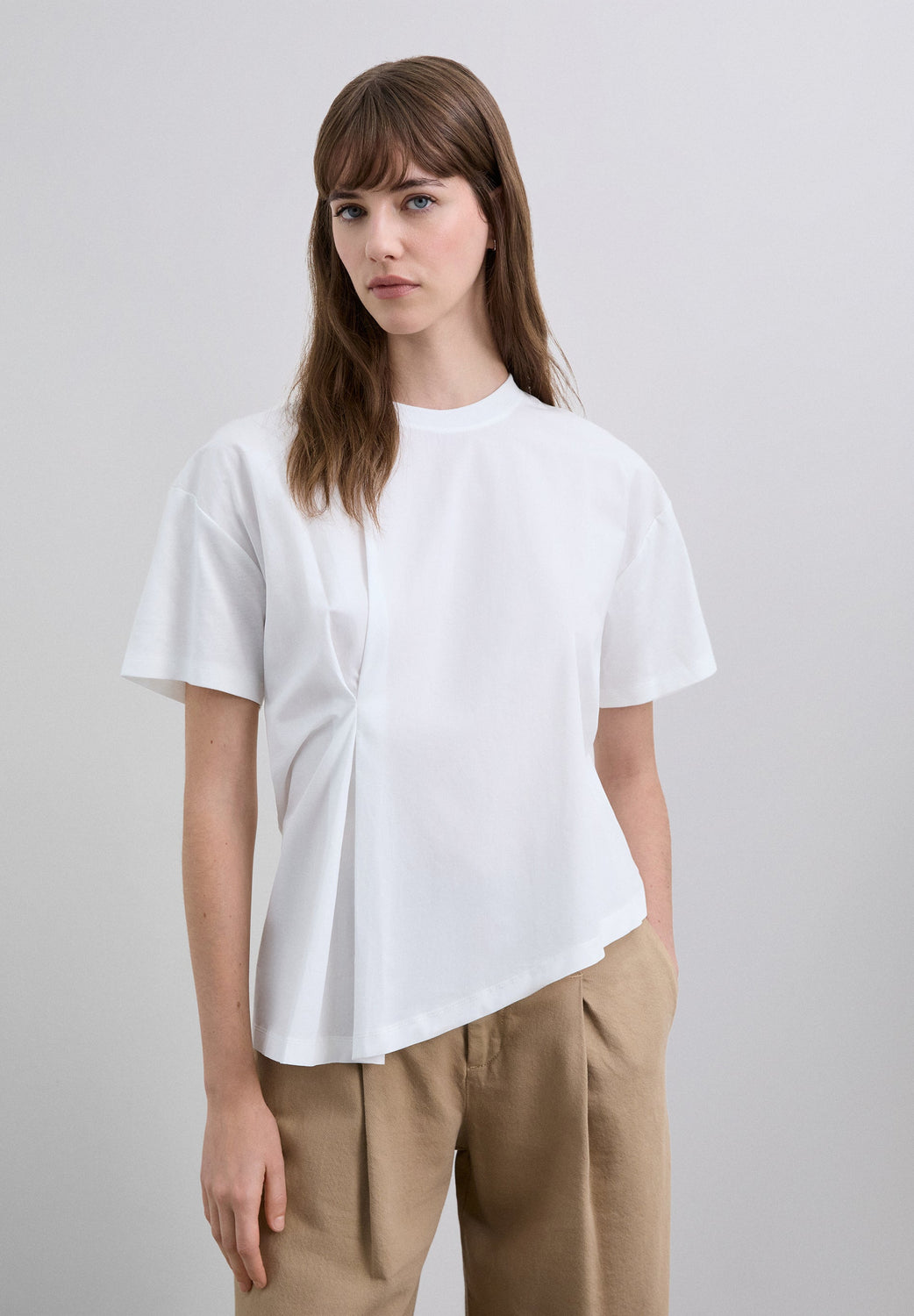 Short sleeve asymmetric-style T-shirt made of 100% BCI cotton. It features a round neck and an overlapping front panel that creates a draped side effect. Back fastening with small opening.