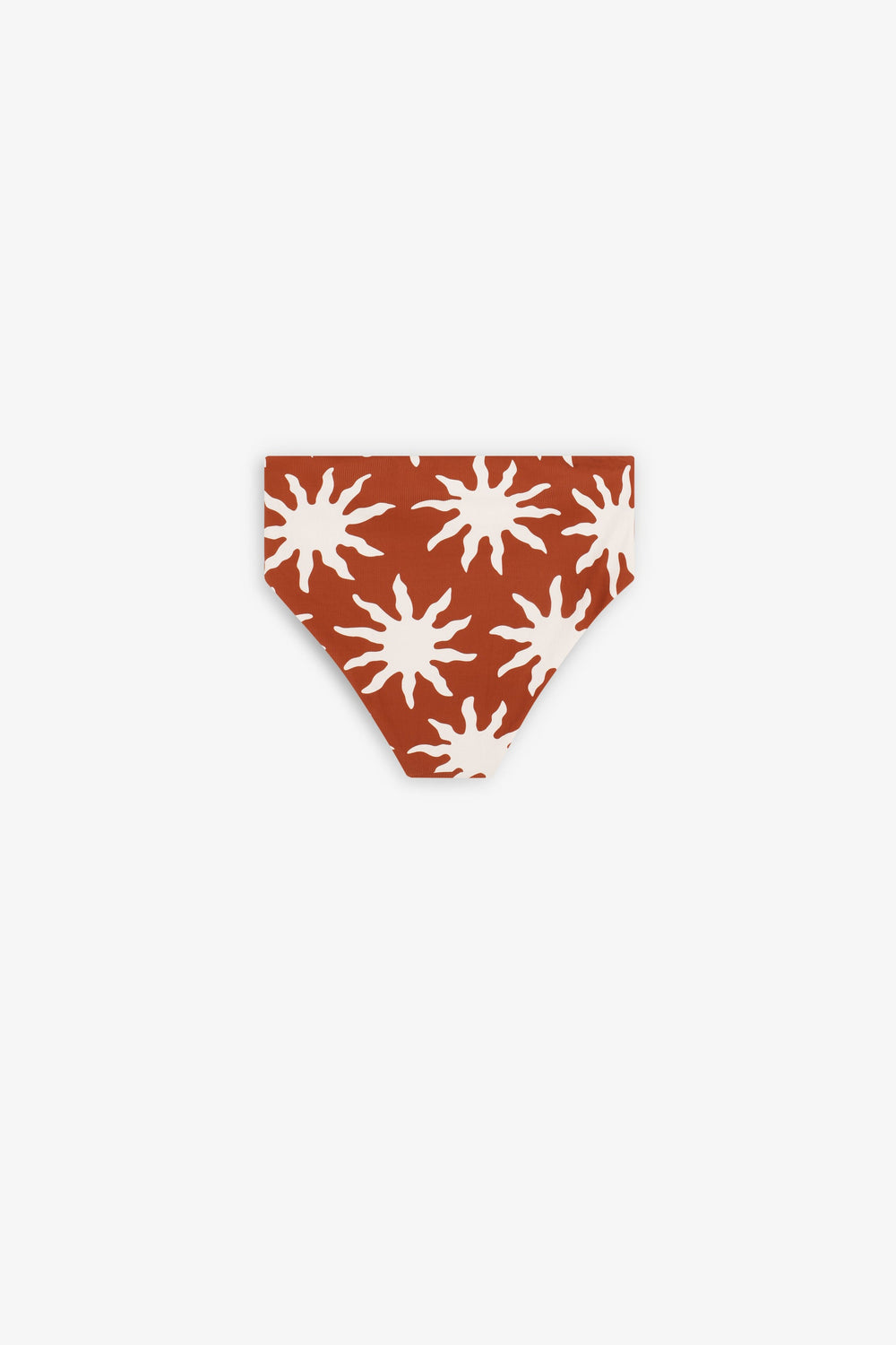 This bikini is designed in collaboration with Scalpers and belongs to the ROBIN x SCALPERS collection. This is a triangle bikini with sun print in ecru on a terracotta background in a ribbed structure. With removable foam pads and chest strap. Adjustable shoulder straps and a multi-position hook-and-eye fastening at the back for a better fit. High-cut, fully lined bottom.