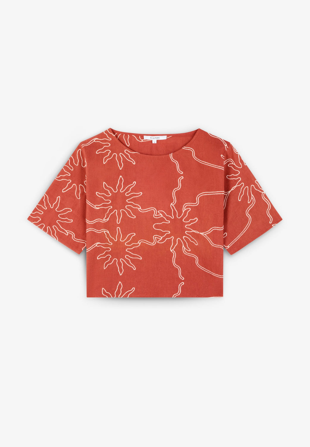This top is designed in collaboration with Scalpers and belongs to the ROBIN x SCALPERS collection. Organic cotton and linen top. Short sleeve. Round neck. Contrast embroidered motifs.