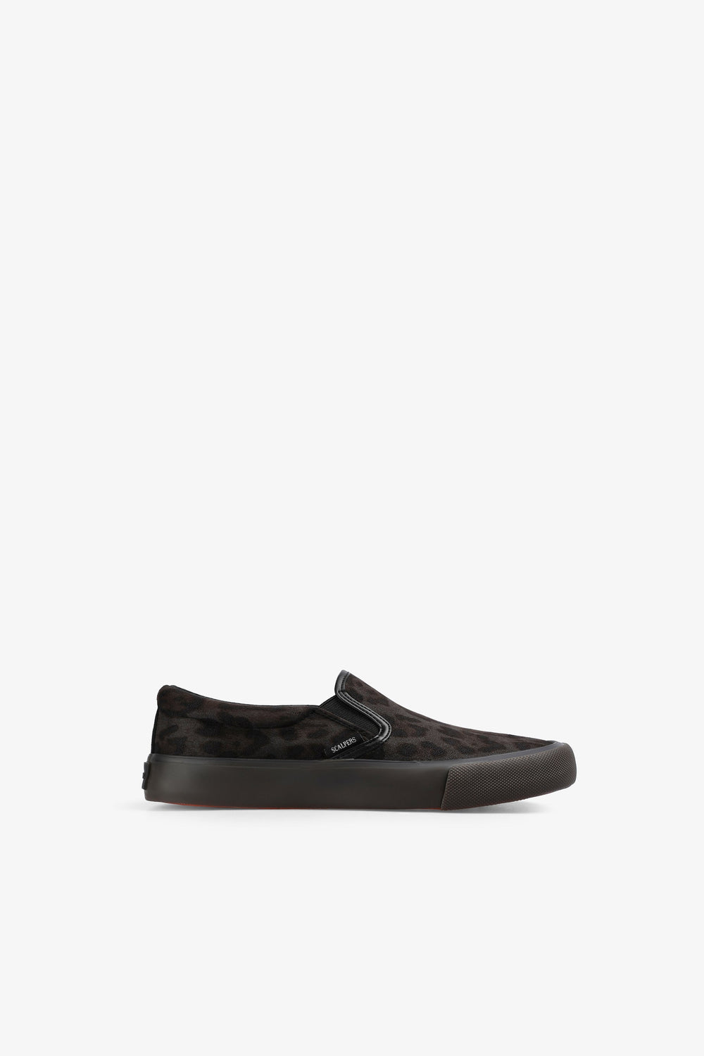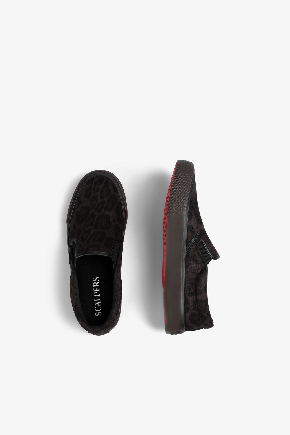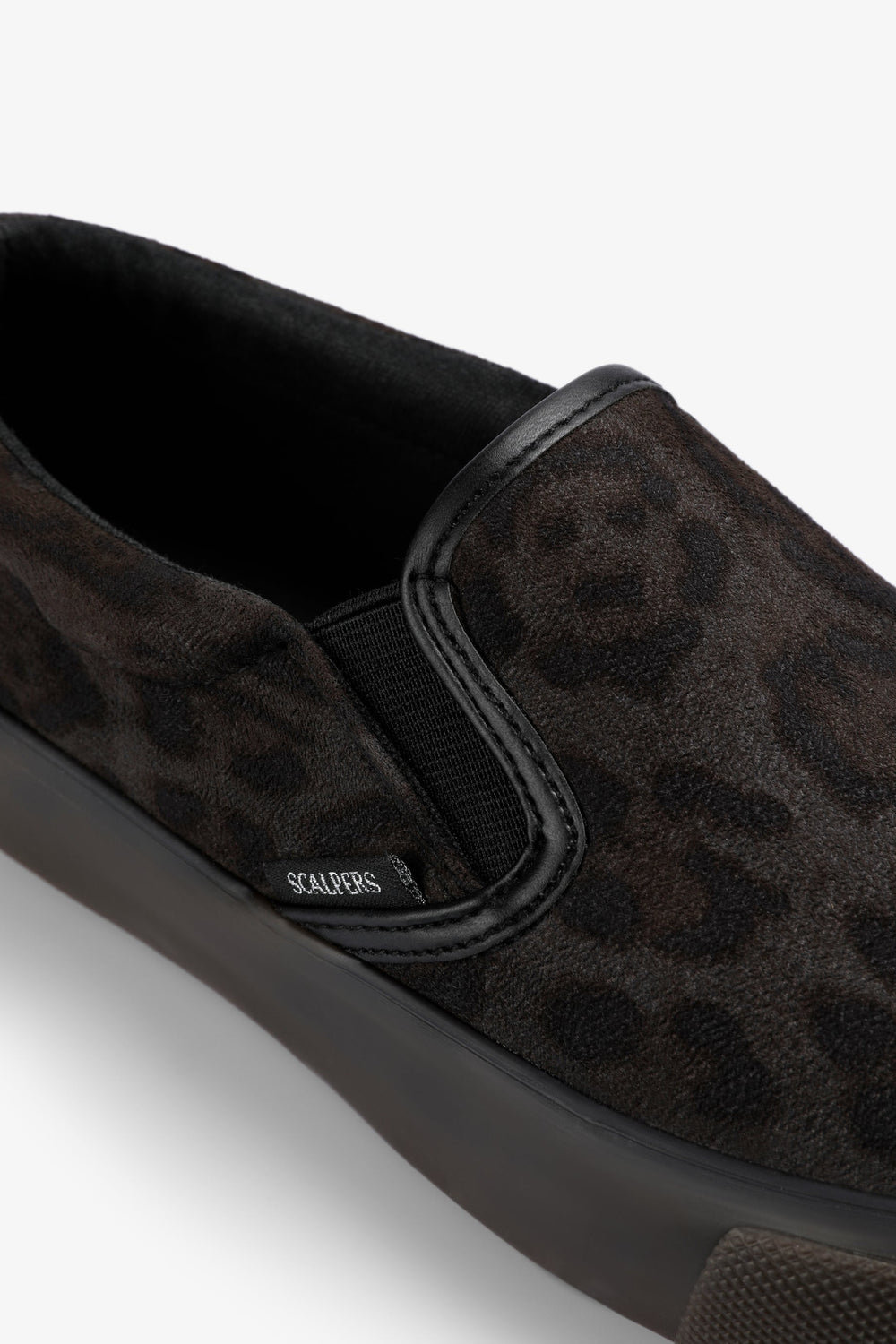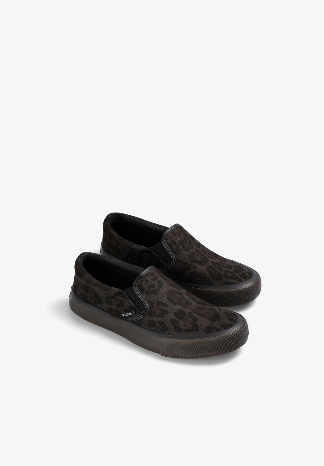 Leopard print slip-on sneakers. No laces. Contrast sole. Label detail on the side.