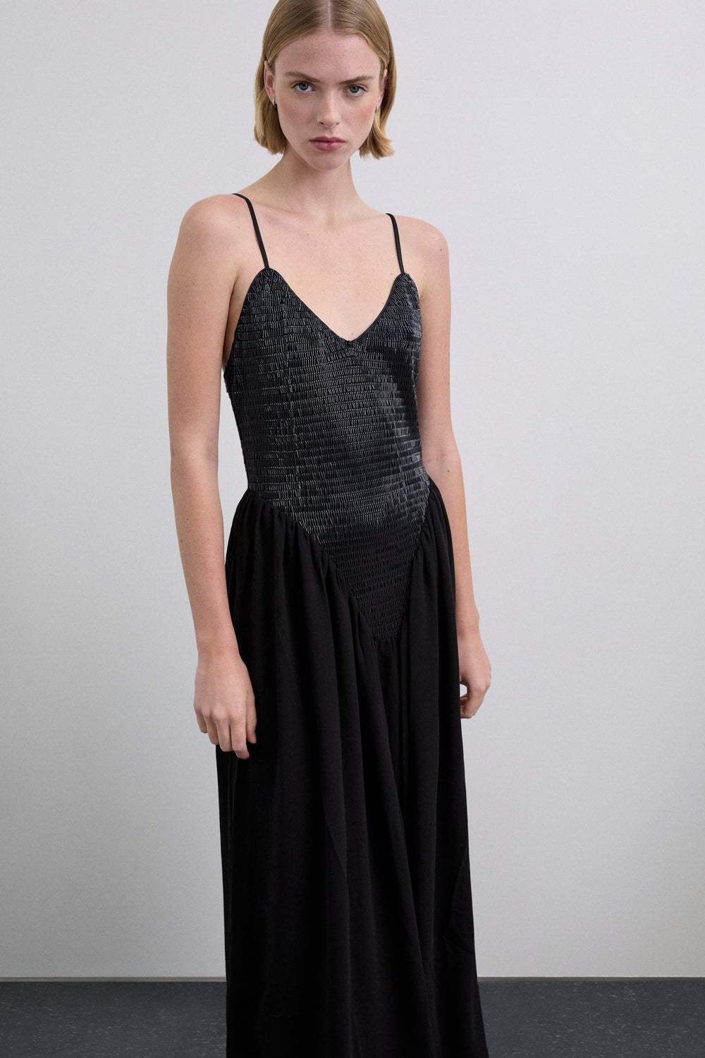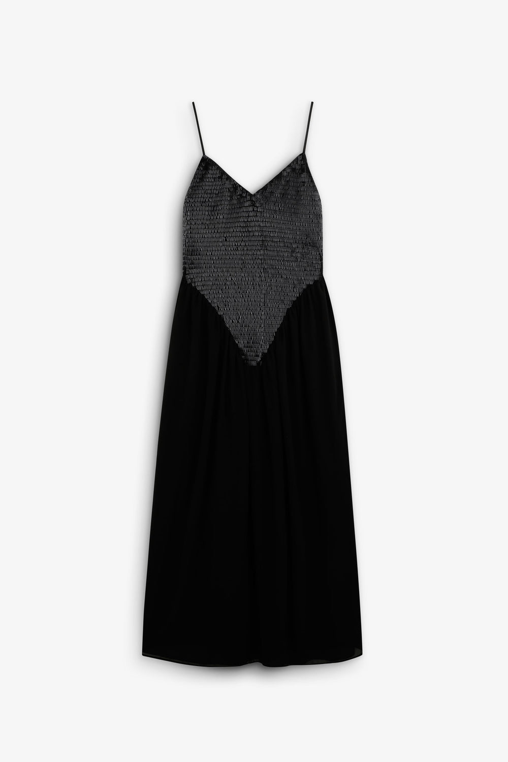 Dress made of flowing fabric and sequins. Sequined bodice, V-neckline and thin adjustable straps. Skirt with a slight flounce.