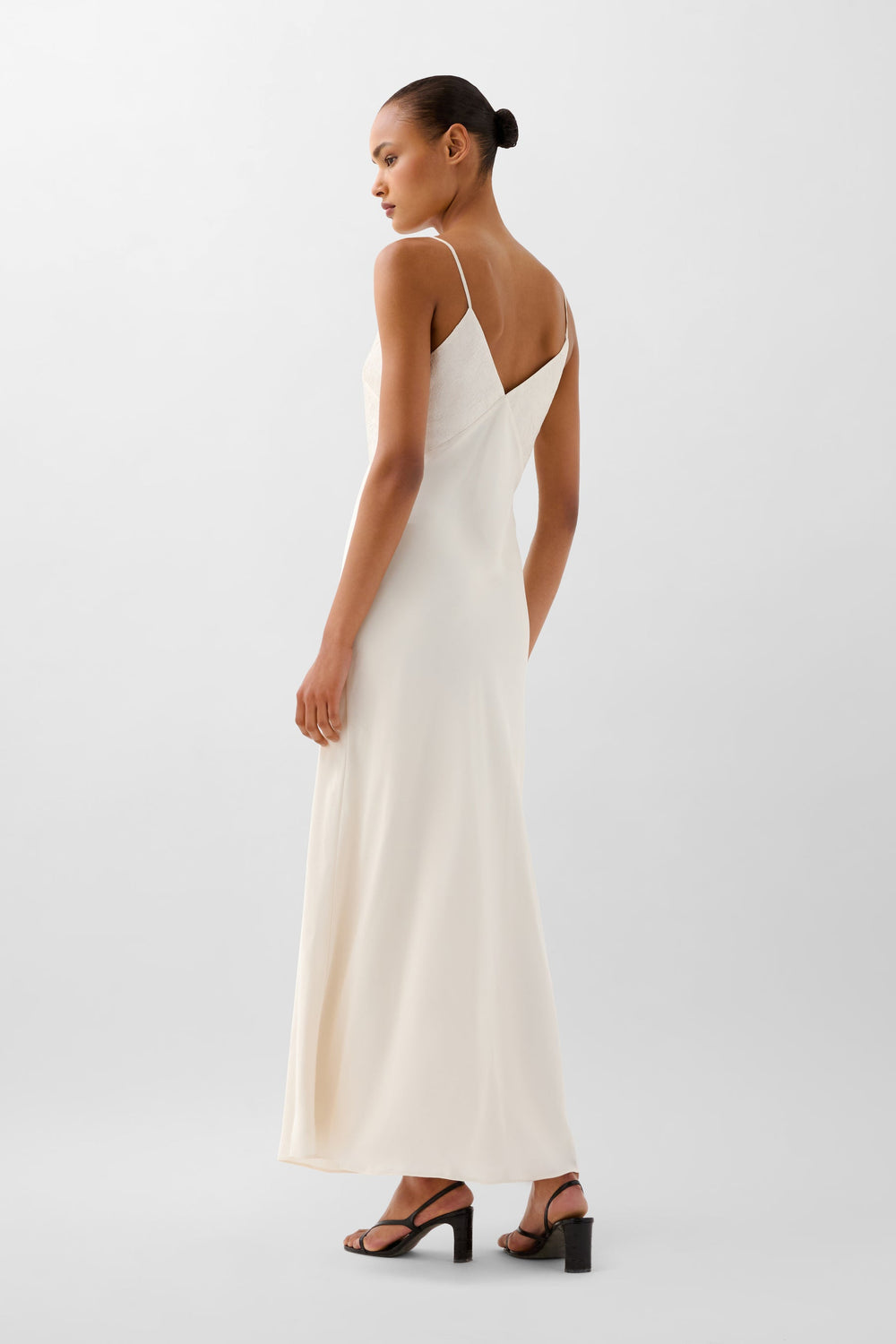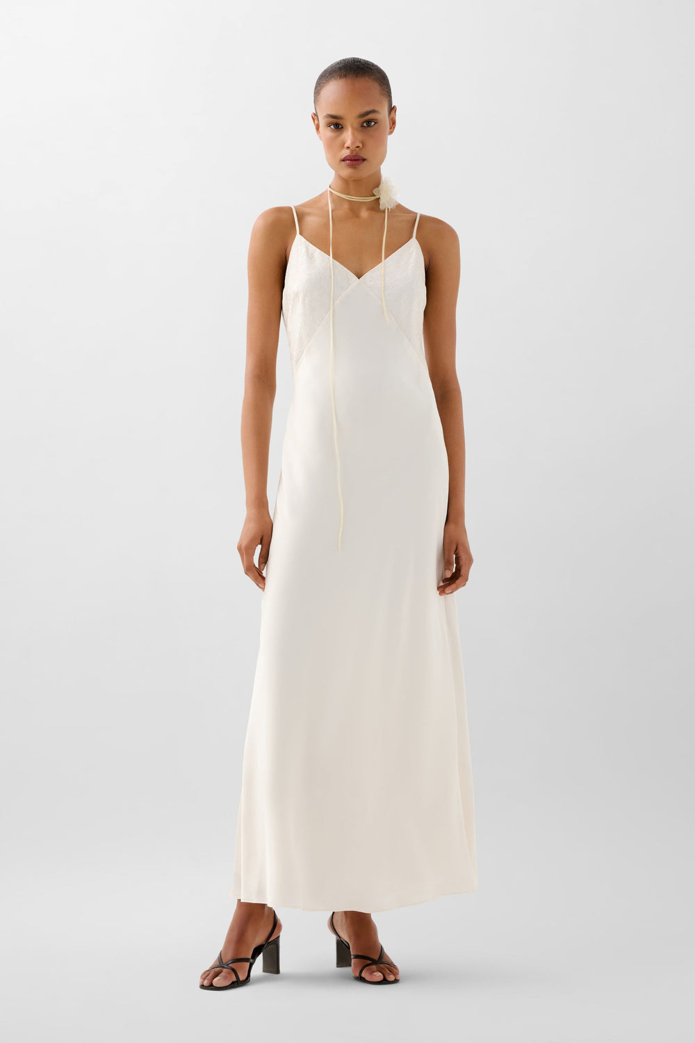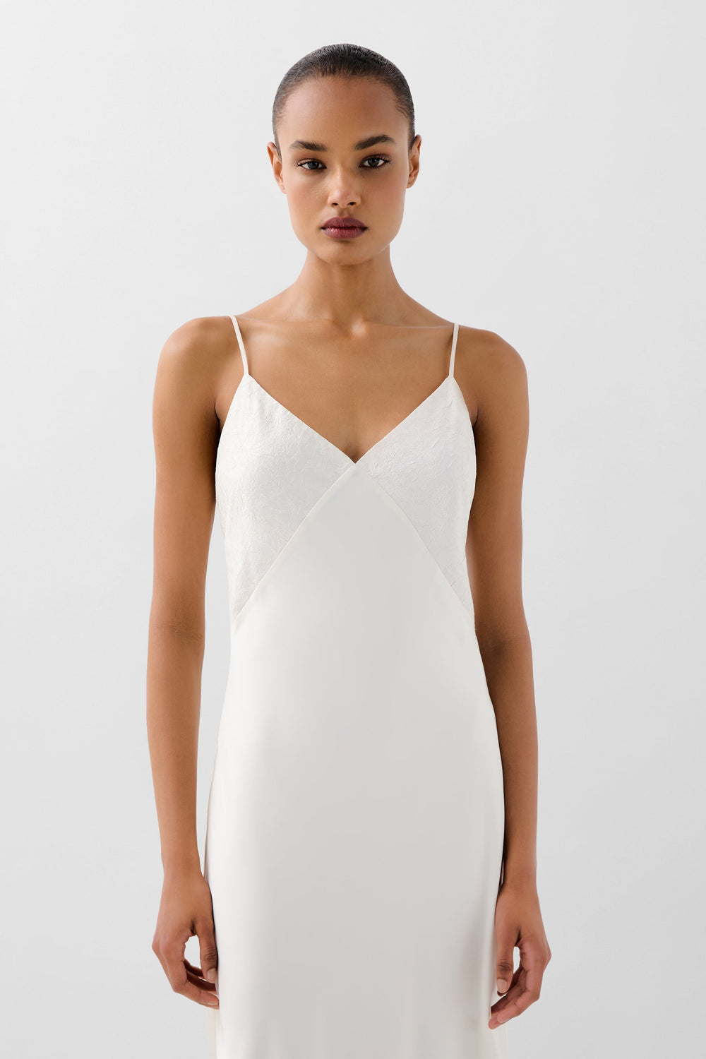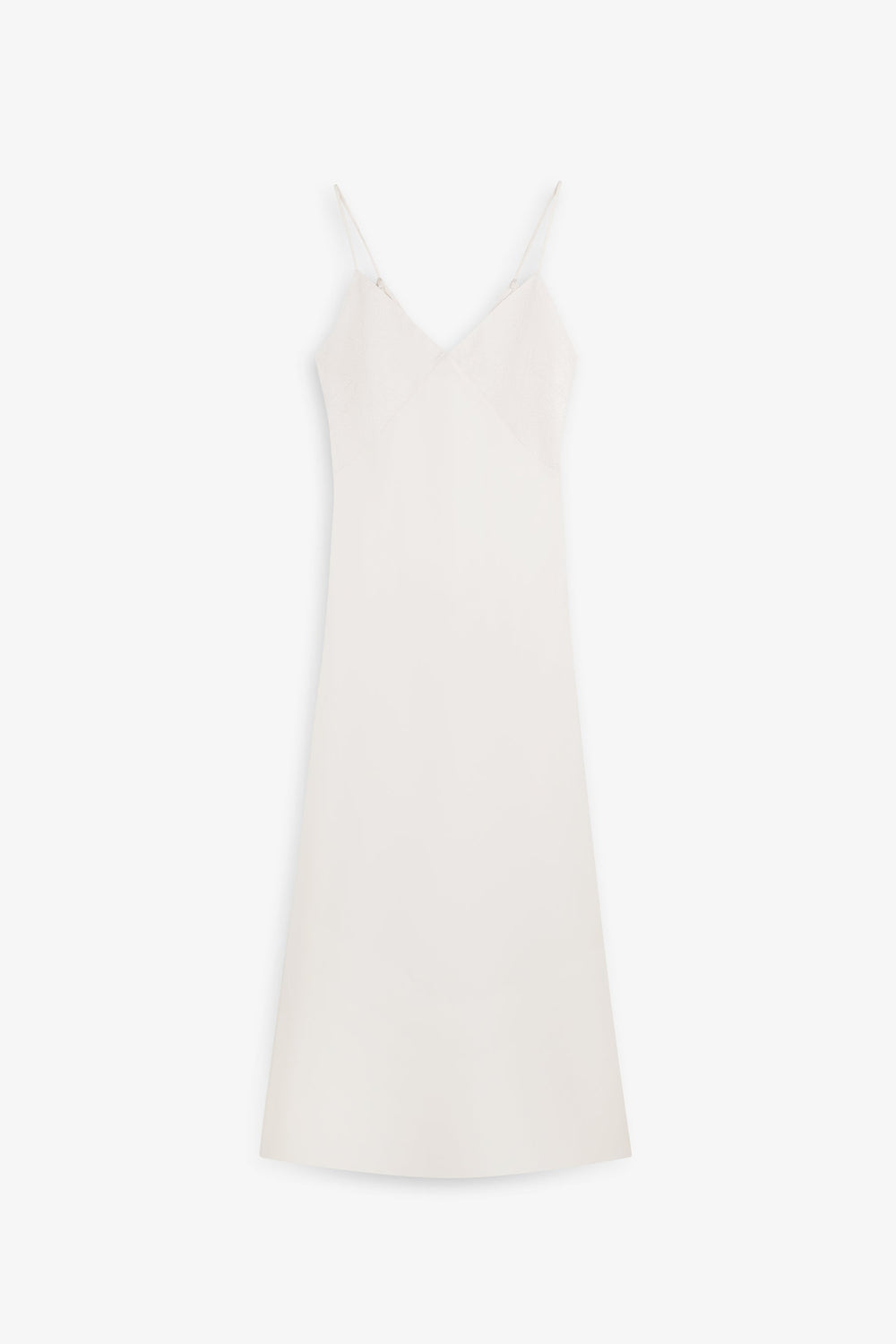 Dress made of flowing textured fabric. Slim fit, long cut, with adjustable thin straps. V-neckline.