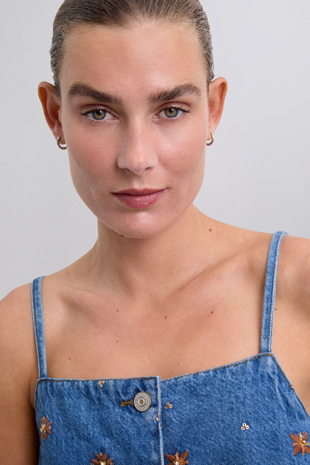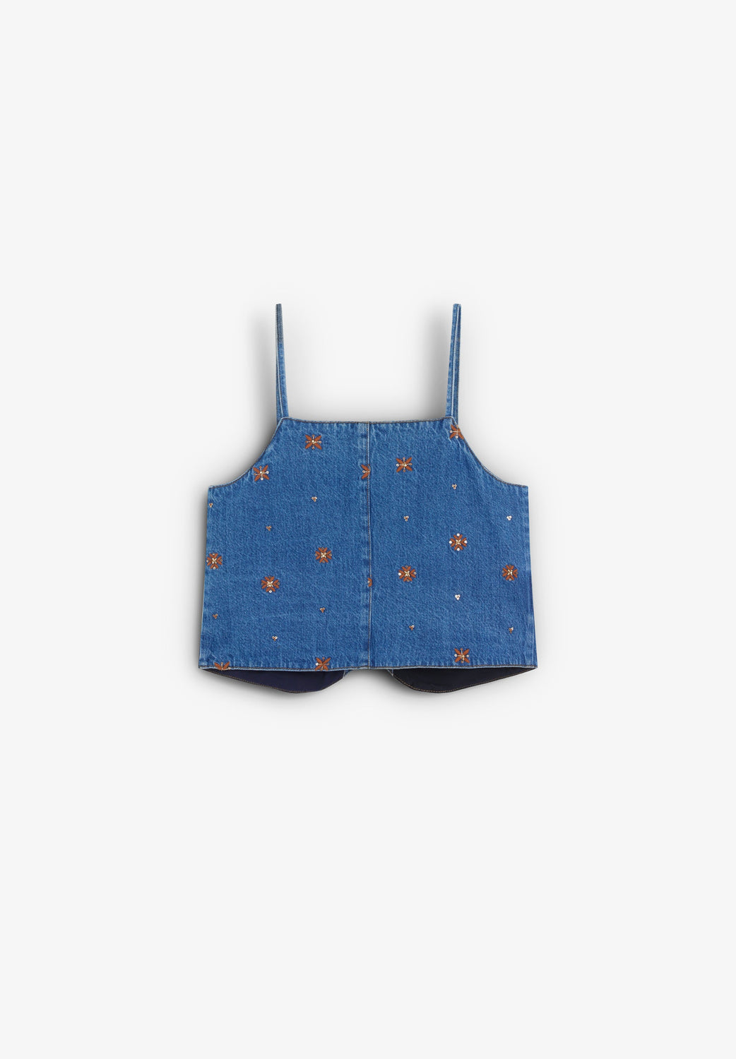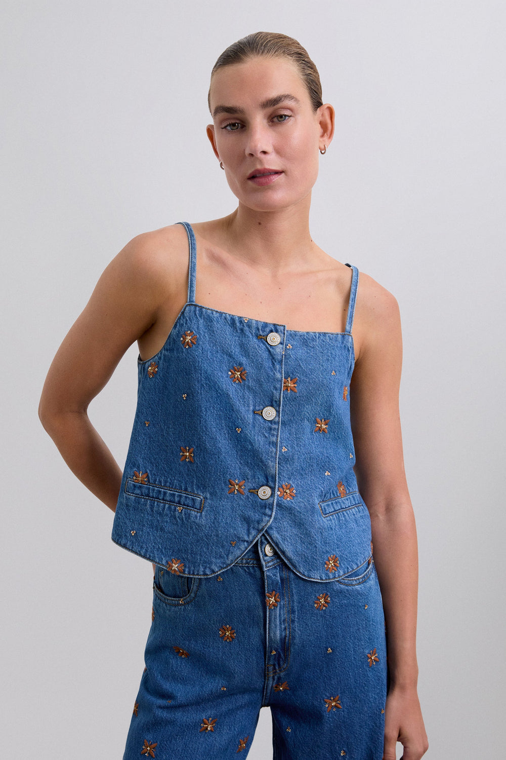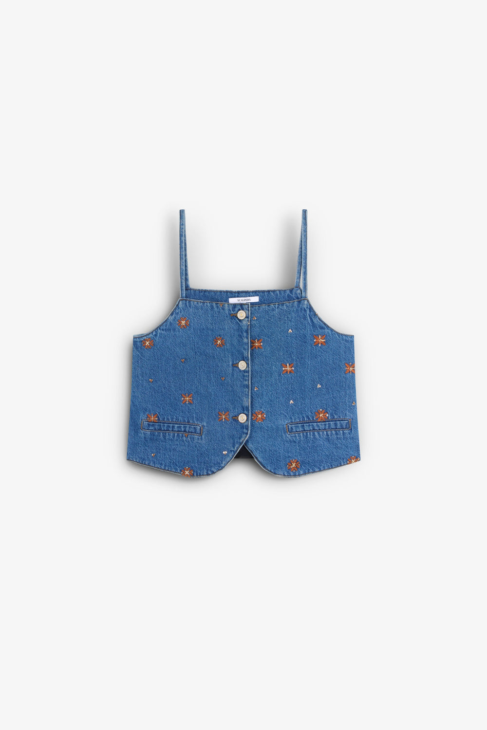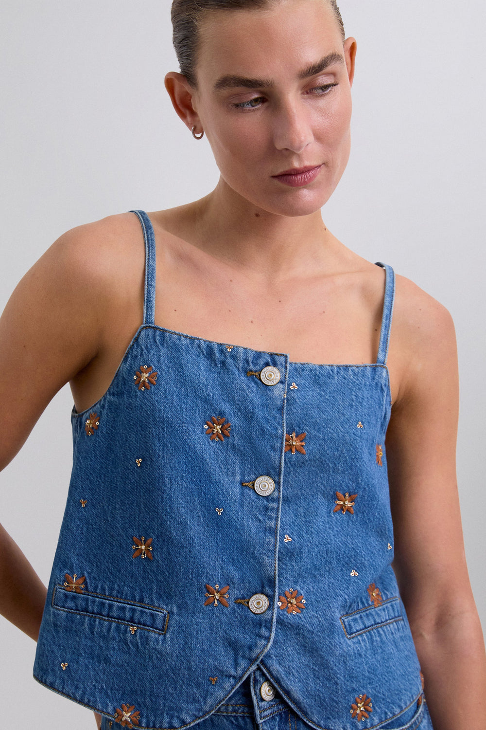 Vest top made of cotton. Embroidered flowers motif. Front button fastening. Front pockets.