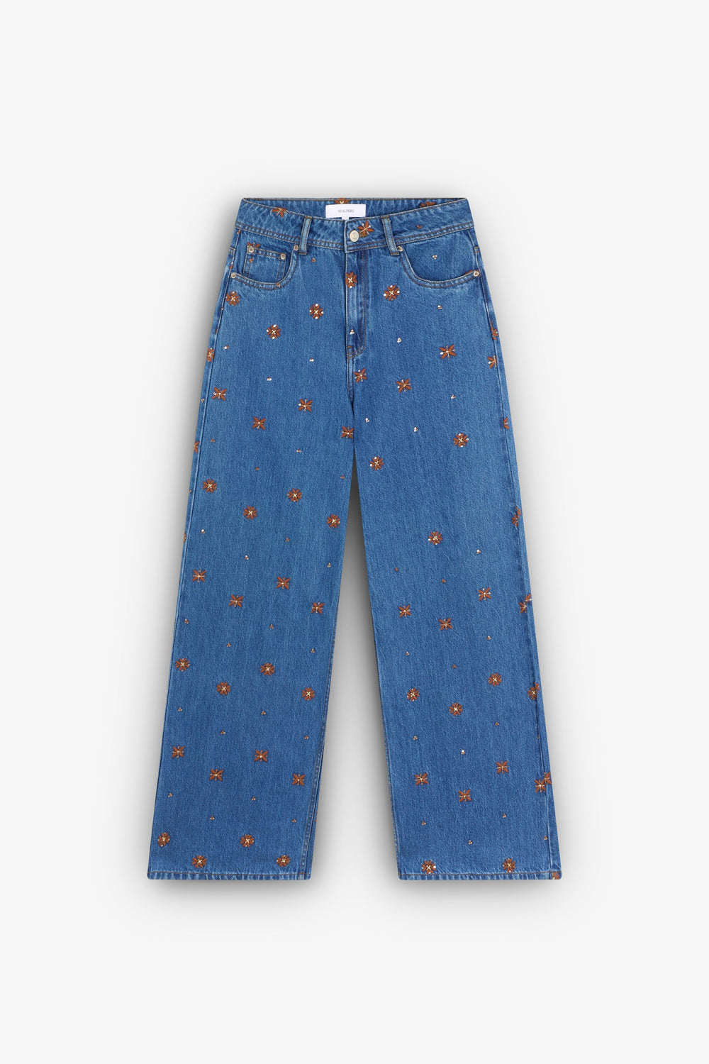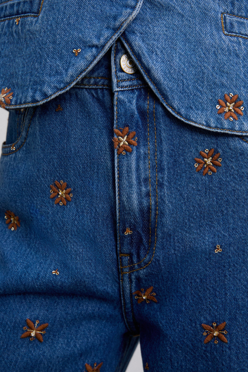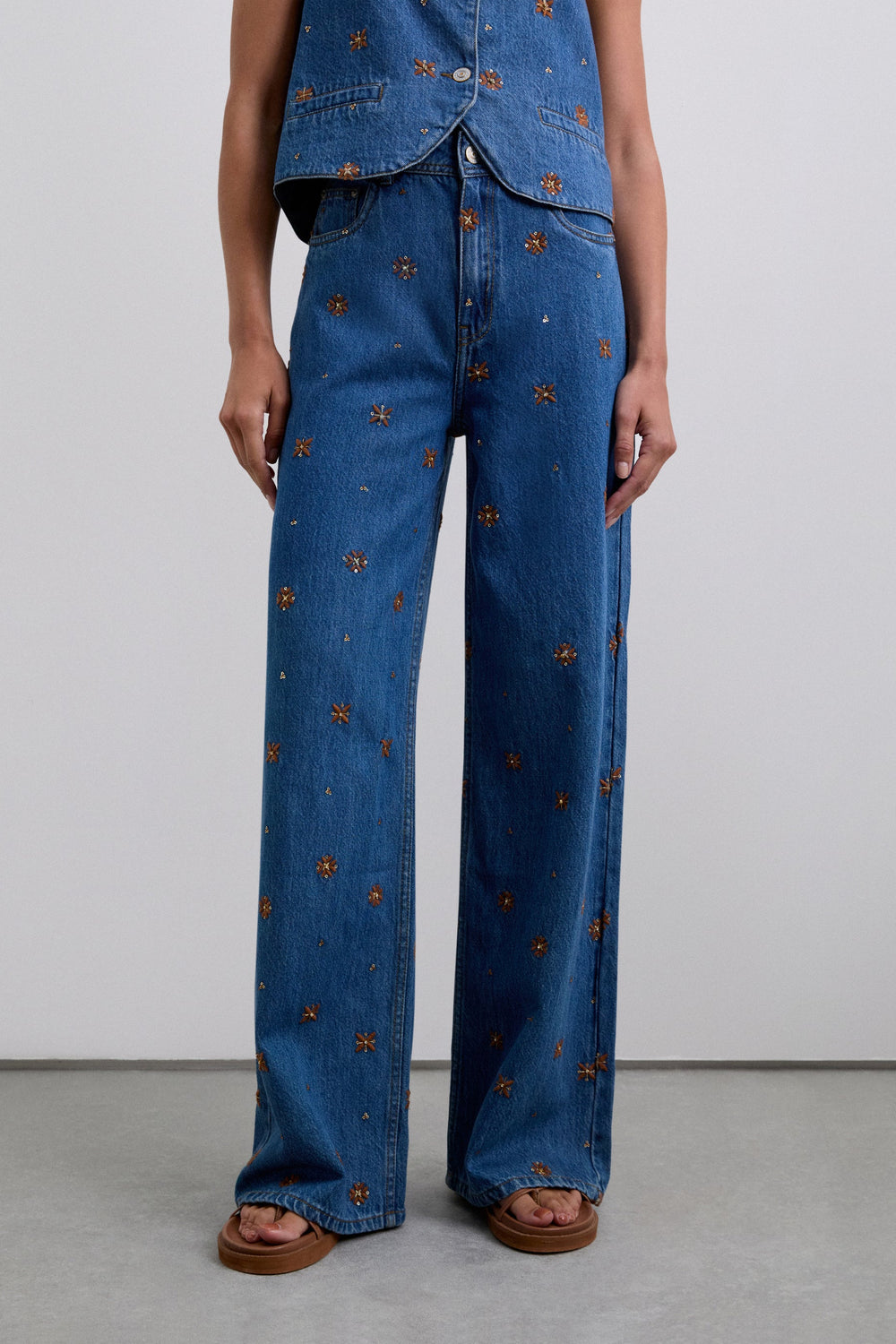 Straight jeans with high waist. Embroidered flower details. Front and back pockets. Button fastening and belt loops. Logo label detail at the back.