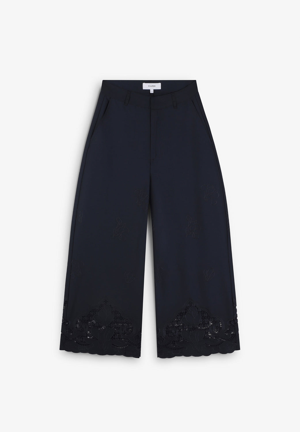 Long culottes. Openwork embroidery all over the leg, especially around the hem. Front slant pockets. Slightly flared.