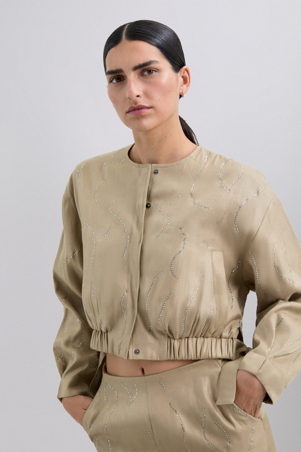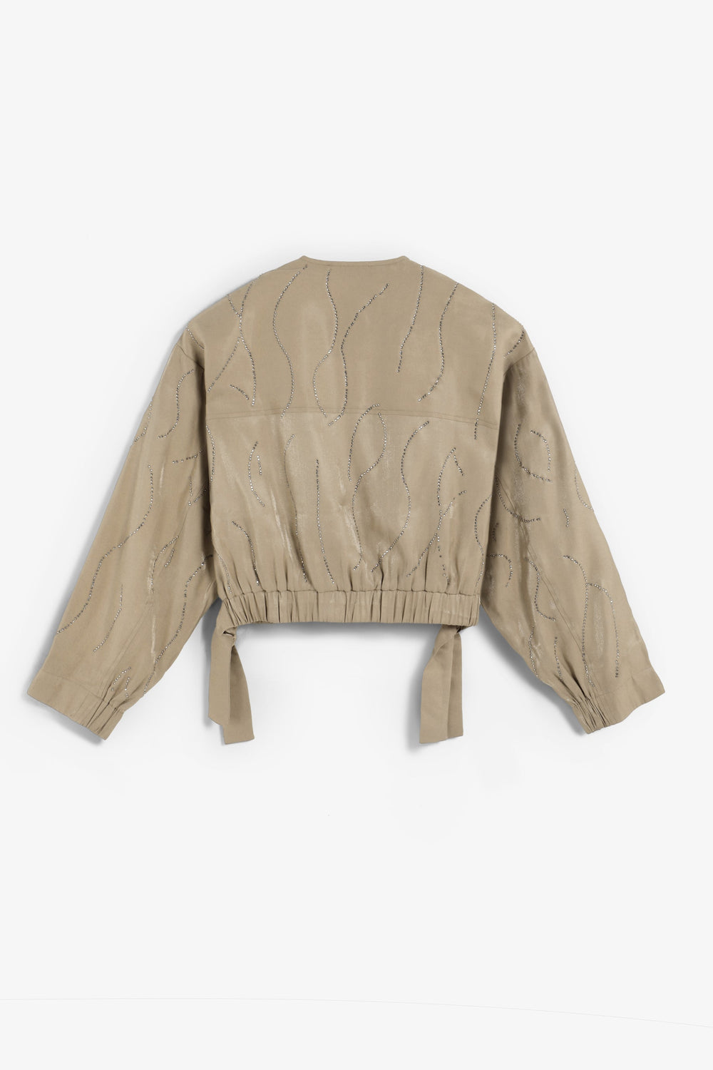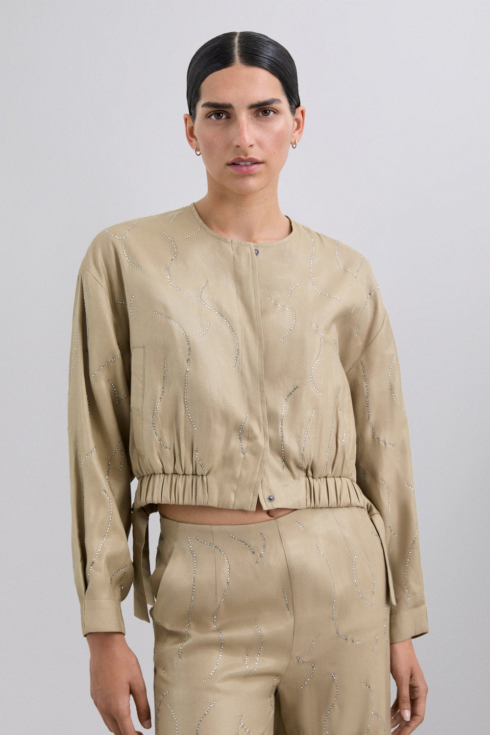 Bomber jacket with rhinestone detailing. Front zip and button fastening. Round neck. Gathered cuffs and hem. Flowing fabric with satin finish. Elasticated waistband with side tie details.
