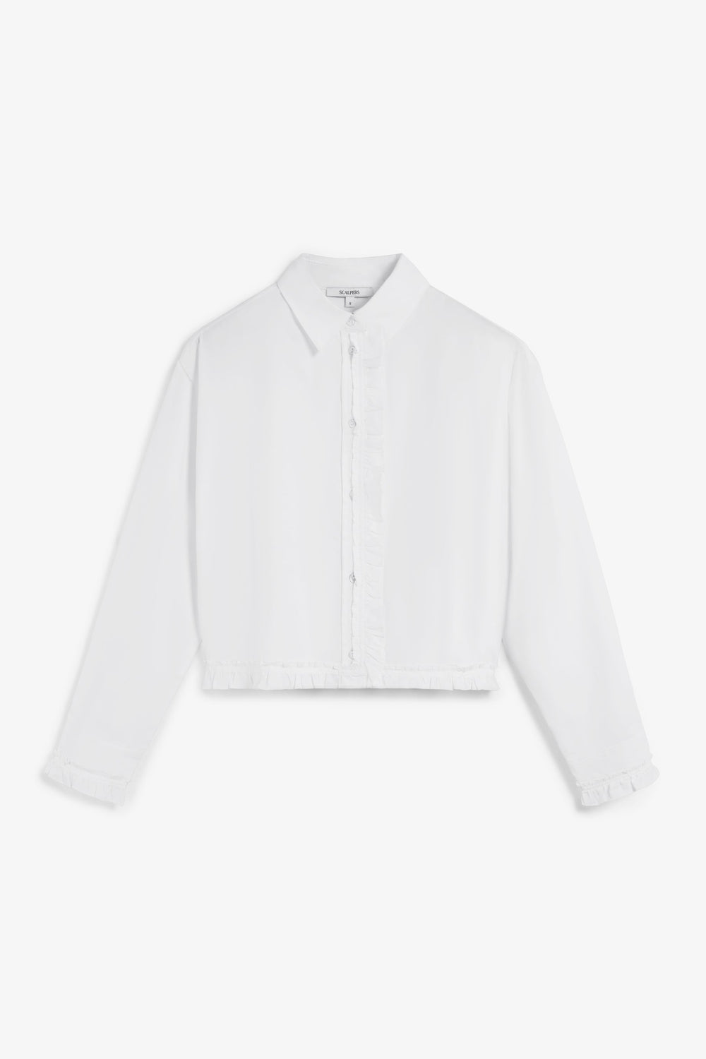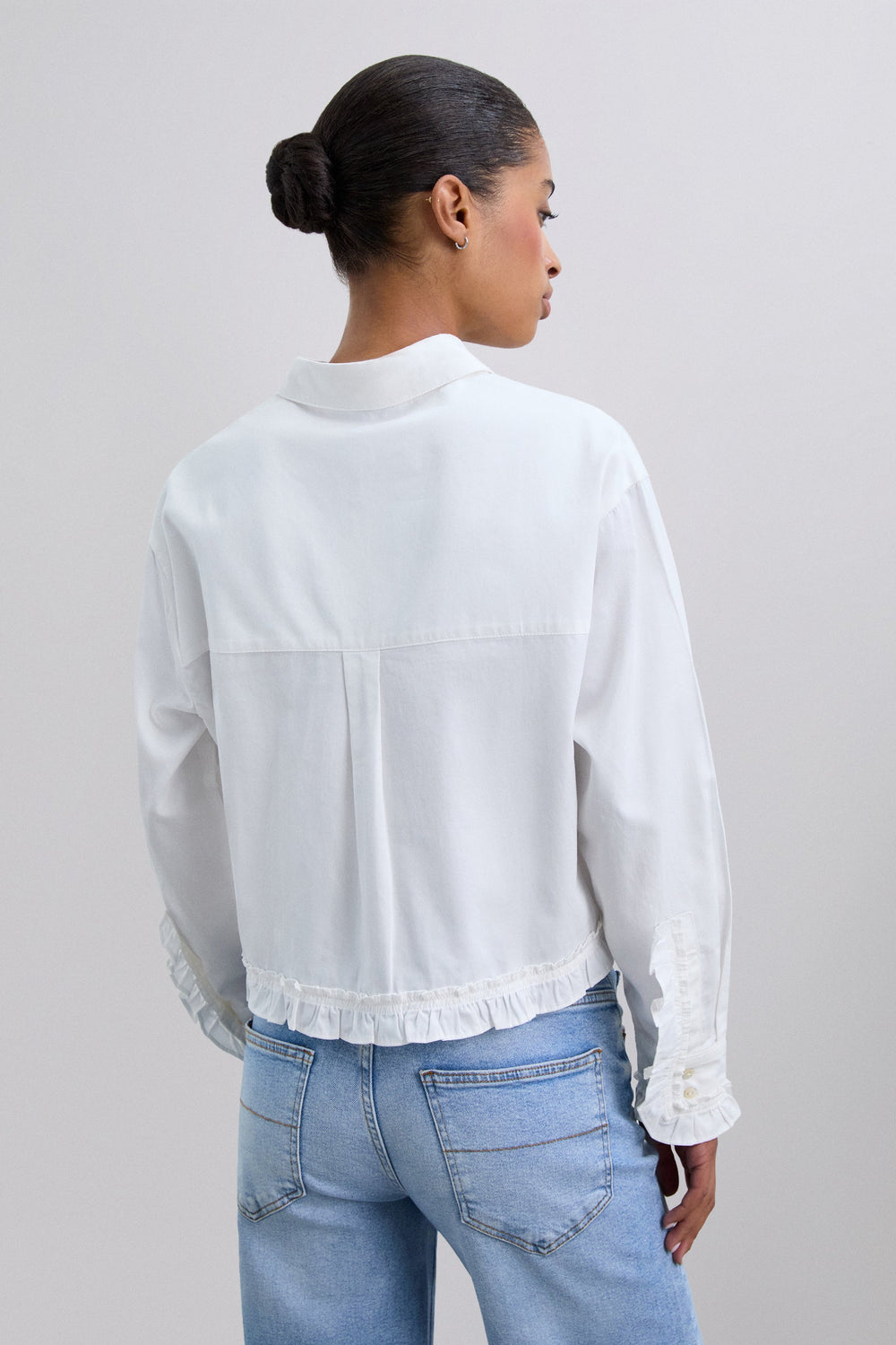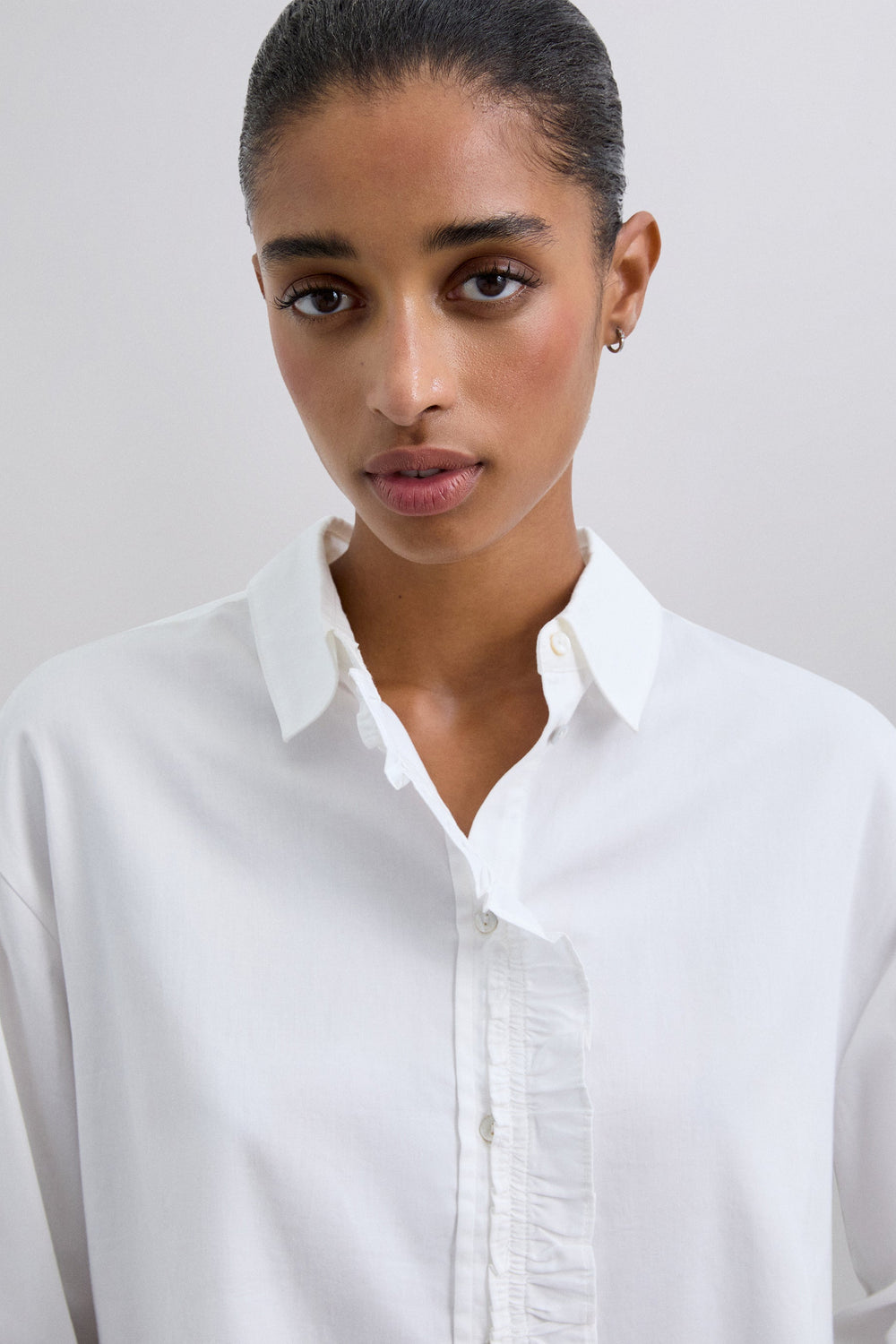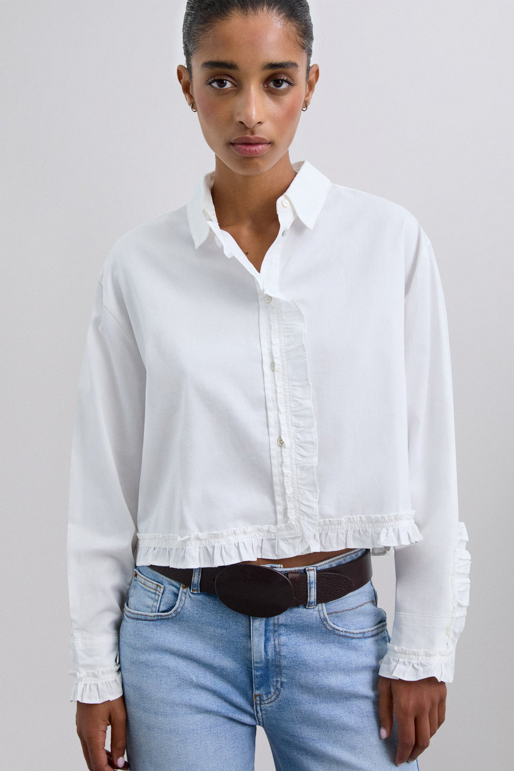 Shirt made of 100% BCI cotton. Cropped. Shirt collar. Gathered detail on the front placket, cuffs and hem. Button fastening. Long sleeves.
