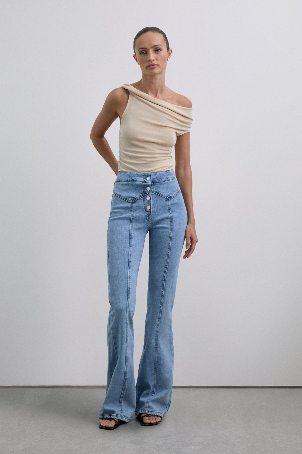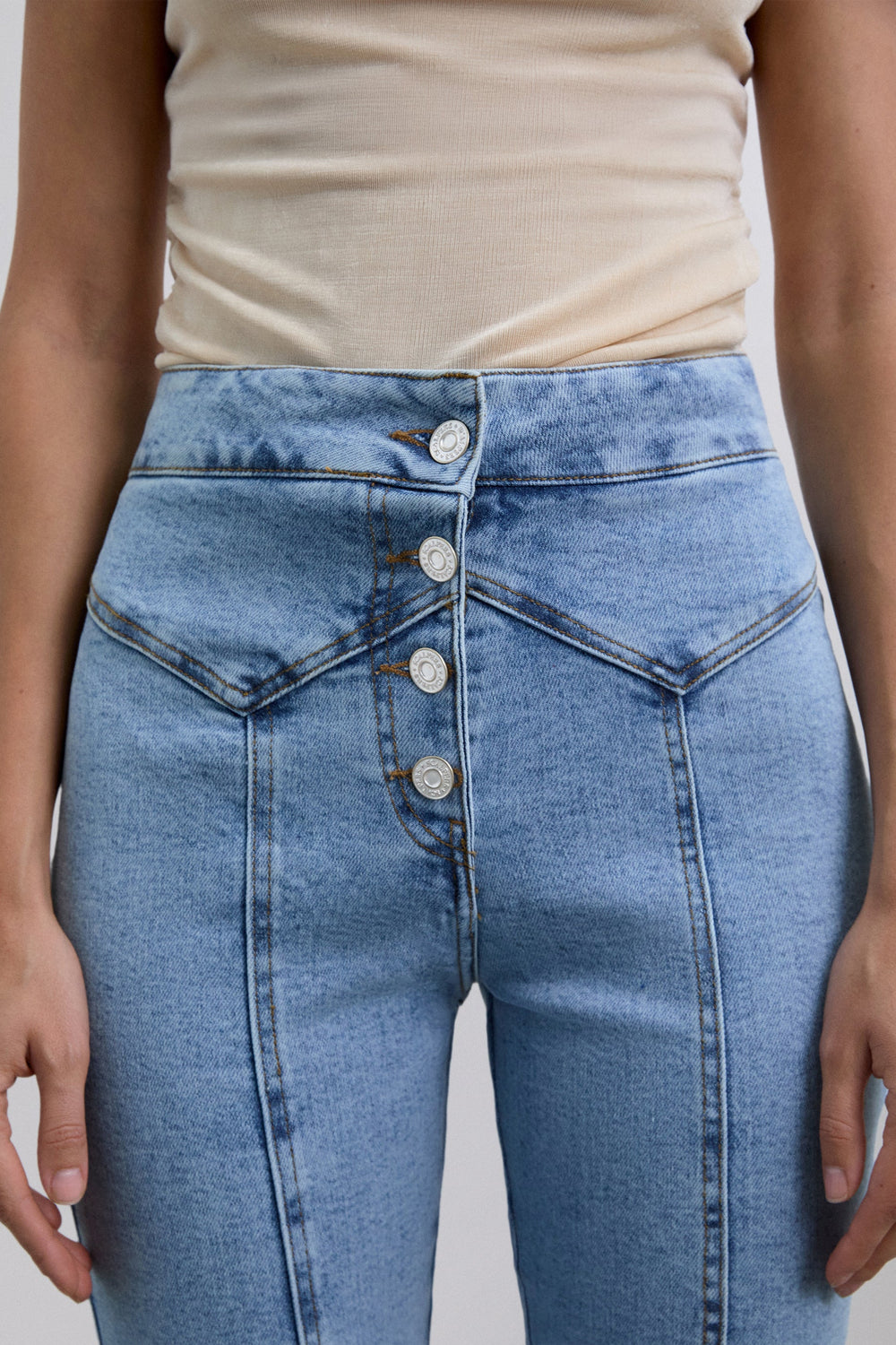 Jeans confeccionados en tejido ligeramente elástico. Slim fit bootcut con tiro alto, cierre con botones y costuras marcadas.
