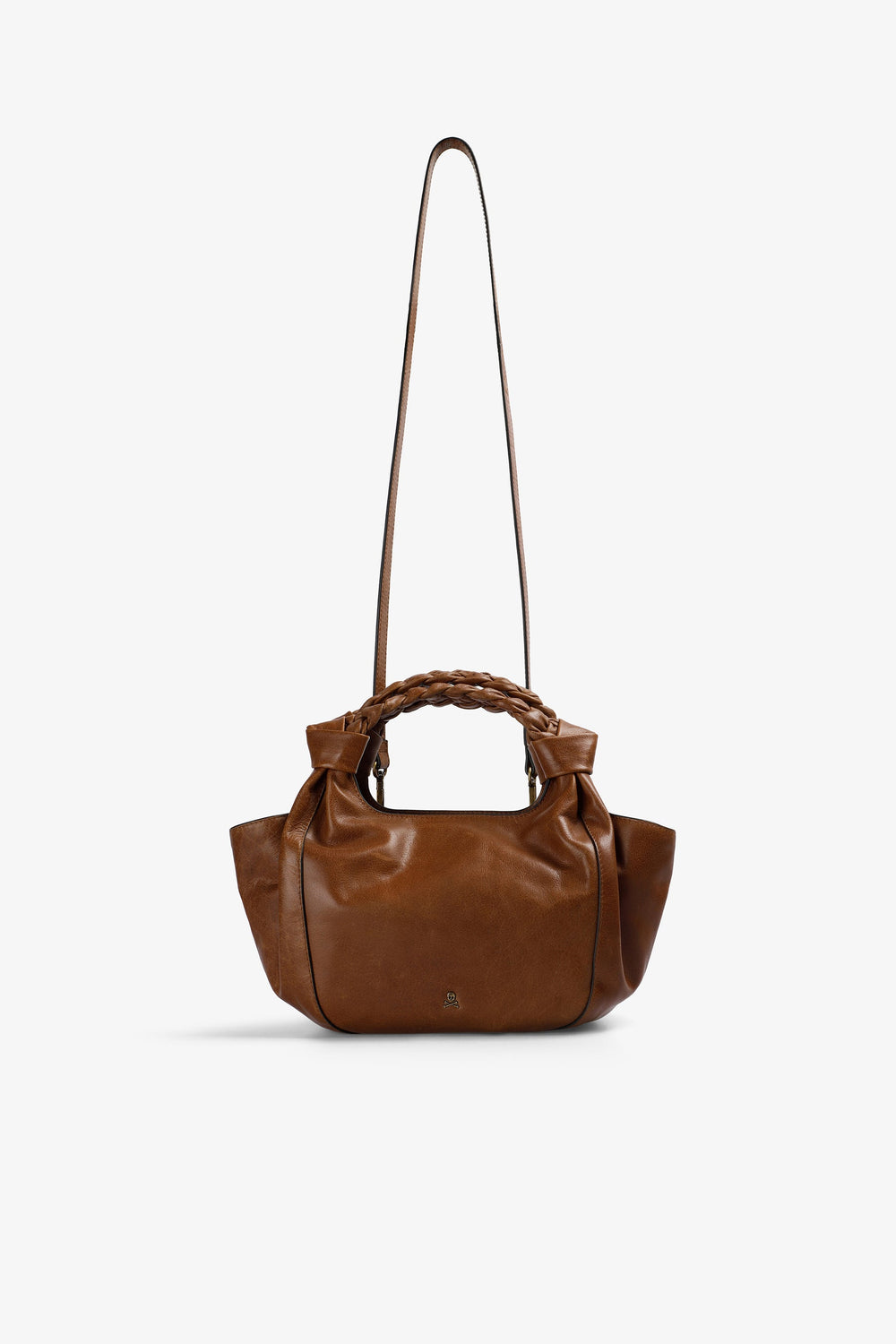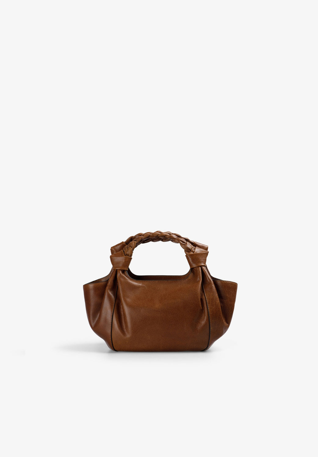 Handbag made of 100% leather with knotted braided handle detail. Lined with inner pocket, zip closure. Metal logo on the front Double handle option.