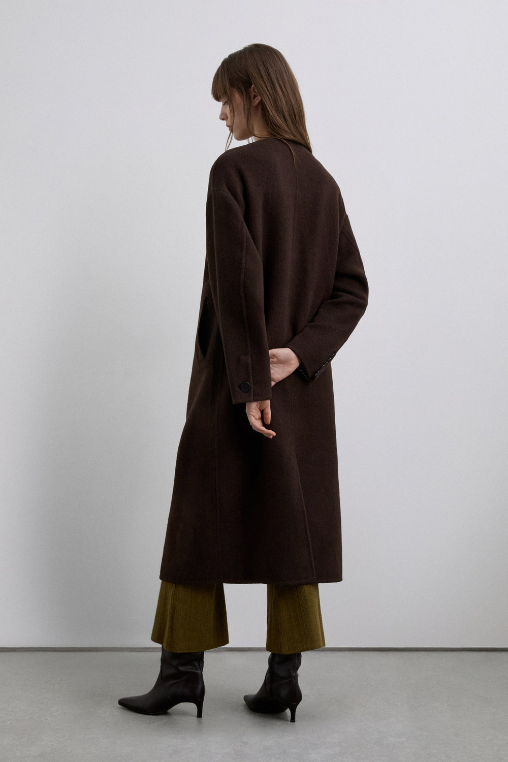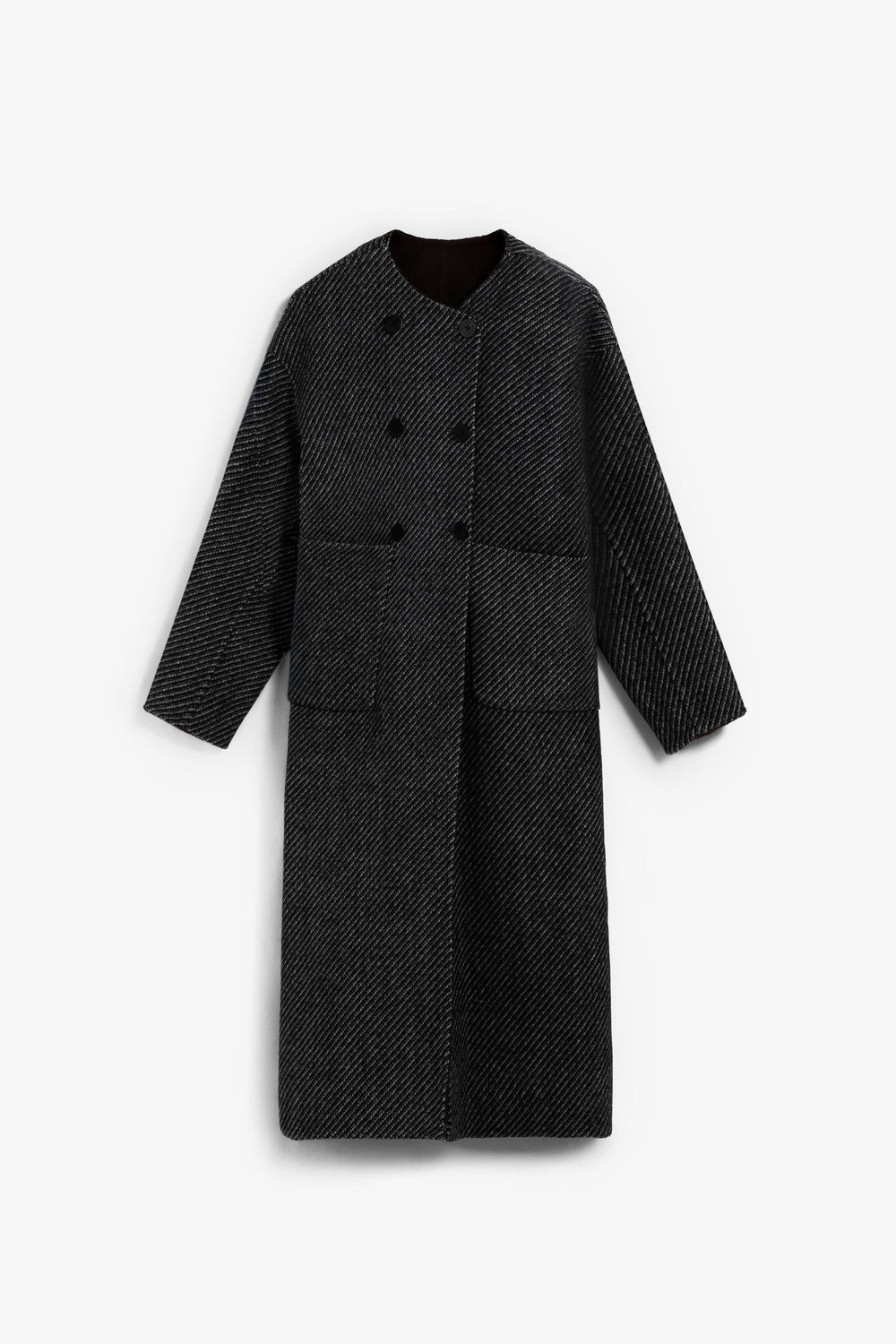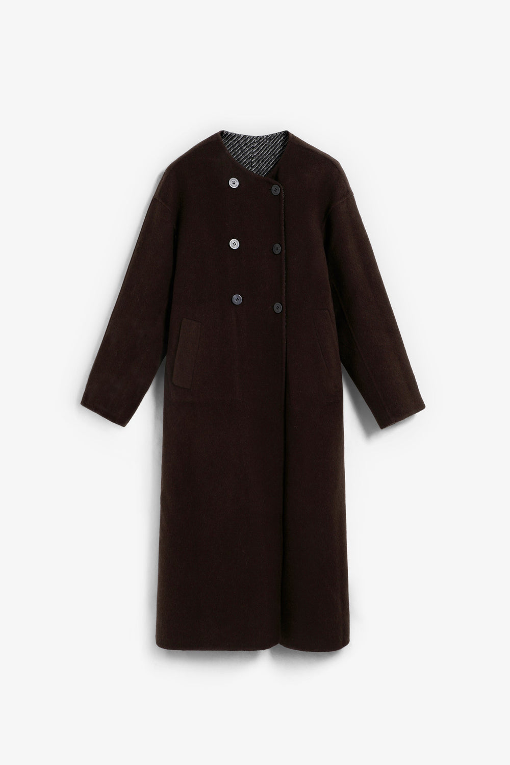 Long coat made of a reversible wool blend. Regular fit. Round collar with no lapels. Grey herringbone print and plain brown options. Patch pockets on the herringbone option and slanted pockets on the plain reverse side.