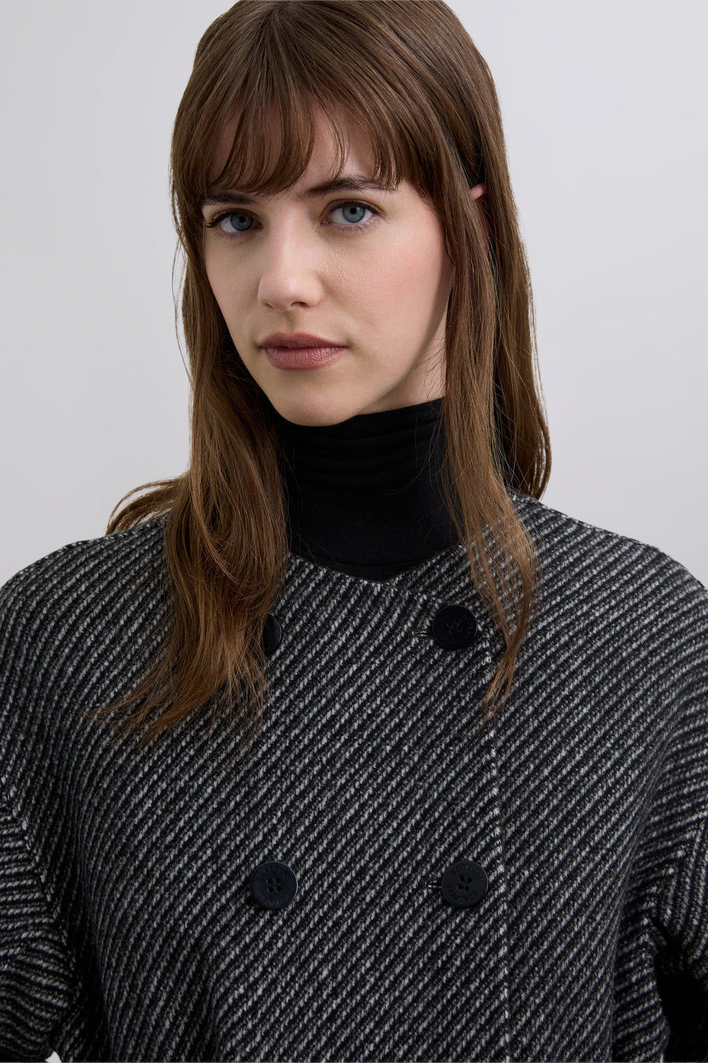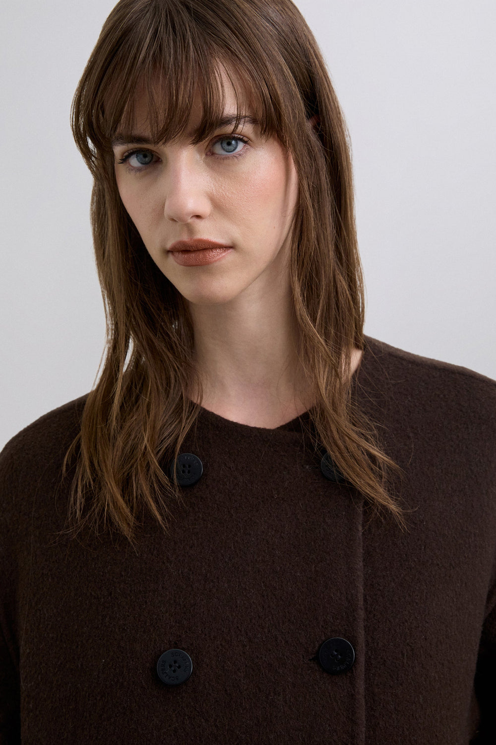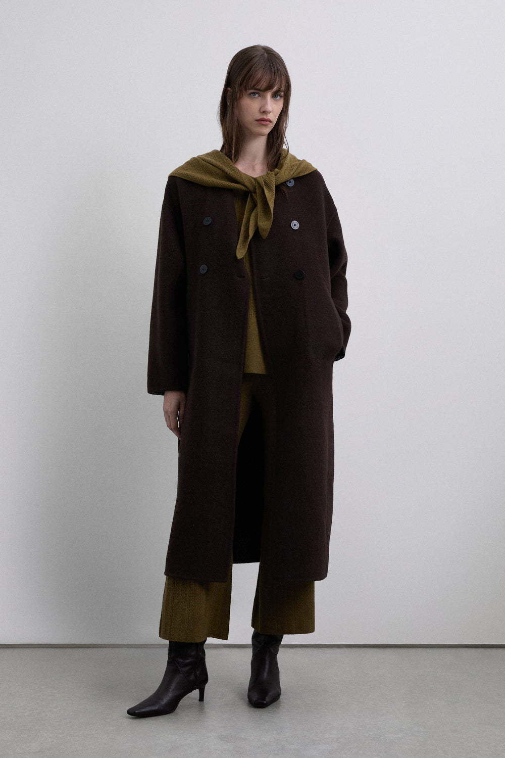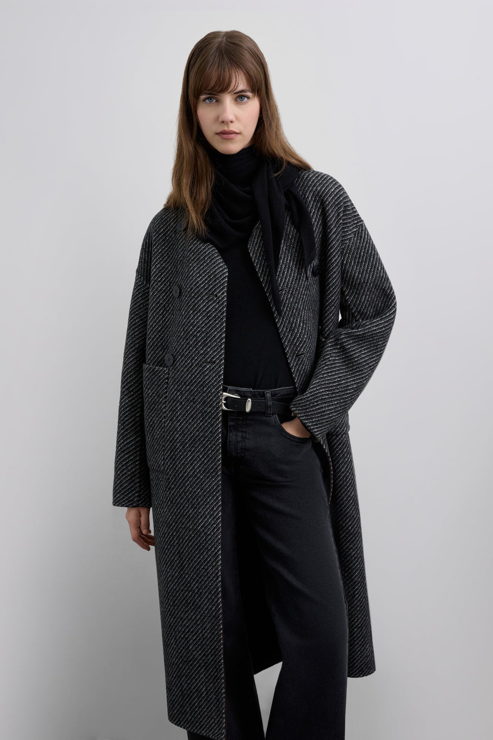 Long coat made of a reversible wool blend. Regular fit. Round collar with no lapels. Grey herringbone print and plain brown options. Patch pockets on the herringbone option and slanted pockets on the plain reverse side.